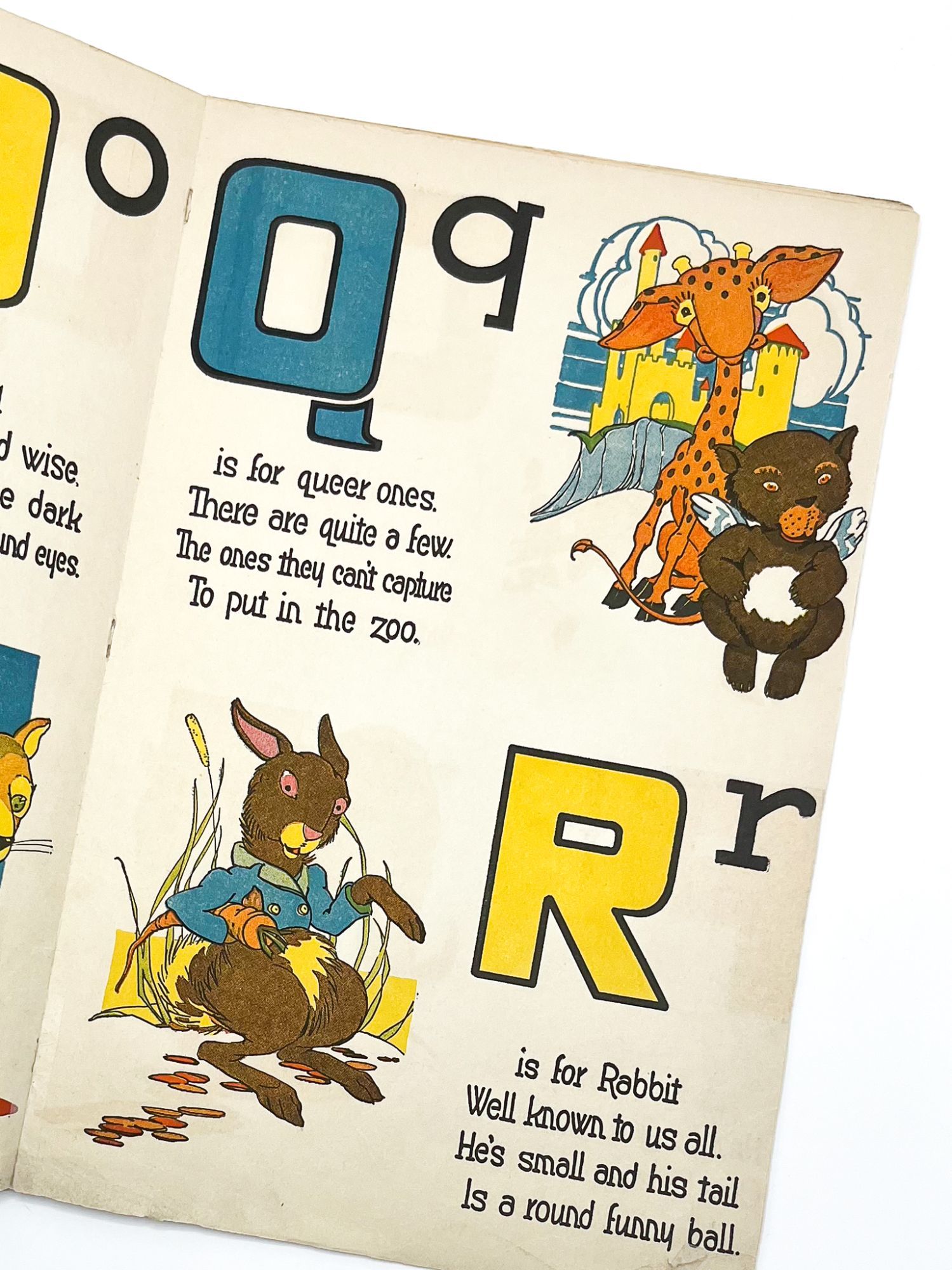 Cleveland and New York: The World Syndicate Publishing Co, 1929. Very good.. First printing of this giant, colorful ABC and counting book, featuring a number of unexpected animals. B is for bear, M is for monkey, and X is, of course, for xeri. This oversized alphabet book with Harrison Cady-esque illustrations makes some fascinating choices when it comes to the animal models for each letter — O is for owl, sure, but Q is for... "queer ones" that "they can't capture to put in the zoo"? C should have been for camp. 14.5'' x 9.75''. Original stiff color pictorial wrapper. Illustrated in color. [16] pages. Wrapper with light edgewear, some wear and infills to spine; several repairs to lower edges. Leaves with tiny closed tears to lower edges, carefully repaired with tape or glue; each gutter reinforced with tape. Colors bright.