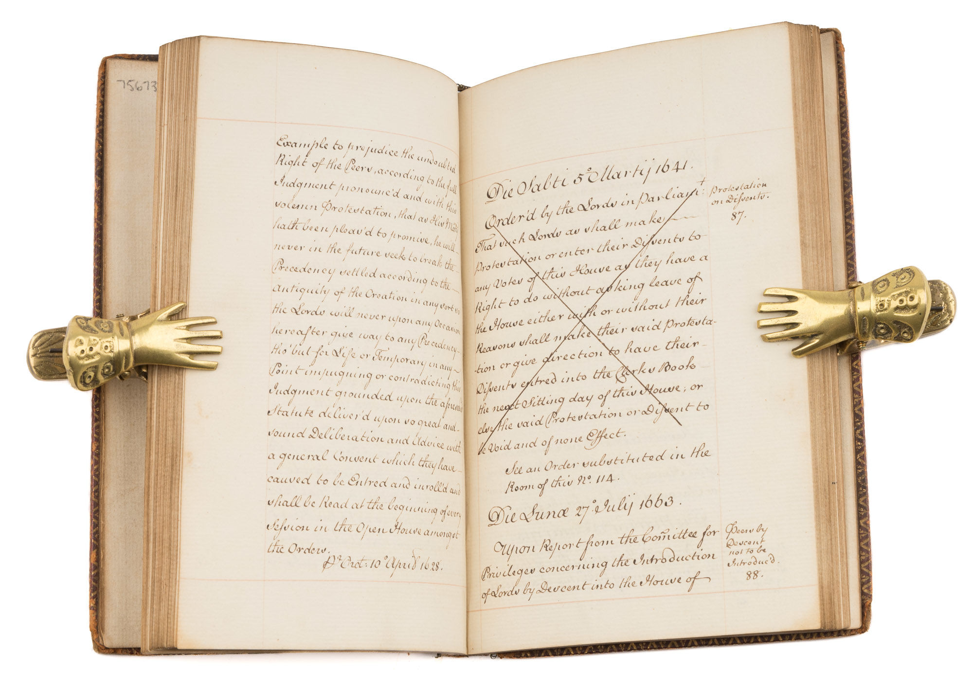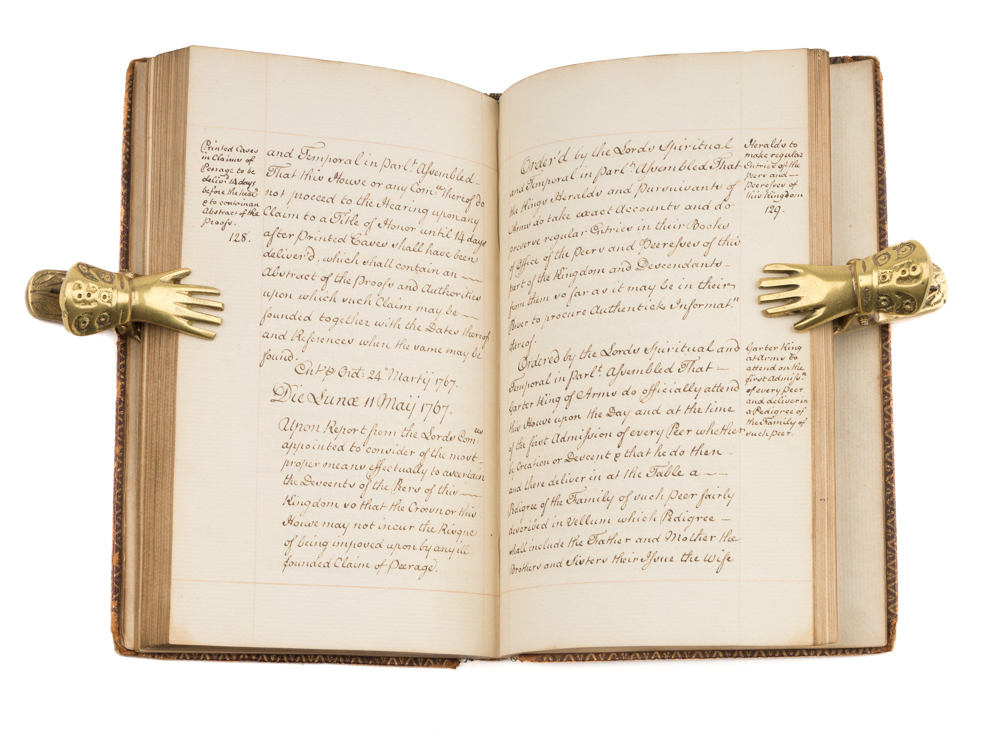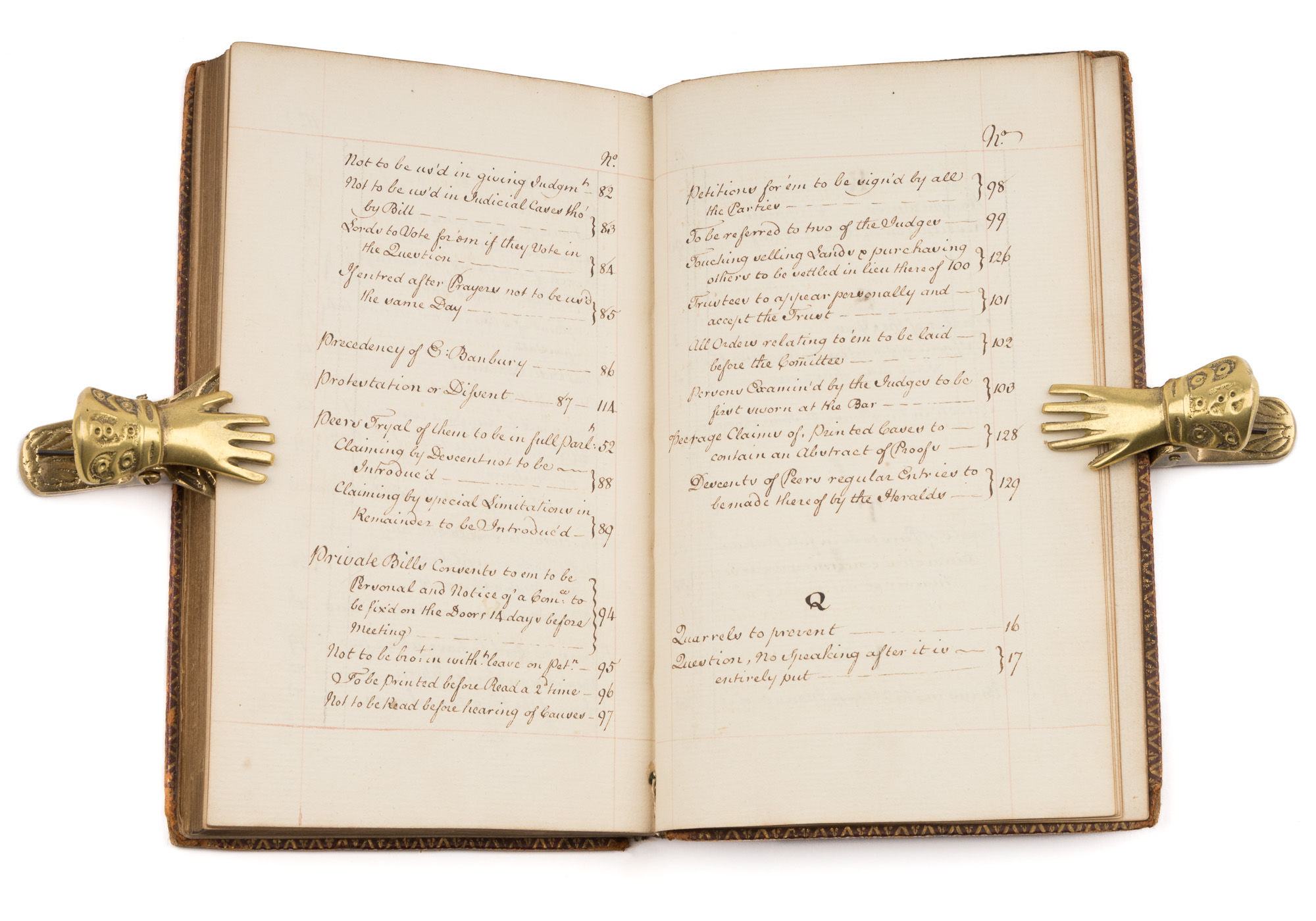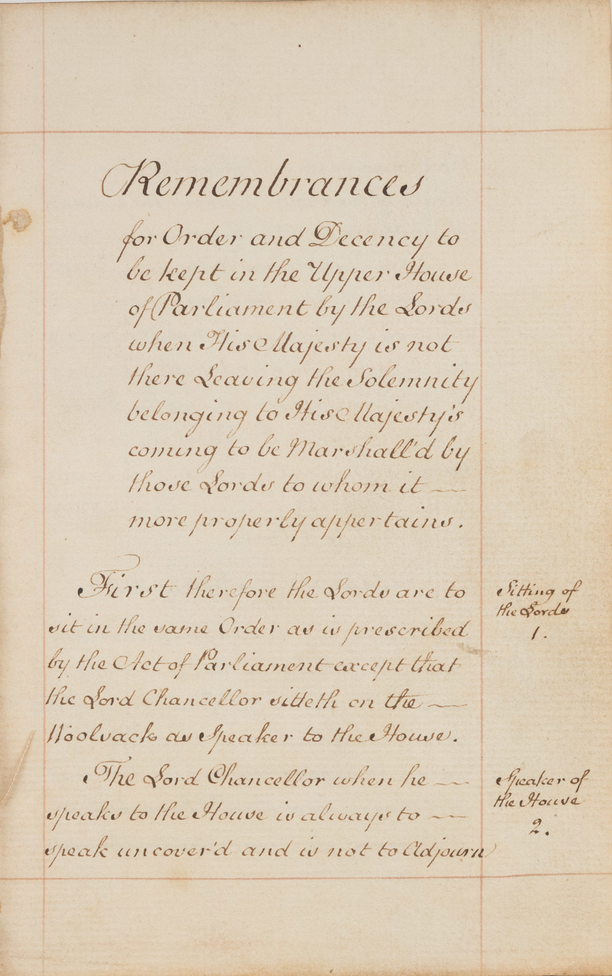 1767. Standing Orders for the House of Lords [Manuscript]. [Parliament]. [GreatBritain]. Remembrances for Order and Decency to be Kept in the Upper House of Parliament by the Lords when His Majesty is Not There Leaving the Solemnity Belonging to His Majesty's Coming to be Marshall'd by Those Lords to Whom it More Properly Appertains. [London]: c.1767. [111] pp., [9] blank, [7] pp. index, [3] blank pp. Octavo (6-3/4" x 4-1/2"; 17.14 x 11.43 cm). Contemporary gilt-paneled morocco, gilt royal arms to boards, gilt library seal to front board, raised bands, gilt decoration and lettering piece to spine, gilt tooling to board edges, gilt dentelles to inner boards, gilt edges, marbled endpapers. Light rubbing and a few minor scuffs to boards, front board detached along with front free endpaper, rear board separating but secured by cords, moderate rubbing to extremities, chipping to spine ends and lettering piece, corners bumped and worn, owner signature of David Murray to verso of front free endpaper. Text with side notes in a single neat hand within red-ruled borders. Light toning to interior, small spots and smudges to a few leaves, internally clean. $650. * These standing orders, listing a variety of regulations for the proceedings of the House of Lords, are dated from June 9, 1660 to May 11, 1767. Topics include appropriate conduct for members when the king is present, procedures for trials of peers and the prevention of quarrels. The orders were read aloud at the beginning of each session, and the clerk produced copies for peers for a fee. Murray [1842-1928] was a Scottish lawyer, antiquarian and bibliophile who amassed one of Scotland's finest private libraries.