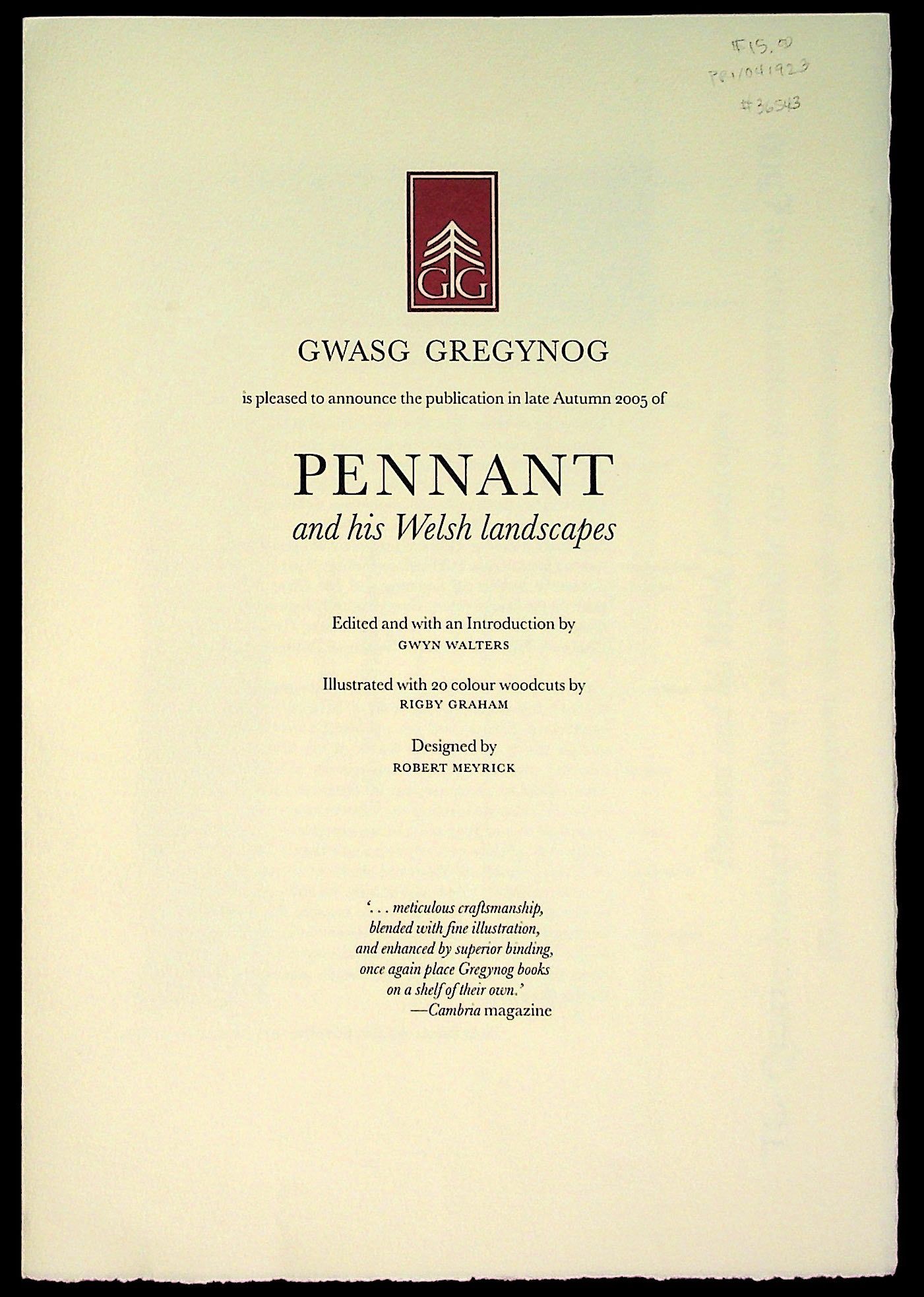 Wales: Gwasg Gregynog, 2005. Fine. A handsome prospectus for the press's Pennant and His Welsh Landscapes. In addition the description of the book and the information about the participants there is a full-page copy of one of Rigby Graham's striking engravings. An order form for the book is inserted. In fine condition. Measures 9.5 x 13.75 inches. PRI/041923.