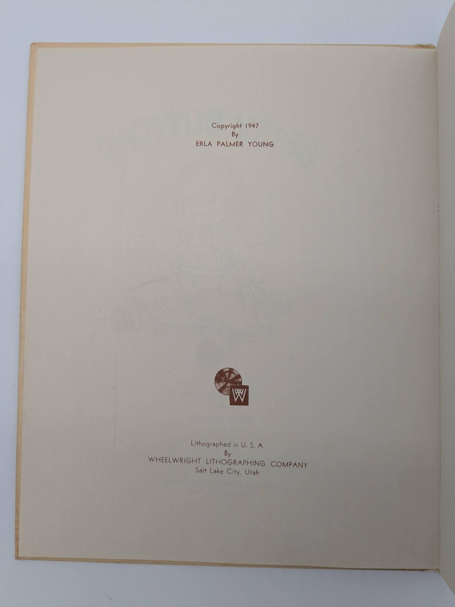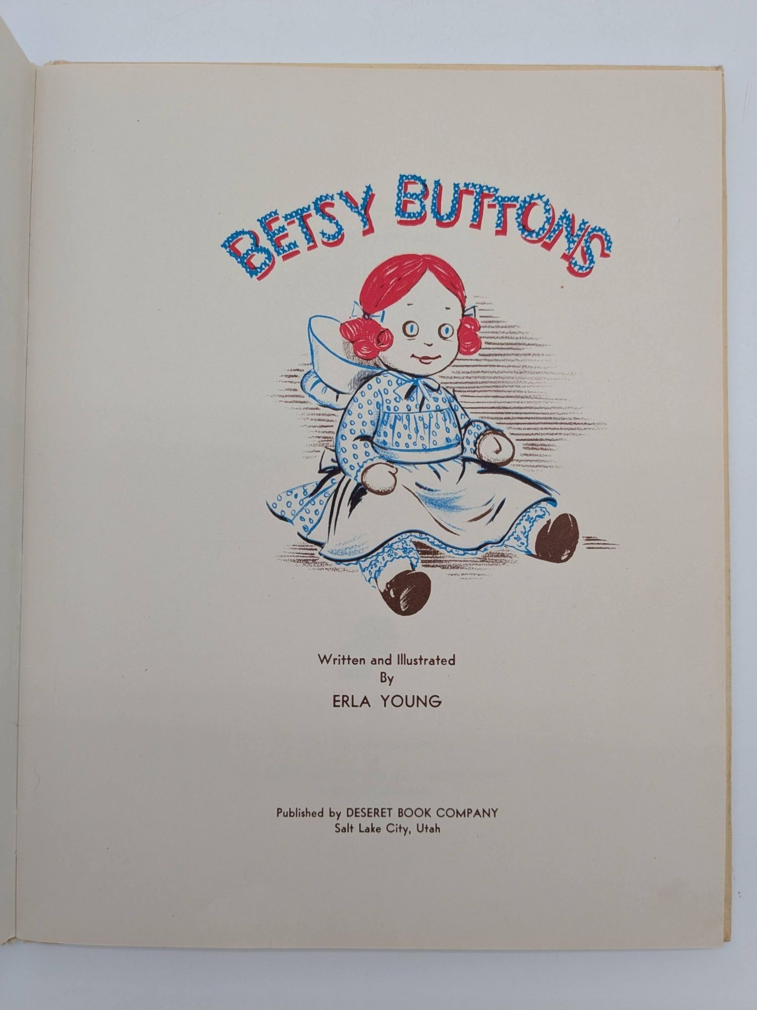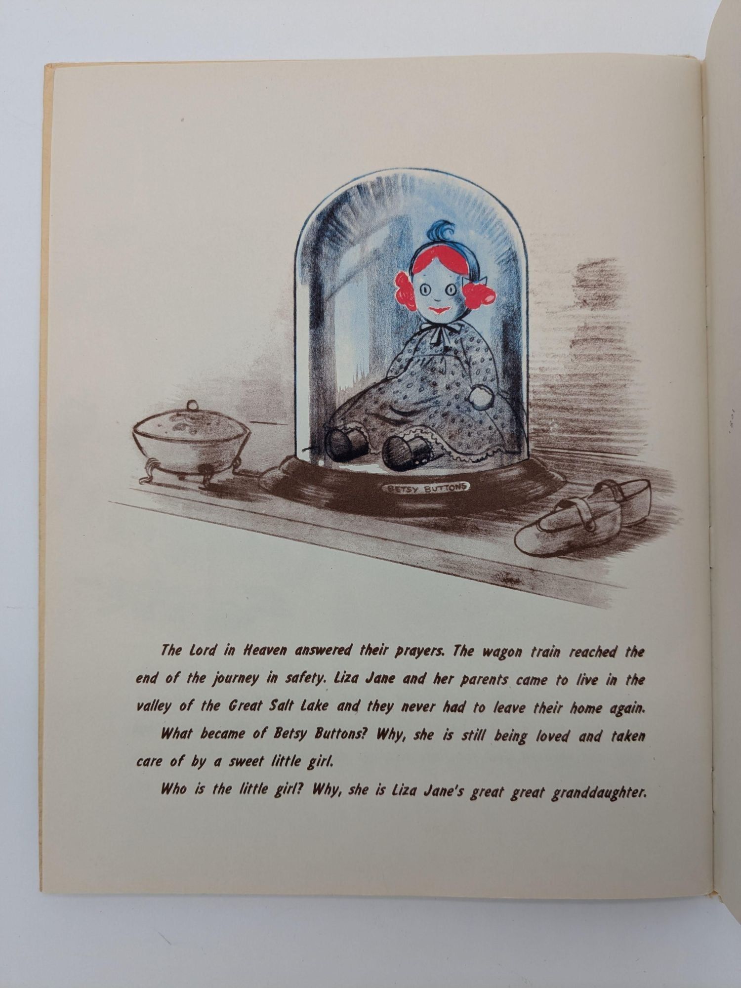 Salt Lake City, UT: Deseret Book Company, 1947. Early printing. Hardcover. Very Good. [28pp]. Slim quarto [26 cm] White, red and blue pictorial paper over boards, with two buttons representing Betsy's eyes on the front board. Blue and white endpapers illustrating "The Route of the Pioneers." The paper of the spine is a bit torn, with the most prominent tearing at the foot. Illustrated by the author. The story of a little girl named Liza Jane and a rag doll named Betsy Buttons, and their trip across the sea to America, and into the Great Salt Lake Valley. Along the way they encounter Indians, bison and other pioneers.