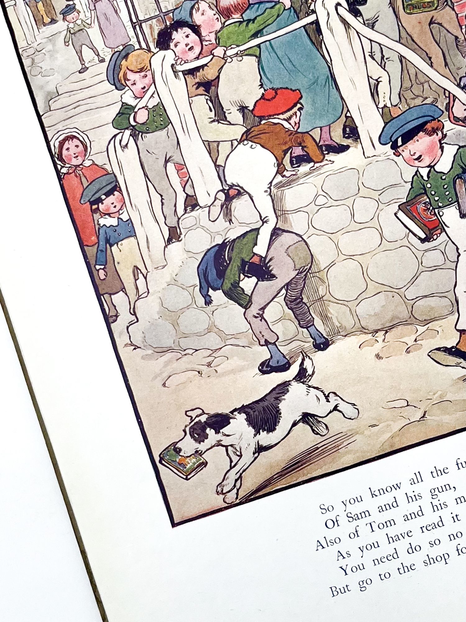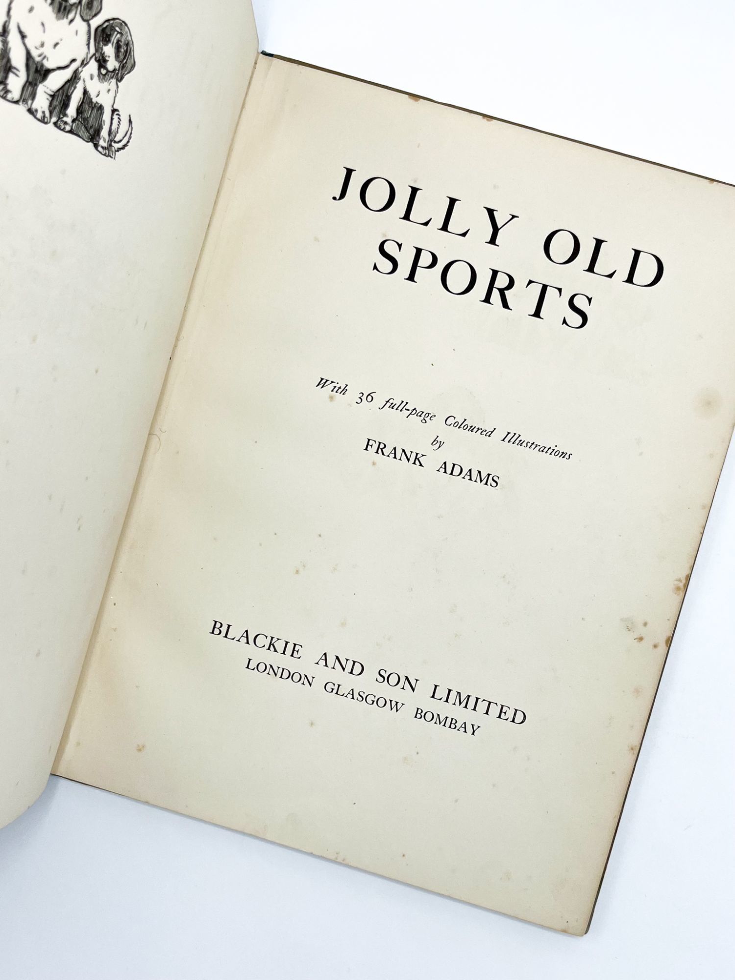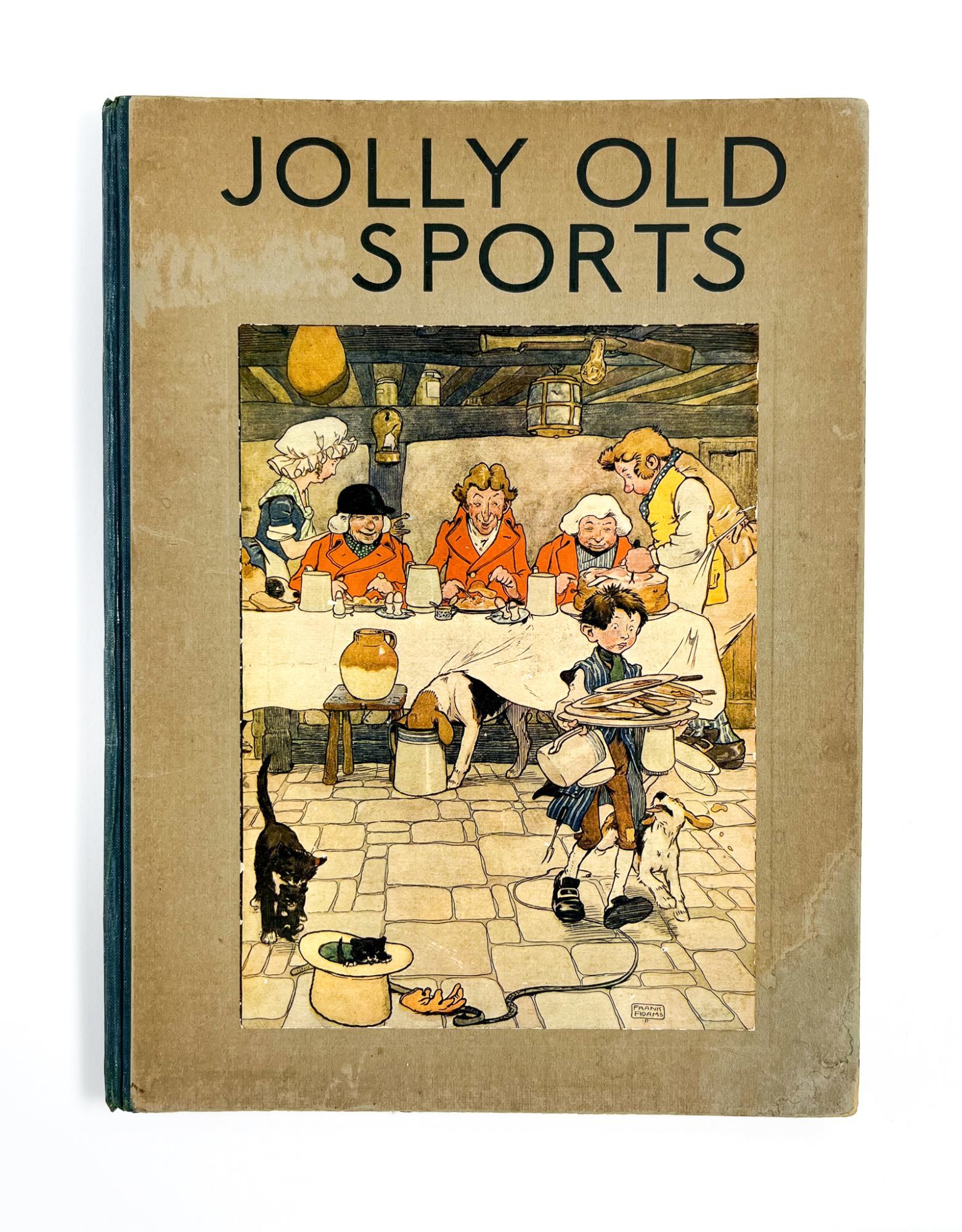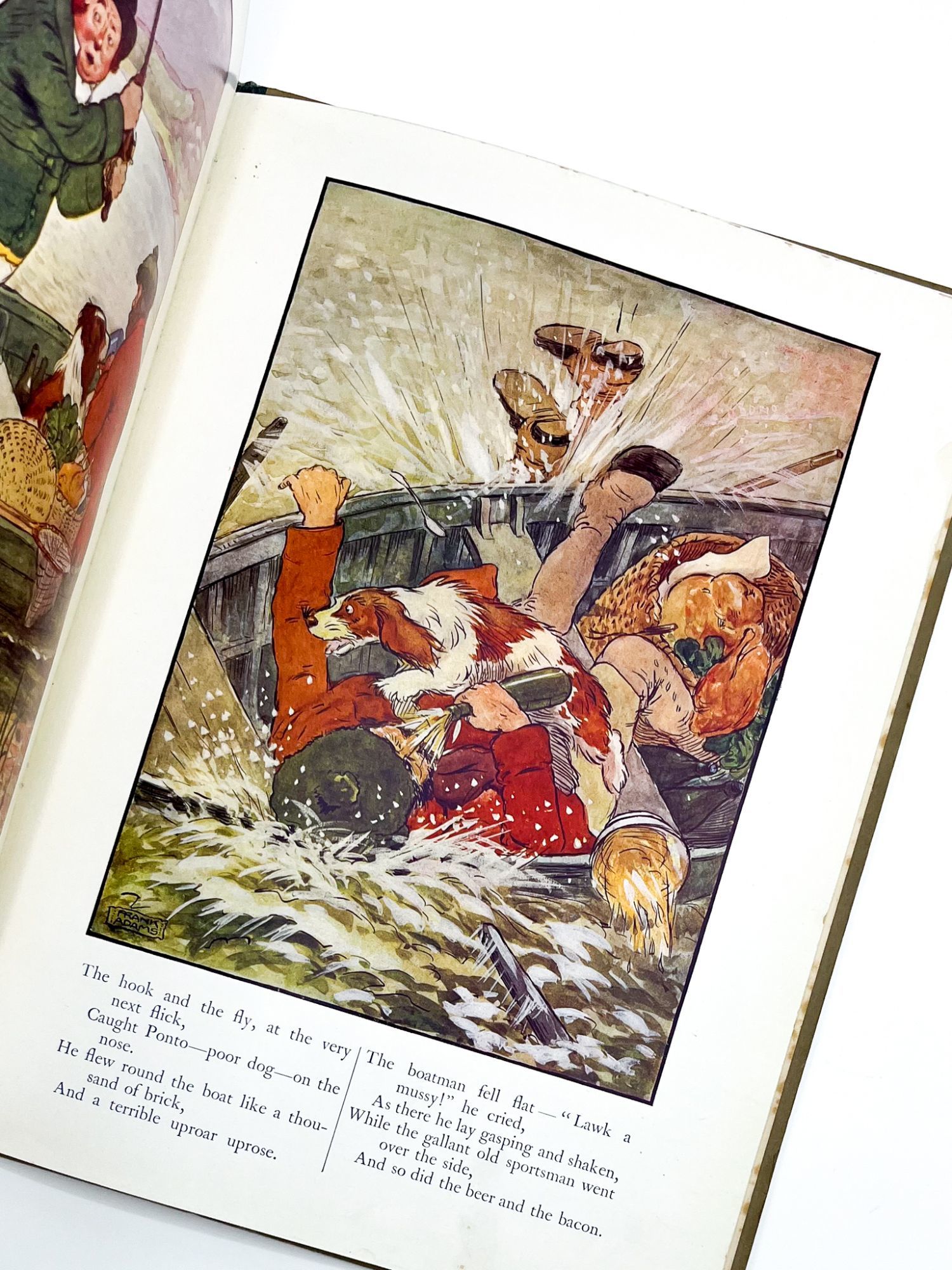 London, Glasgow, Bombay: Blackie and Son Limited, 1915. Very good plus.. First edition of this attractive collection of three humorous rhymes about hunting and fishing, with vibrant illustrations by Frank Adams. Noted for his skill as a landscape painter, Frank Adams gives his amusing illustrations a lush sense of depth, and his cheerful characters are evocative of Cecil Aldin. Containing the rhymes of the Three Jolly Huntsmen; The Little Man and His Gun; and Three Jolly Fisherman. Quite difficult to find in nice condition. 13'' x 9.5''. Original cloth-backed boards with color pictorial paste-on. Illustrated in color. [40] pages. Erased pencil inscription to front flyleaf. Binding with a hint of some glue reinforcement to spine, a bit of rubbing; faint dampstain to lower corners. Endpapers with scattered foxing, leaves with occasional touches of soil. Colors bright.