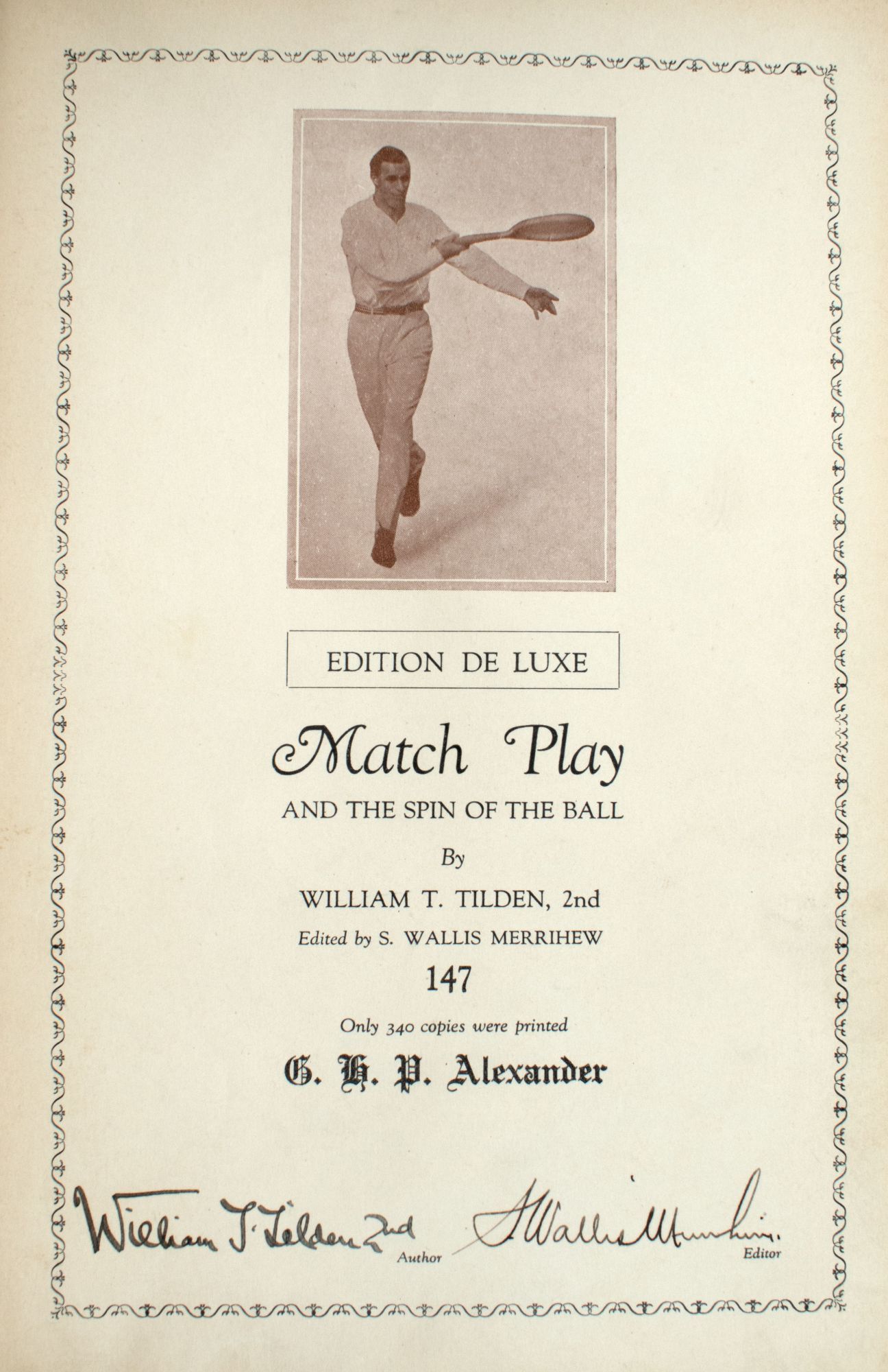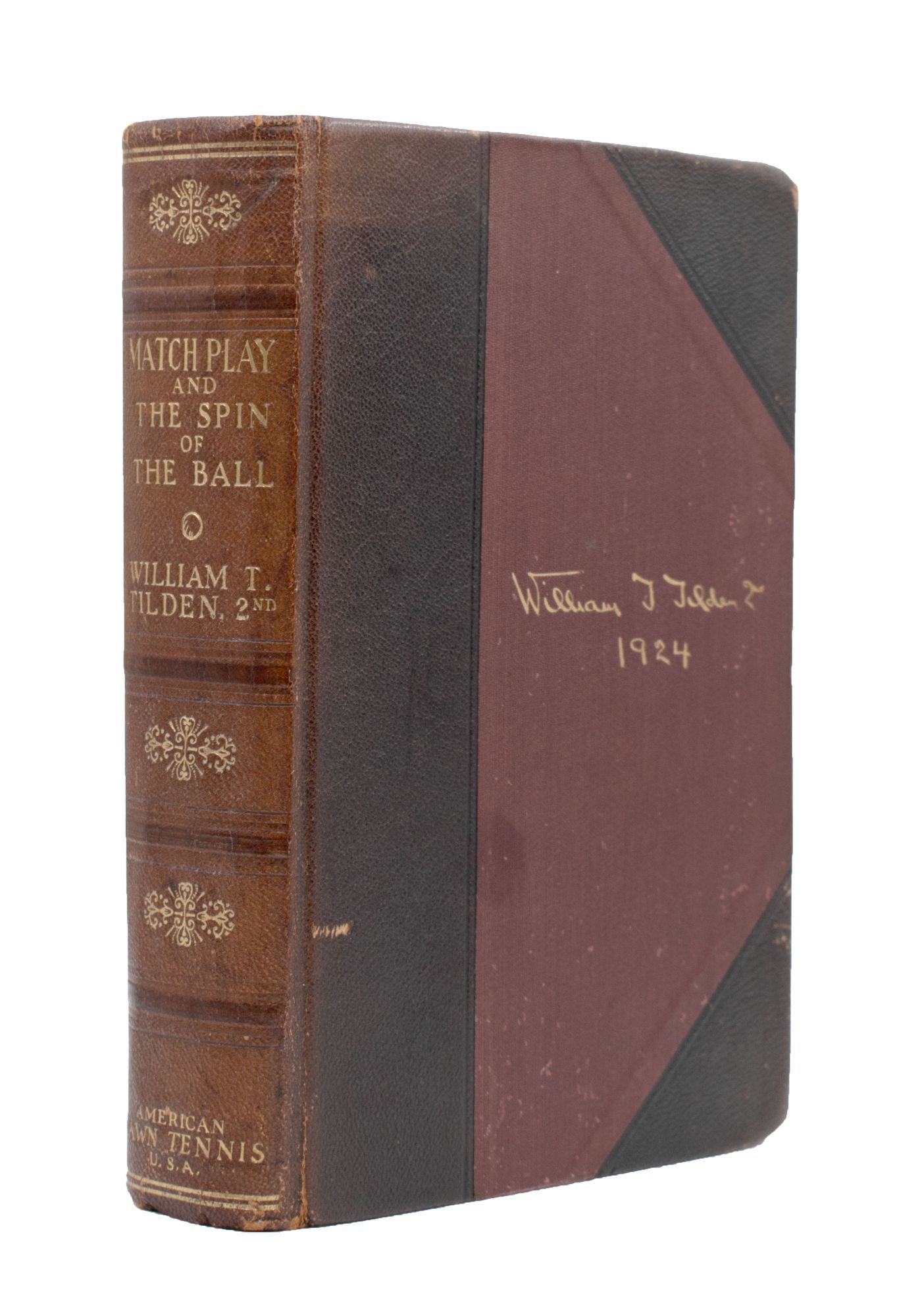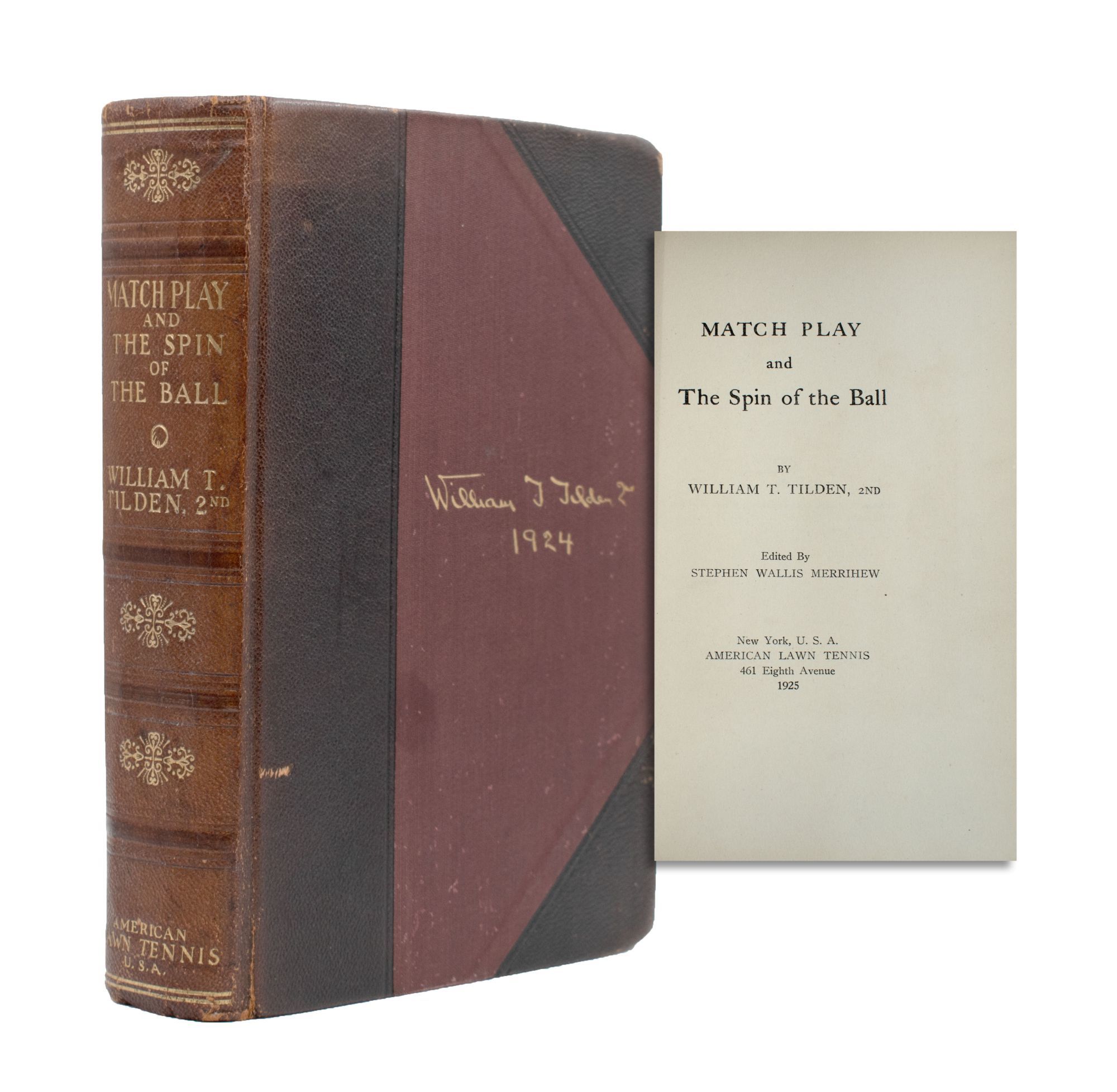 New York: American Lawn Tennis, 1925. No. 147 of 340 copies signed by the author and editor. Frontispiece portrait, numerous illustrations. xxiv, 355 pp. 1 vols. Large 8vo. Publisher’s half brown morocco, t.e.g., others uncut. Text slightly toned opposite illustrations, nice copy, corners bumped. Very good plus. No. 147 of 340 copies signed by the author and editor. Frontispiece portrait, numerous illustrations. xxiv, 355 pp. 1 vols. Large 8vo. A classic of American tennis.