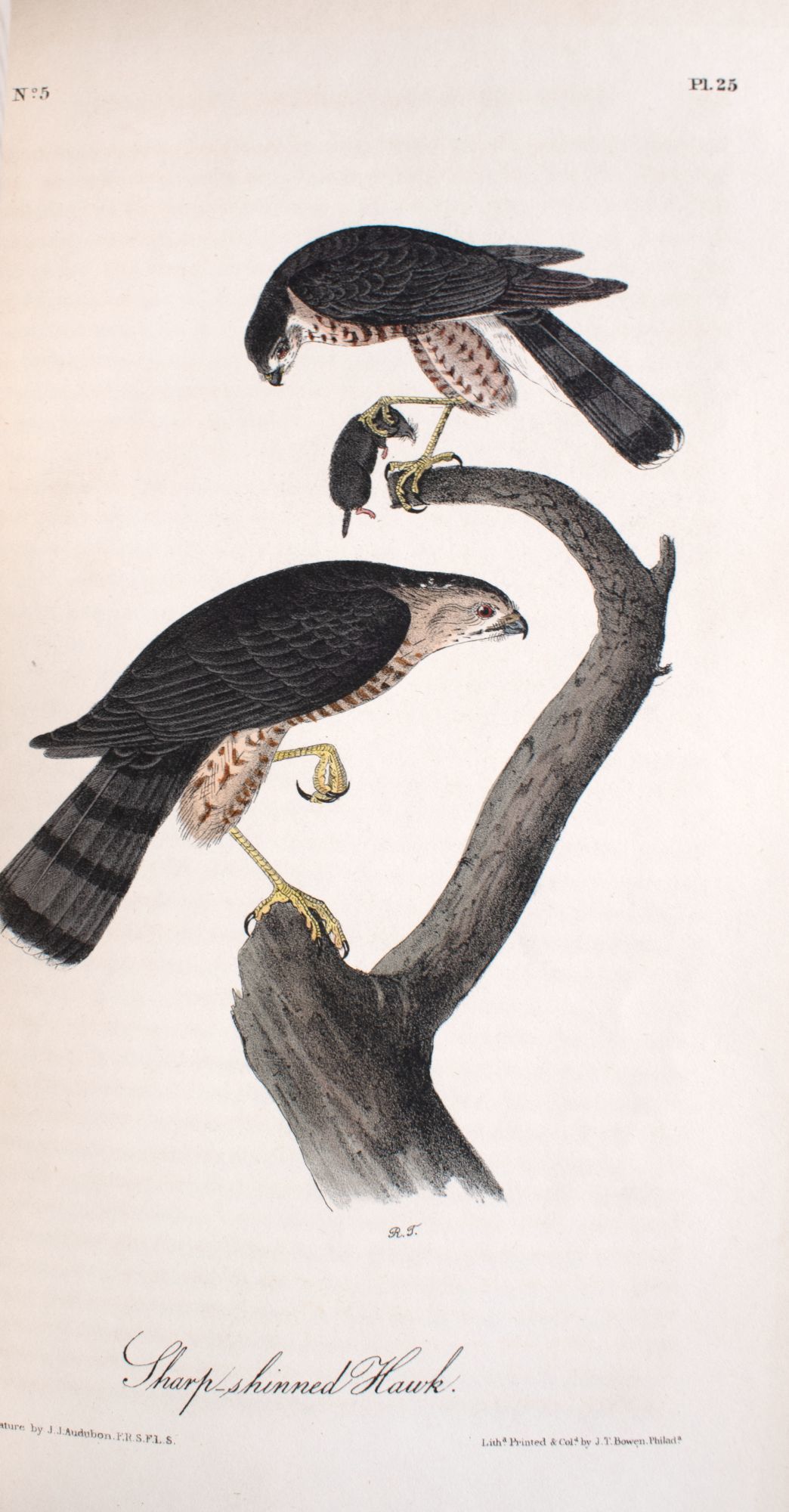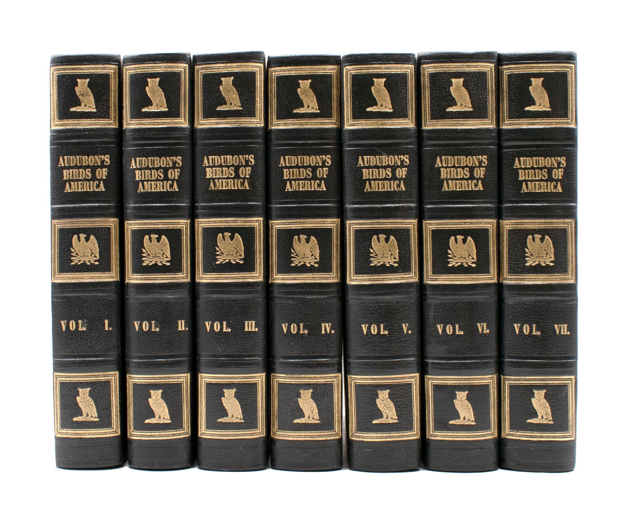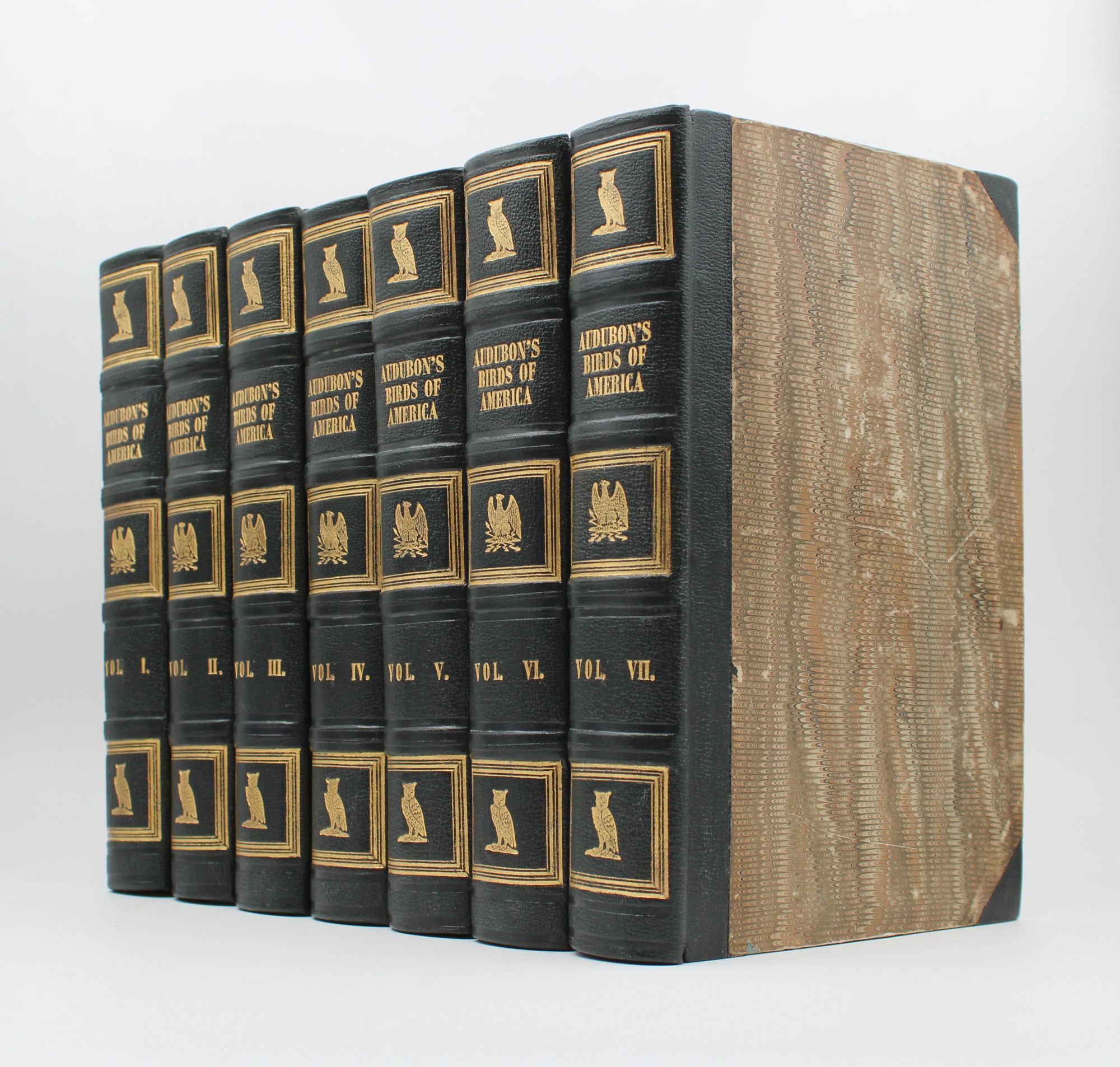 New York & Philadelphia: J. J. Audubon and [vols. I–V] J. B. Chevalier, 1839. First octavo edition. 500 hand-coloured lithographic plates after Audubon by W. E. Hitchcock, R. Trembley and others, printed by J. T. Bowen of Philadelphia (plates 1–135, 151–500) or George Endicott of New York (plates 136–150), numerous wood-engraved anatomical figures in text. 7 vols. Royal octavo (250 x 147 mm). Recently rebound to style in black half morocco, gilt panelled spines with owl and eagle motifs, contemporary marbled sides, speckled edges, endleaves renewed. A few plates trimmed by the binder with concomitant shaving of a few captions (encroaching on the plate itself in only one instance). An excellent set. First octavo edition. 500 hand-coloured lithographic plates after Audubon by W. E. Hitchcock, R. Trembley and others, printed by J. T. Bowen of Philadelphia (plates 1–135, 151–500) or George Endicott of New York (plates 136–150), numerous wood-engraved anatomical figures in text. 7 vols. Royal octavo (250 x 147 mm). First octavo edition of Audubon's “Great National Work,” the first complete edition and the first American edition; the original double-elephant folio was published in Edinburgh and London between 1827 and 1838. A very handsome set, the plates clean and fresh, of the “most beautiful, popular, and important natural history books published in America in the nineteenth century... representing the best of pre-Civil War American lithography and giving Audubon the opportunity finally to display his scholarship and genius to a large American audience for the first time” (Ron Tyler).