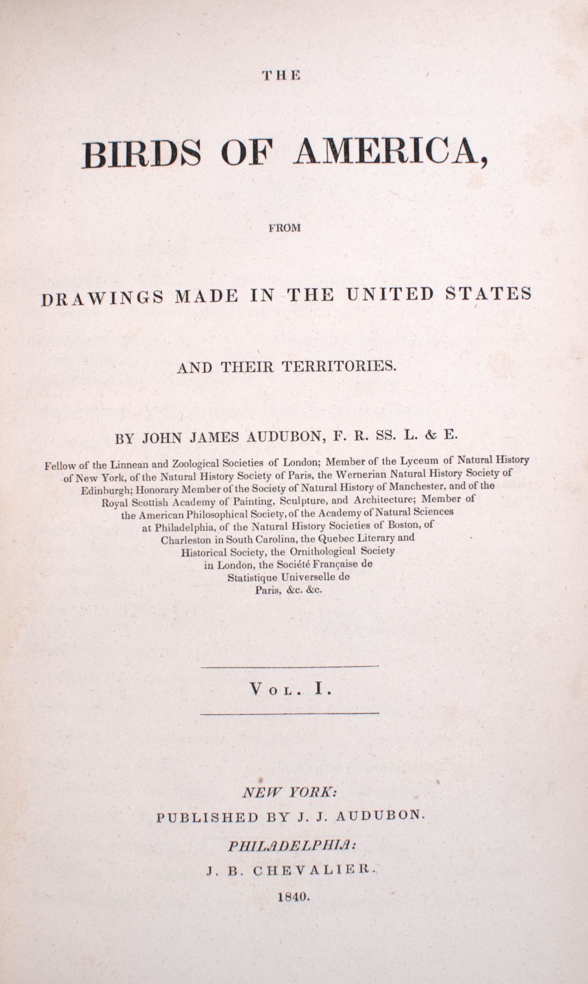 The first edition of the octavo work now represents the only realistic opportunity that exists for private collectors to own an entire collection of Audubon images in a form that was overseen and approved by the great artist himself. Bennett p. 5; Nissen IVB 51; Ripley 13; Sabin 2364; Zimmer p. 22. Ron Tyler, Audubon's Great National Work (1993) Appendix I