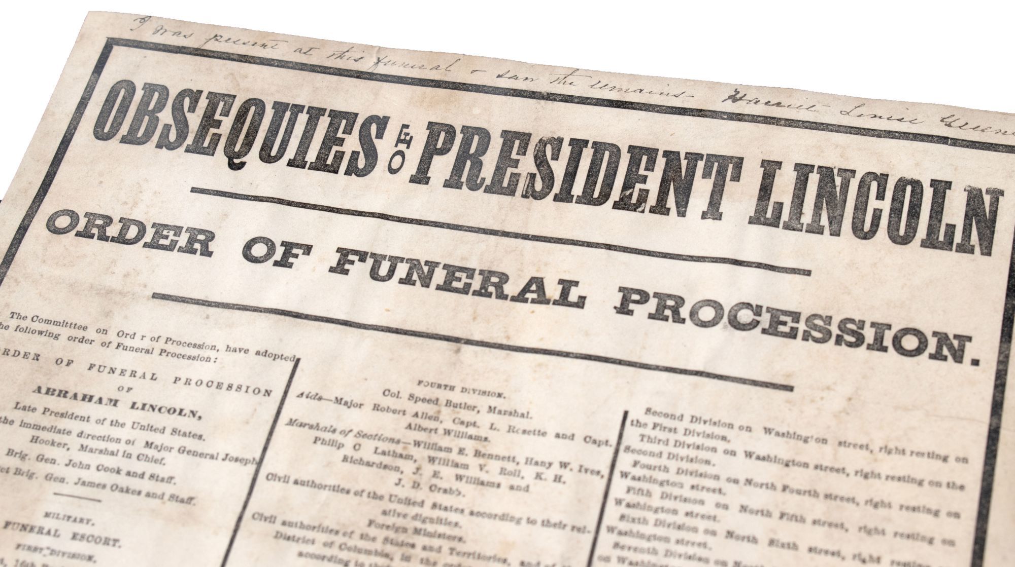 [Springfield, IL], 1865. Broadside, text in three columns, mourning borders. Early manuscript note signed by Harriet Louise Greene in the upper margin "I was present at the funeral & saw the remains". 10-3/4 x 7-3/4 inches. Paper-backed at an early date, with early newspaper clippings mounted on verso. Broadside, text in three columns, mourning borders. Early manuscript note signed by Harriet Louise Greene in the upper margin "I was present at the funeral & saw the remains". 10-3/4 x 7-3/4 inches. President Lincoln was assassinated on April 15, 1865. His body lay in state in the White House on April 18 and a ceremonial funeral service took place in Washington, D.C. around noon on April 19. Two days later, President Lincoln's casket was loaded on a funeral train headed for Springfield, Illinois, stopping at Baltimore, Harrisburg, Philadelphia, New York City, Albany, Buffalo, Cleveland, Columbus, Indianapolis, Michigan City, and Chicago before arriving in Lincoln's adopted hometown early on the morning of May 3.