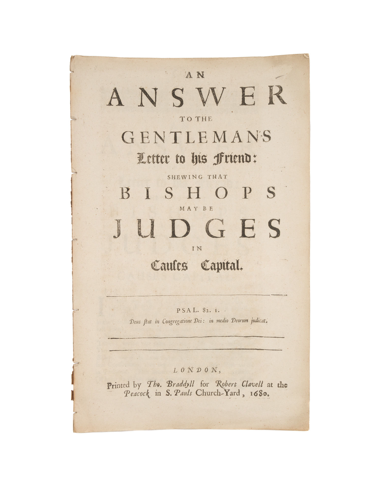 1680. Bishops Can be Judges in Capital Cases [Womock, Laurence (1612-1685)]. An Answer to the Gentleman's Letter to his Friend: Shewing that Bishops May be Judges in Causes Capital. London: Printed by Tho. Braddyll for Robert Clavell, 1680. [ii], 21, [1] pp. Folio (12" x 7-1/2"). Disbound. Light toning, light foxing and soiling to a few leaves, early manuscript correction to p. 5. $75. * Issued as part of Two Treatises (London, 1680) and not published separately. A reply to Denzil Hollis's Letter of a Gentleman to His Friend (1679), which argued that bishops sitting as members of the House of Lords should not be allowed to take part in capital cases because they would not be allowed to apply the death penalty if they were judges in ecclesiastical courts. Womock disagrees and advocates for the authority of the bishops. English Short-Title Catalogue R34097.