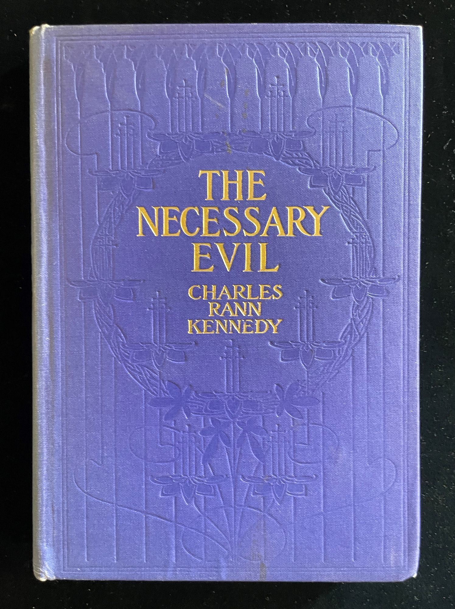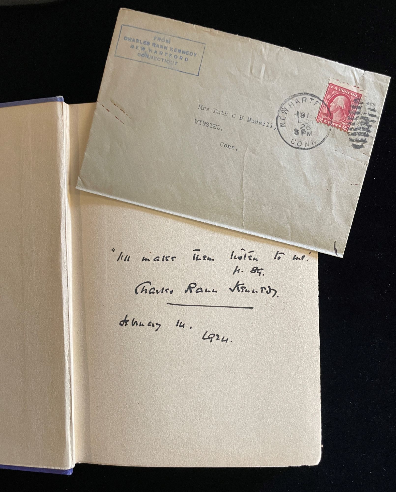 NY: Harper& Brothers, 1908. 1st Edition. Hardcover. Near Fine. First edition, 8vo, purplish, patterned cloth front and spine with gil titles, 111p. Inscribed with a quote from the play) by playwright on the ffe: " " 'I'll make them lsiten to me' p. 89 charles Rann Kennedy February 14, 1924" "No one knows what chance leap may come his way upon the death of (indecipherable). Charles Rann kennedy Febraury 24, 1924" The drama was a one-act stage play for four persons "to be played in the light. Spine slightly faded. Charles Rann Kennedy (18711950), was a playwright and actor who married actress Edith Wynne Matthison. Laid in is cancelled mailing envelope with Kennedy's return address in New Hartford Conn in the upper right corner.