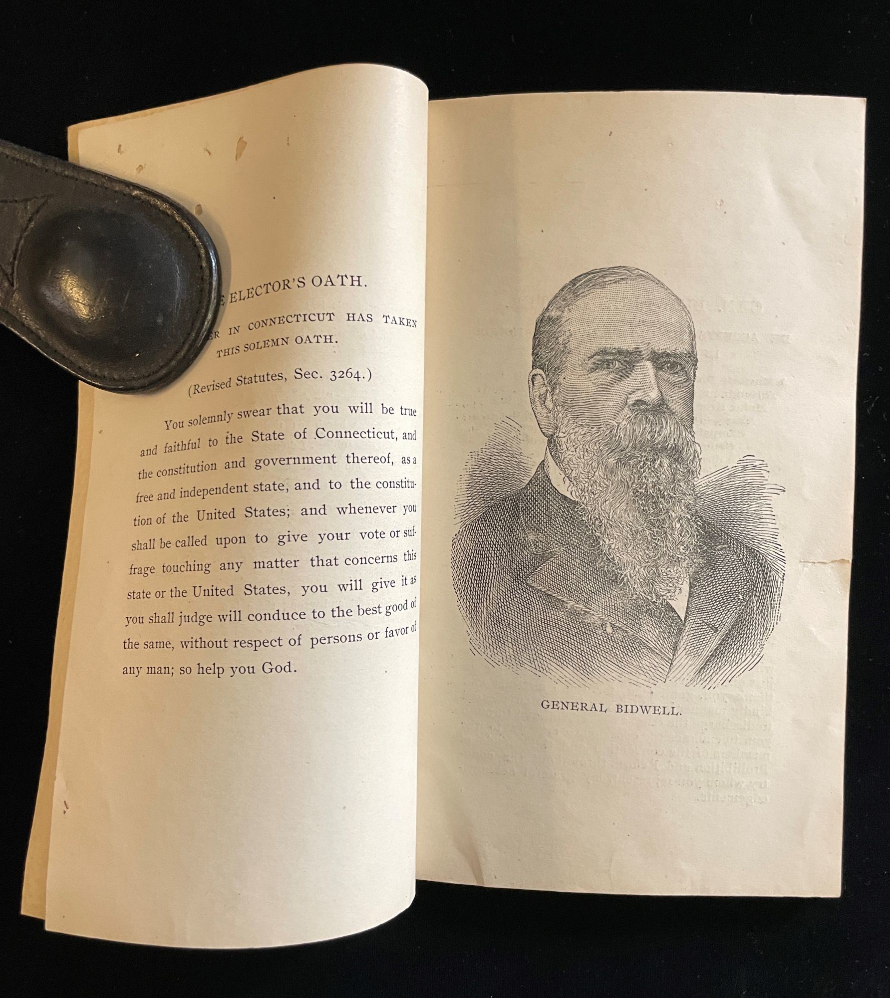 Hartford: Press of New England Home, 1892. 1st Edition. Soft cover. Near Fine. Scarce 1892 campaign booklet for the Prohibition Party's Presidential candidate General John Bidwell, its Vice Presidential candidate James Cranfill, electors at large, congressional candidates and canddiates for Connecticut Governor, Ltnt Giovernor. Secretary of State and other state officers - all temperance advocates. Mustard textured paper covers, titles printed in black, measures approx 4.5x 7.5", 58pages, with acceptance speech of Bidwell and full biographies and images from plates of all candidates. In the election of 1892, the Prohibition Party came in 4th place, with about 2% of the national vote. OCLC lists no library holdings with this specific title, though a search for it by title reveals that one library -Yale - sources "[Collection of late 19th century minor political pamphlets]" dated 1892, but we cannot confirm if this title is among them.