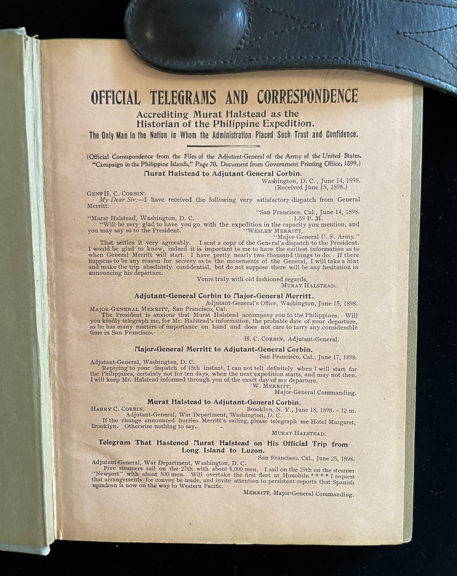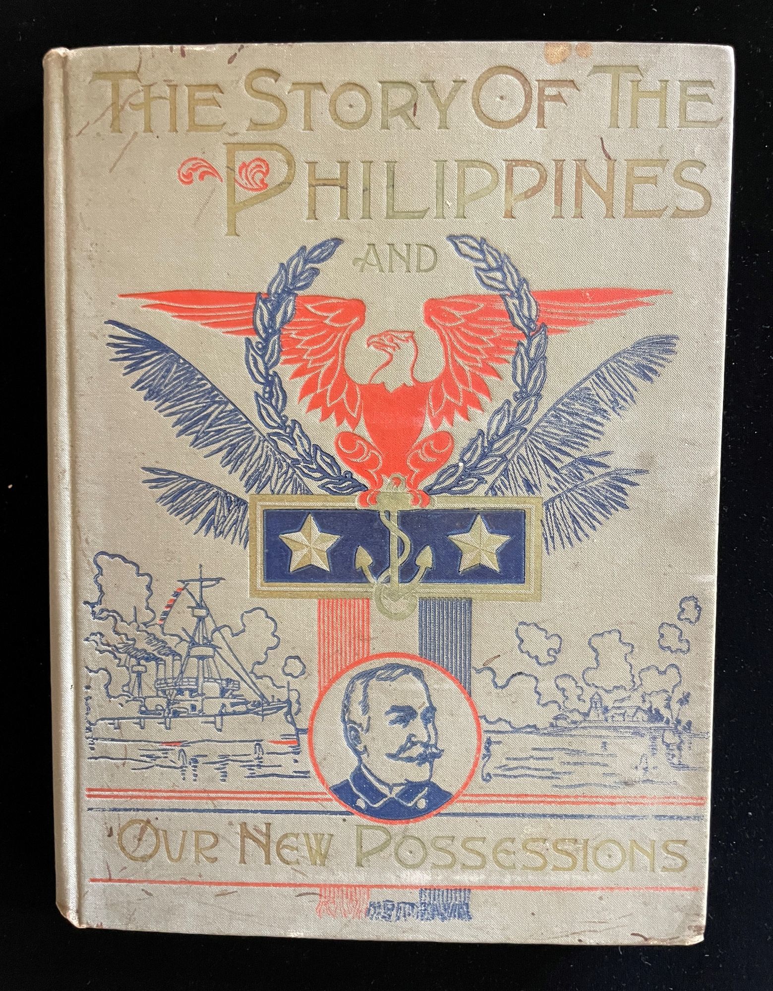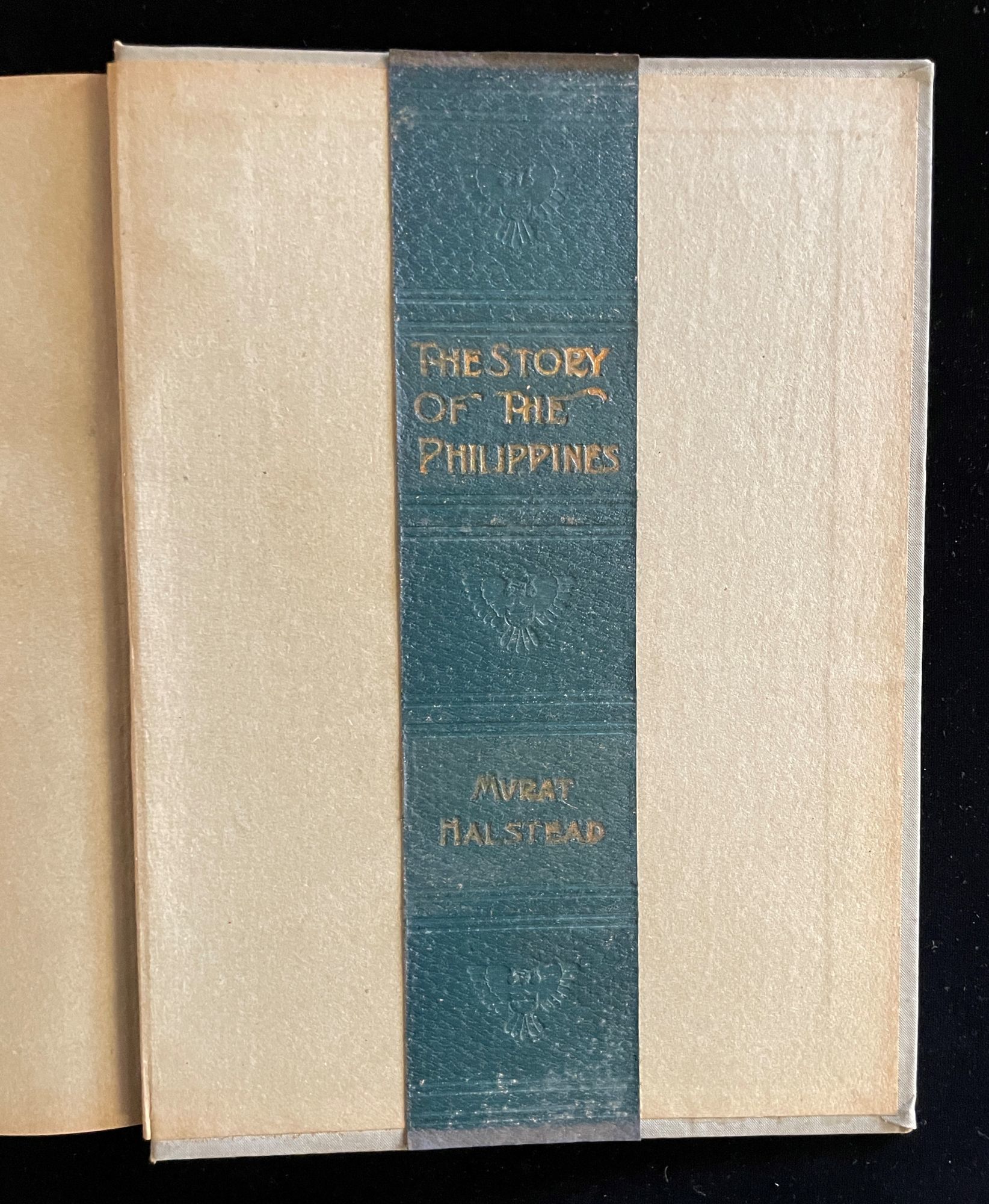 Chicago: H. L. Barber, 1898. 1st Edition. Hardcover. Very Good -. Salesman dummy. 8vo, gray cloth, pictorial stamped in red and blue and titles in gilt. Sample pages, random page runs up to page 406, plus 6 pages of promotional materials in rear and blank subscription page. With lots of full page b&w photographs. Rear pastedown has binding sample of the backstrip in green, faux leather sample with gilt title. Book moderately soiled, some loss to stamped colors. Tipped in at front pastedown are testimonials acknowledging author Halstead as legitimate historian of the Philippine Expedition.