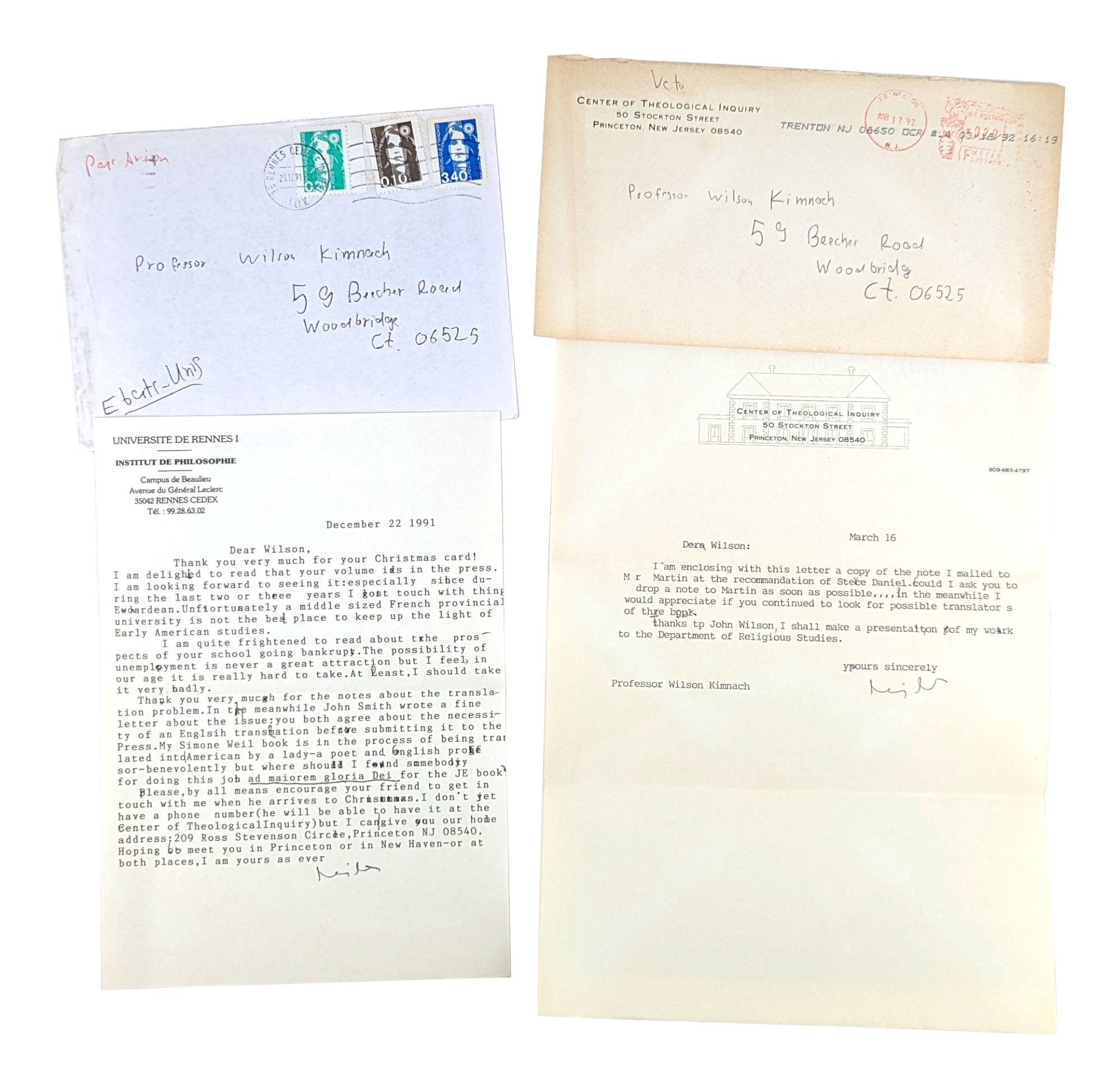 Two typed, signed letters by Veto to Edwards scholar Wilson Kimnach laid in -- the first, dated December 22 1991 on Universite de Rennes I letterhead, is a warm and chatty Christmas greeting with some discussion of translation. The second, dated March 16 (1992 by the envelope's postmark) and on Center of Theological Inquiry letterhead, encloses a copy of another letter to University of Illinois Press editor Richard Martin about a possible translation of Veto's Edwards book, and asking Kimnach to send along a note to Martin on Veto's behalf. An English translation would finally appear in 2021 from Wipf and Stock Publishers, the year after Veto's death, with Kimnach providing the foreword.