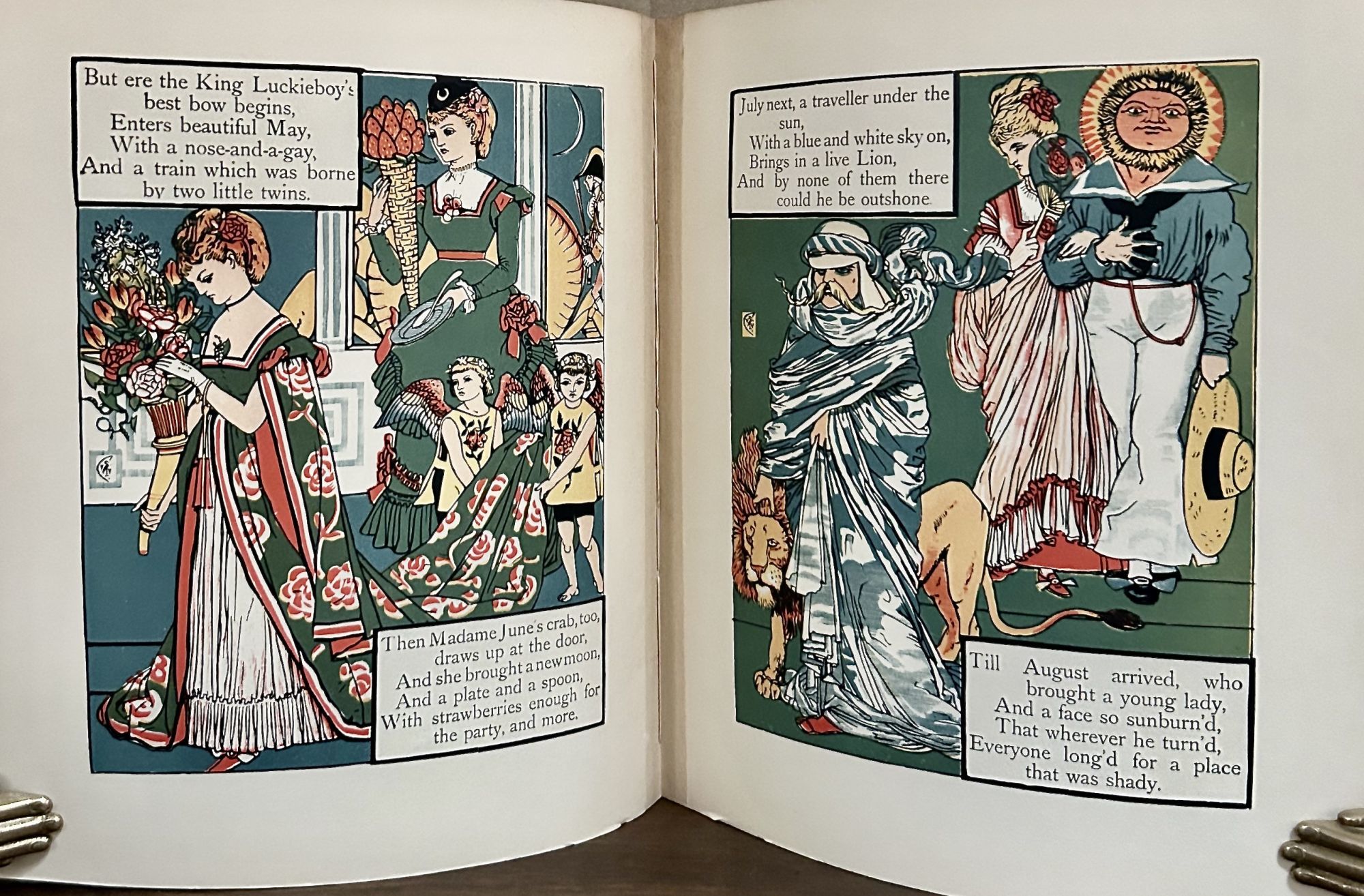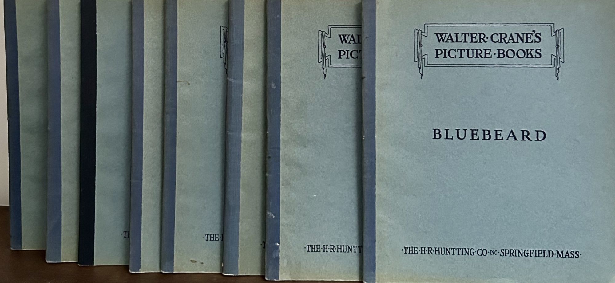 Springfield MA: The H.R. Huntting Co. Inc, Nd. Stiff Wraps. Orig. printed stiff wrappers. Near fine. 9 Vols.. Crane, Walter. 28 x 23 cm. Offered as a lot only. Interior contents are as issued, color lithographs as originally published, all Crane's images printed recto and verso only as per first editions. Replication of the first editions with colors as bright and fresh as the originals. Bound in similar fashion, blue cloth spines, blue/gray stiff wrappers, front cover lettered in black. Only fault, three lower front tips nicked with slight loss (Fairy Ship, Hind In The Wood, This Little Pig). Interior contents as new.