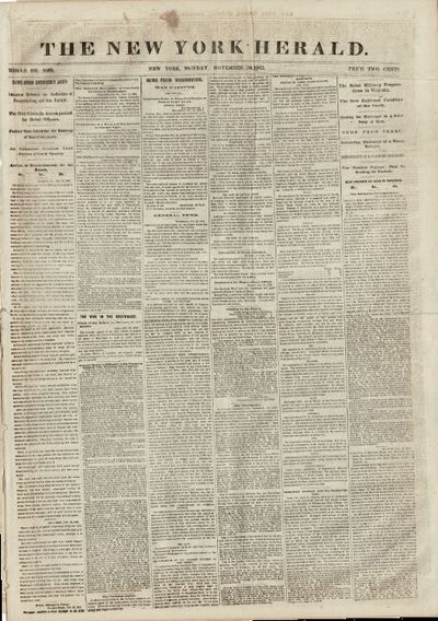 New York: Monday, November 24, 1862. 22¼" x 15¾", pp. [8]; 6 columns per page; removed from binding. Arrival of reinforements for the rebels, the rumored movements of Stonewall Jackson on Washington, the rebel military preparations in Virginia, news from Burnside's army, opening the Mississippi in a rebel point of view, financial and commercial news, city commercial news, the emancipation proclamation to be modified, shipping news, marriages & deaths, politiacal announcements, auction sales, horses & carriages, American iron-clad ships (with cuts), and usual ads.
