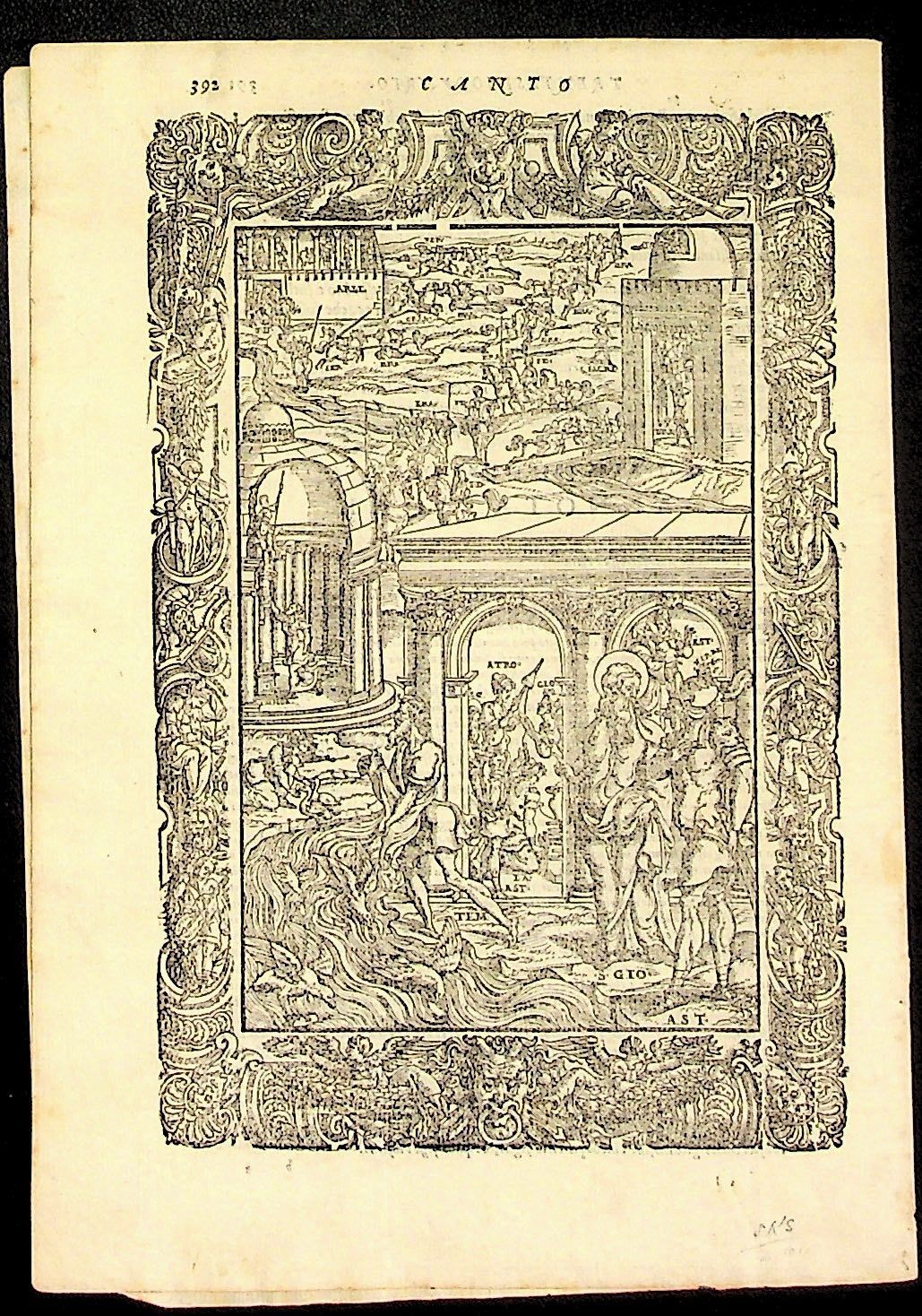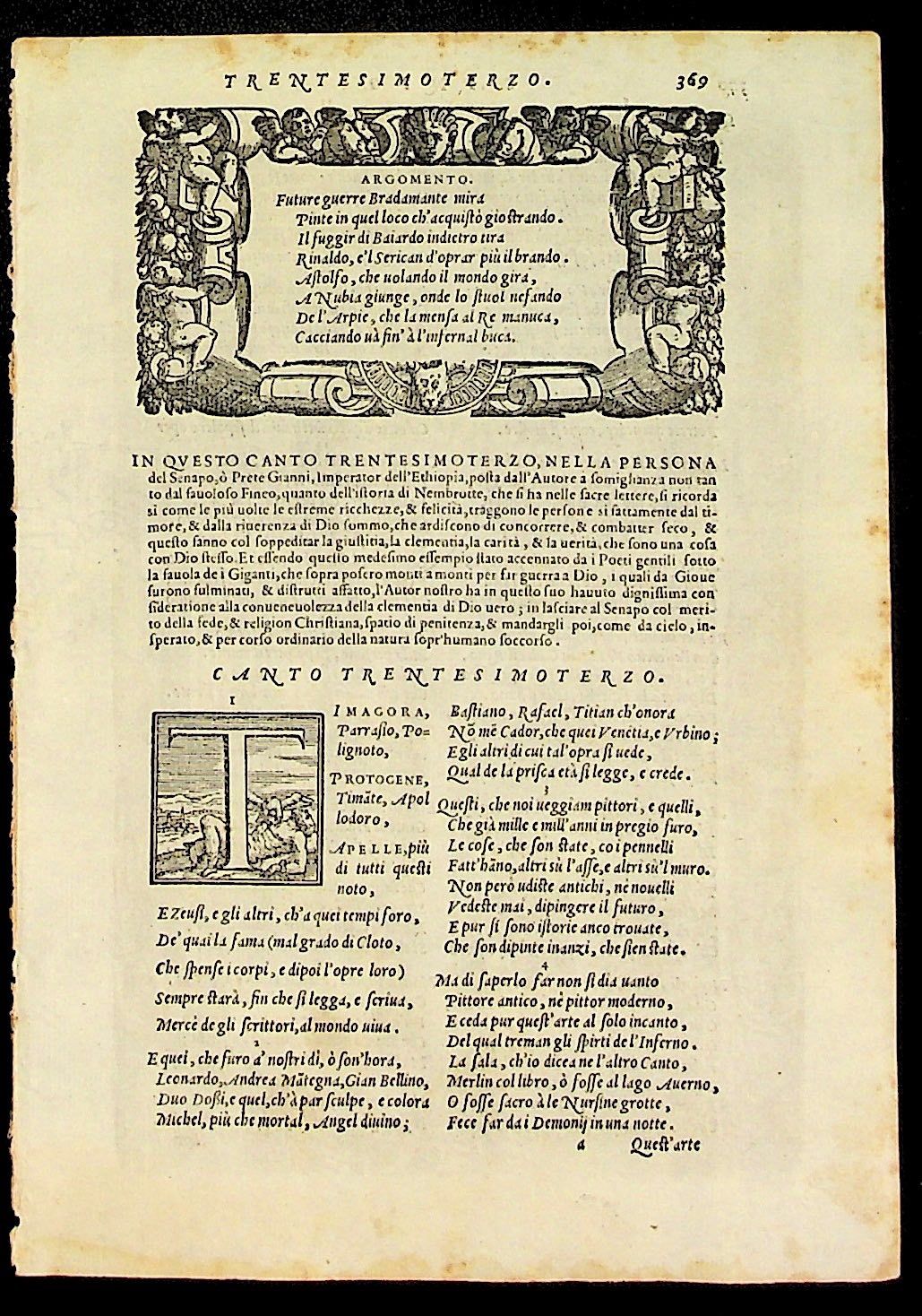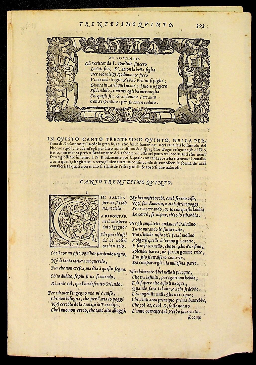 Venice: Felice Valgrisi, ca. 16th century. Very Good. Three leaves from what has been identified as a 16th century Italian edition of Orlando Furioso. The research of the former owner of the leaves led him to believe that the pages are from an edition printed by Felice Valgrisi in 1574. However, further research does not show Valgrisi printing Orlando Furioso before the 1580s, and that he only began his printing career in 1574. The leaves are for pages 369-370, and 391-394. The pages include decorated initials, Two of the pages have an opening "argomento" - subject - with a pictorial border. There is also a full-page illustration. The leaves pages show aging and the top and bottom margins and right fore-edges are browned. Still very good examples of fine sixteenth century printing. Measures 7 x 10 inches. EPHEM/042423.