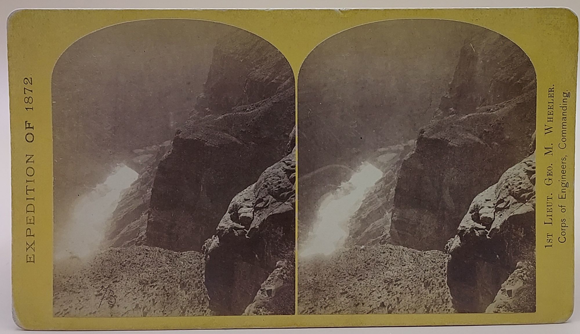 War Department, Corps of Engineers, U.S. Army. Photograph. Near Fine. Albumen stereoview [9 1/4 cm x 15 cm] on a yellow mount [10 cm x 18 cm] Geographical and Geographical Explorations and Surveys West of the 100th Meridian backstamp. Printed label on the reverse. Expedition of 1872. William Bell, who had established a studio in Philadelphia, was commissioned in 1872 by Lieutenant George Wheeler to accompany him as a photographer on an expedition into Arizona. Later, he worked as a photographer for the Pennsylvania railroad and with an expedition to Patagonia. (from Getty Museum).