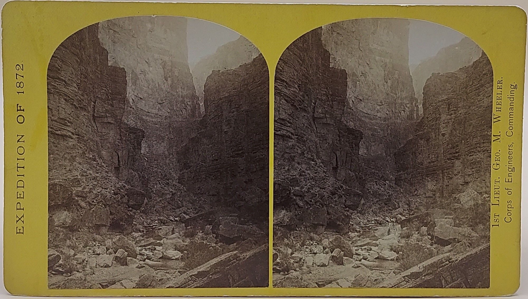 War Department, Corps of Engineers, U.S. Army. Photograph. Fine. Albumen stereoview [9 1/4 cm x 15 cm] on a yellow mount [10 cm x 18 cm] Geographical and Geographical Explorations and Surveys West of the 100th Meridian backstamp. Printed label on the reverse. Expedition of 1872. The walls are of limestone and about 2,500 feet in height. (F. 44).