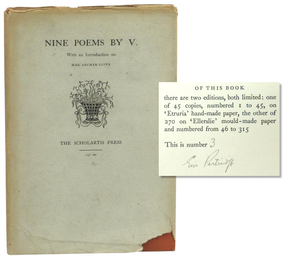 London: Scholartis Press, 1928. Hardcover. Very good. Hardcover. #3 of 45cc signed by Eric Partridge on the limitation page. Very good hardback in a darkened jacket that has a small triangular chip to the bottom of the front panel and some small spots of loss at the extremities.