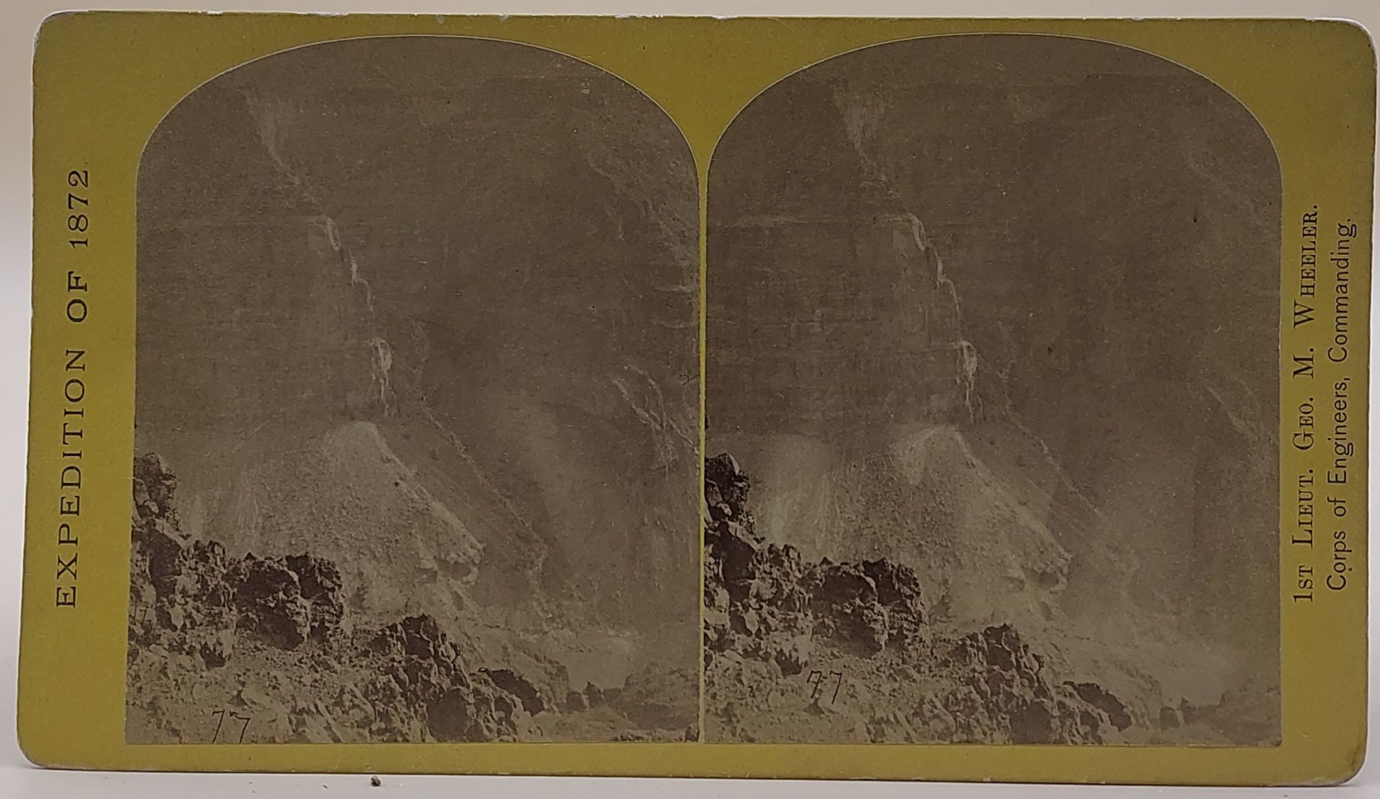 War Department, Corps of Engineers, U.S. Army. Photograph. Near Fine. Albumen stereoview [9 1/4 cm x 15 cm] on a yellow mount [10 cm x 17.5 cm] Geographical and Geographical Explorations and Surveys West of the 100th Meridian backstamp. Printed label on the reverse. Expedition of 1872. A view of the south wall of the gorge, as seen from the opposite bank (F. 77).