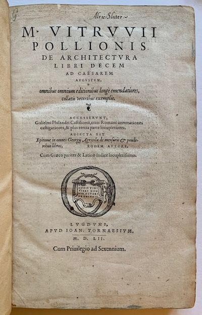 Lyons: Jean de Tournes, 1552. Full leather. Very Good. Bernard Salomon. Edited by Guillaume Philander. Lyons: Jean de Tournes, 1552. De Tournes's device on title, 83 woodcuts, one folding plate of a monumental inscription, head-pieces, initials, a second printer's device on verso of last leaf. First de Tournes edition of Vitruvius with the revised and expanded commentary and notes by Philander (1505-1563) and illustrations by Bernard Salomon. Philander studied with Serlio in Venice and worked on Vitruvius in Rome in the Accademia delle Virtú. "Philander's work is at once a learned study and a practical manuel of architecture, incorporating the methods of both the humanists and architects. It is the first synthesis of academic and practical interpretations of Virtruvius' treatise to appear in published form" (Millard). In solid, very presentable condition. The spine re-backed in an early 20th century light-calf over dark, blindstamped, 17th century boards.
