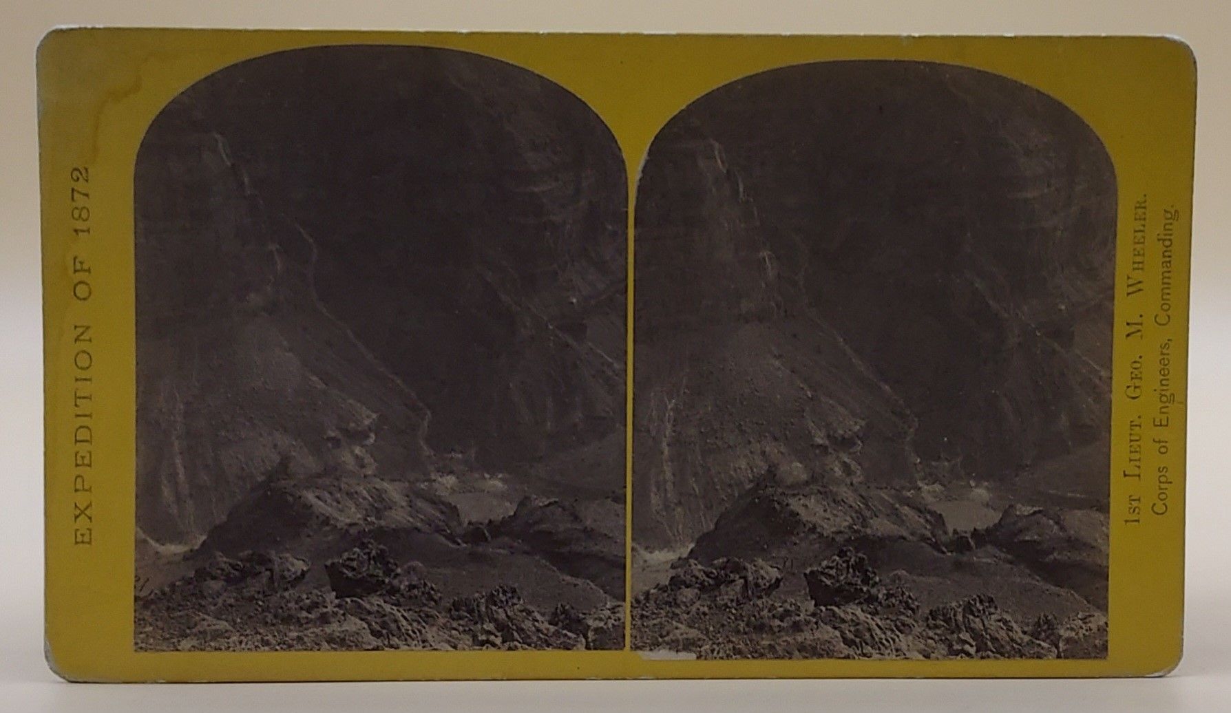 War Department, Corps of Engineers, U.S. Army. Photograph. Very Good. Albumen stereoview [9 1/4 cm x 15 cm] on a yellow mount [10 cm x 17.5 cm] Geographical and Geographical Explorations and Surveys West of the 100th Meridian backstamp. Printed label on the reverse. Expedition of 1872. The left margin is subtly damp stained. A view of the south wall of the gorge, as seen from the opposite wall (F. 81).