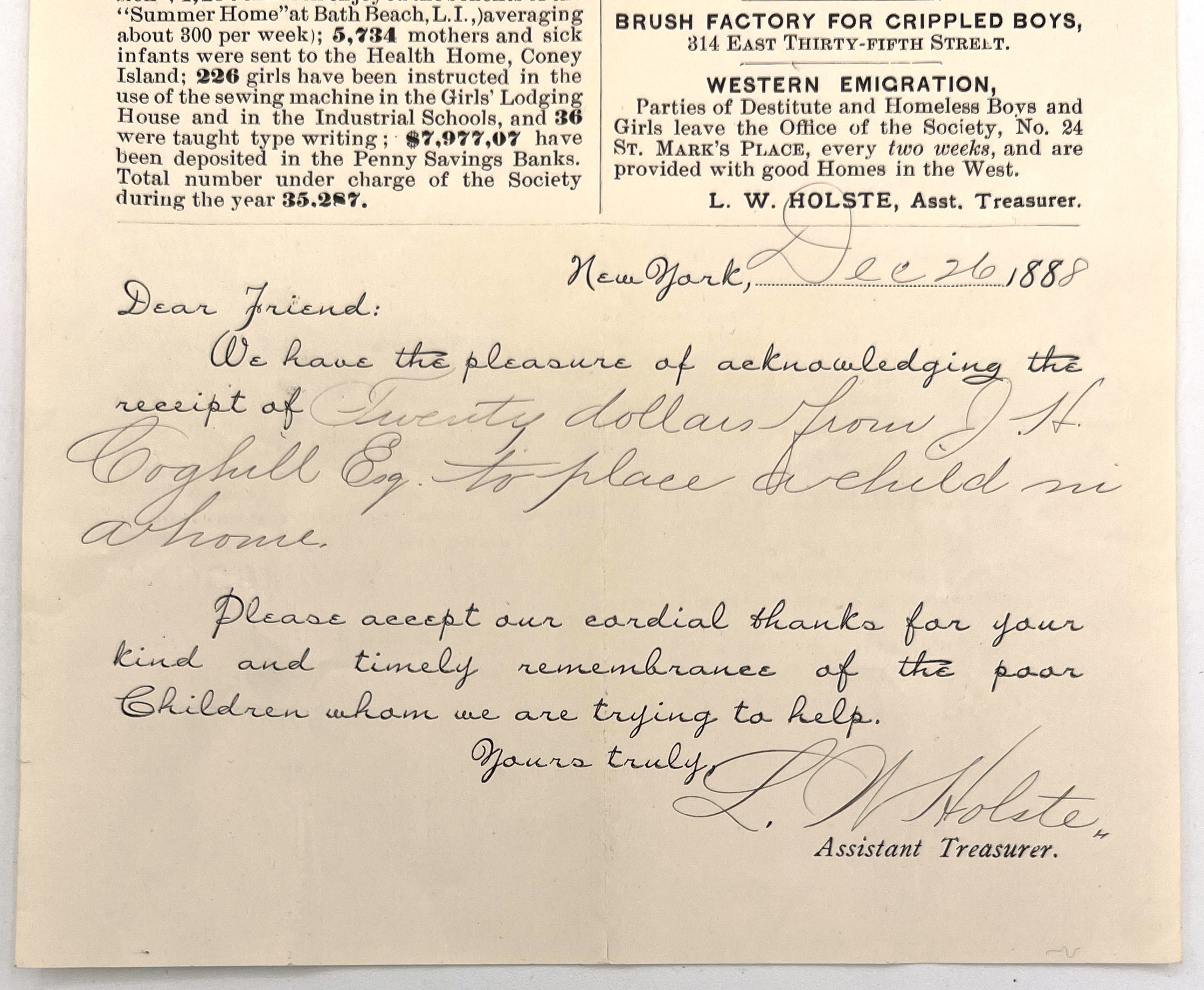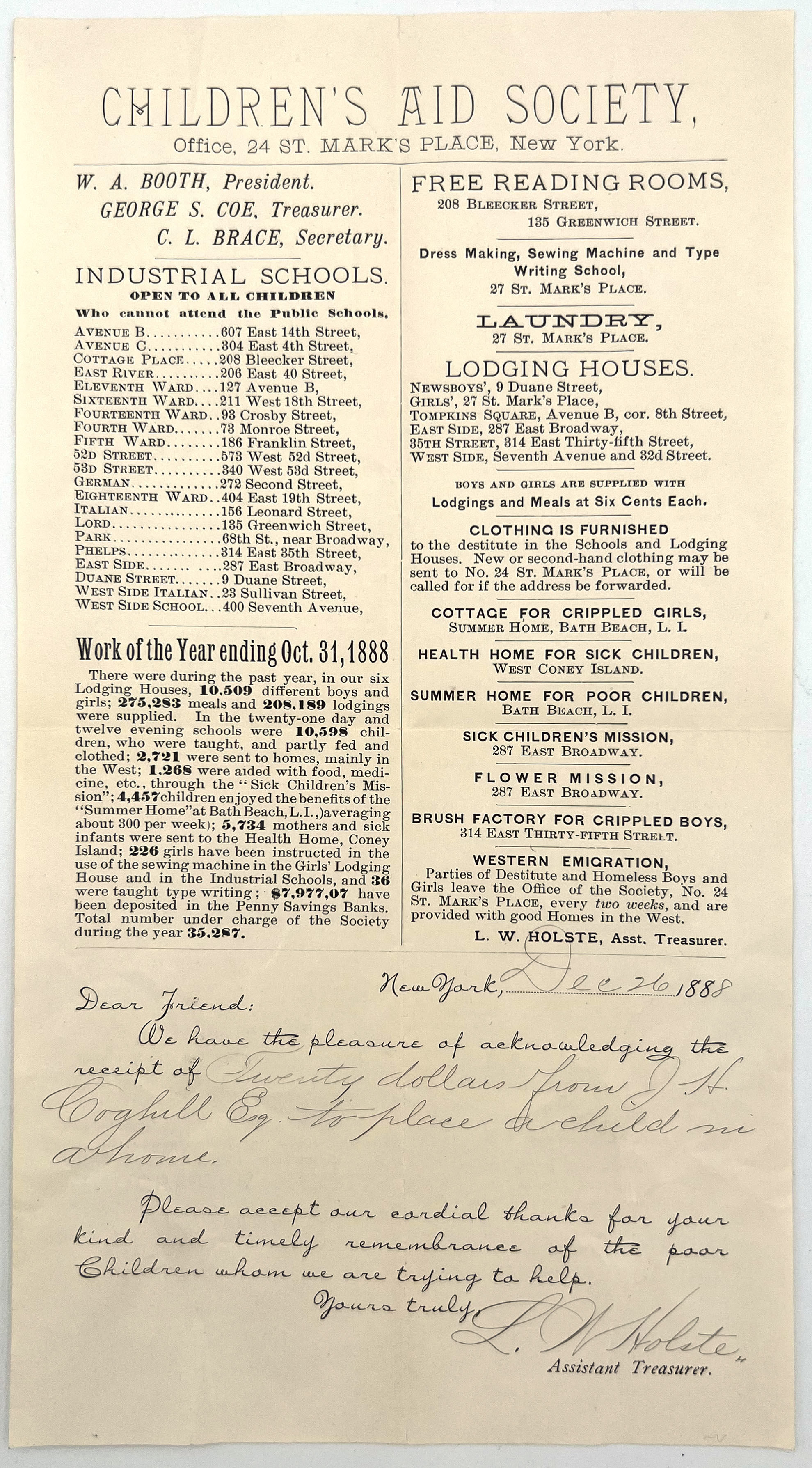[New York, New York]: Children's Aid Society , 1888. Near-fine. Minor toning and letter folds.. Printed donation receipt and circular with valuable information about the Children's Aid Society in New York, including: a list of "Industrial Schools Open to all Children who cannot attend the Public Schools"; a list of Lodging Houses and other related work placements for children, including a flower mission, laundry, "Brush Factory for Crippled Boys", and "Cottage for Crippled Girls"; information about clothing and provisions furnished to the children; the address of the "Western Emigration Office"; and a lengthy list of statistics, including such valuable figures as how many meals were served in the past year (275,283), how many girls were taught to use the sewing machine (226), and the total number of children under charge of the Society in one form or another (35,287). The donation form below has been filled out in early ink manuscript, thanking J.H. Coghill for his donation of twenty dollars to the Children's Aid Society "to place a child in a home". Measures 11.5" by 6.25". The Childrens Aid Society, established in 1857 and incorporated on 22 Sept. 1865, was the second children's aid society in the U.S. Like its predecessor, the New York Childrens Aid Society, it emphasized placing dependent children in foster homes, but like the Cleveland Orphanages, it also sheltered them. It initially organized to support the Cleveland Industrial School. In 1876, when the city closed the Cleveland Industrial School, the Children's Aid Society modified its focus to house the children who formerly resided at the school, using the schools facility at 10427 Detroit Rd.In 1876, Rev. William Sampson served as superintendent and chaplain for over 19 years, travelling thousands of miles, placing children and visiting them to confirm the quality of their care. Between July 7, 1876, and December 31, 1893, the society received and cared for 2,109 children.