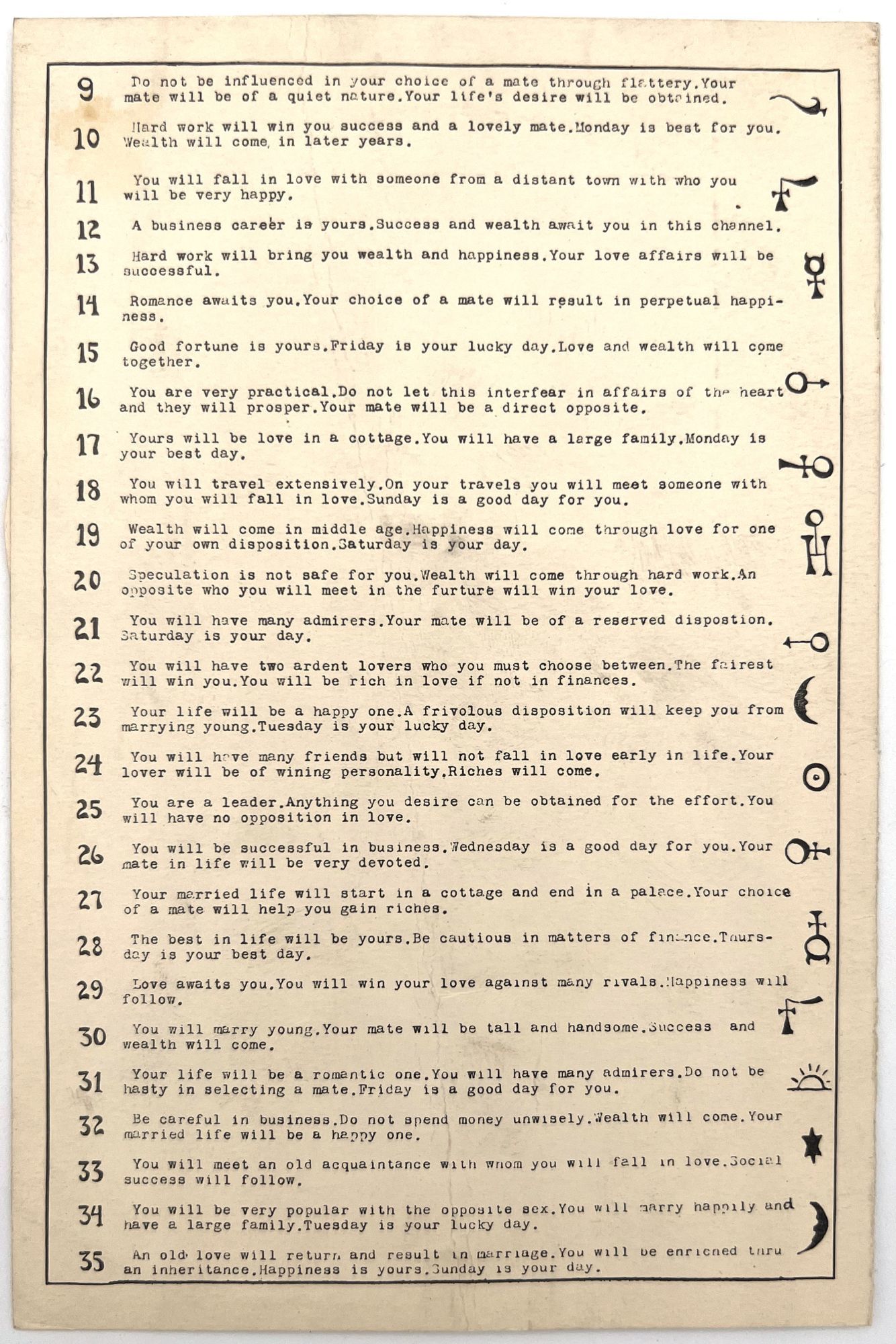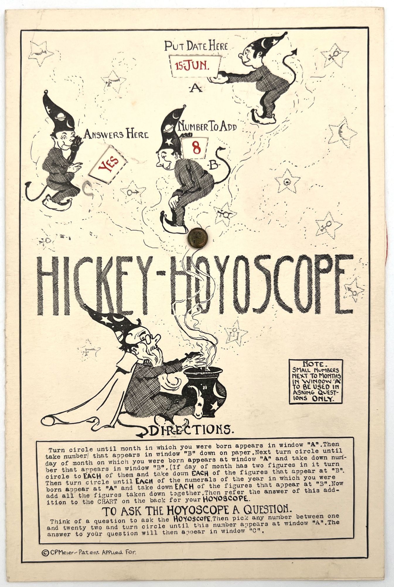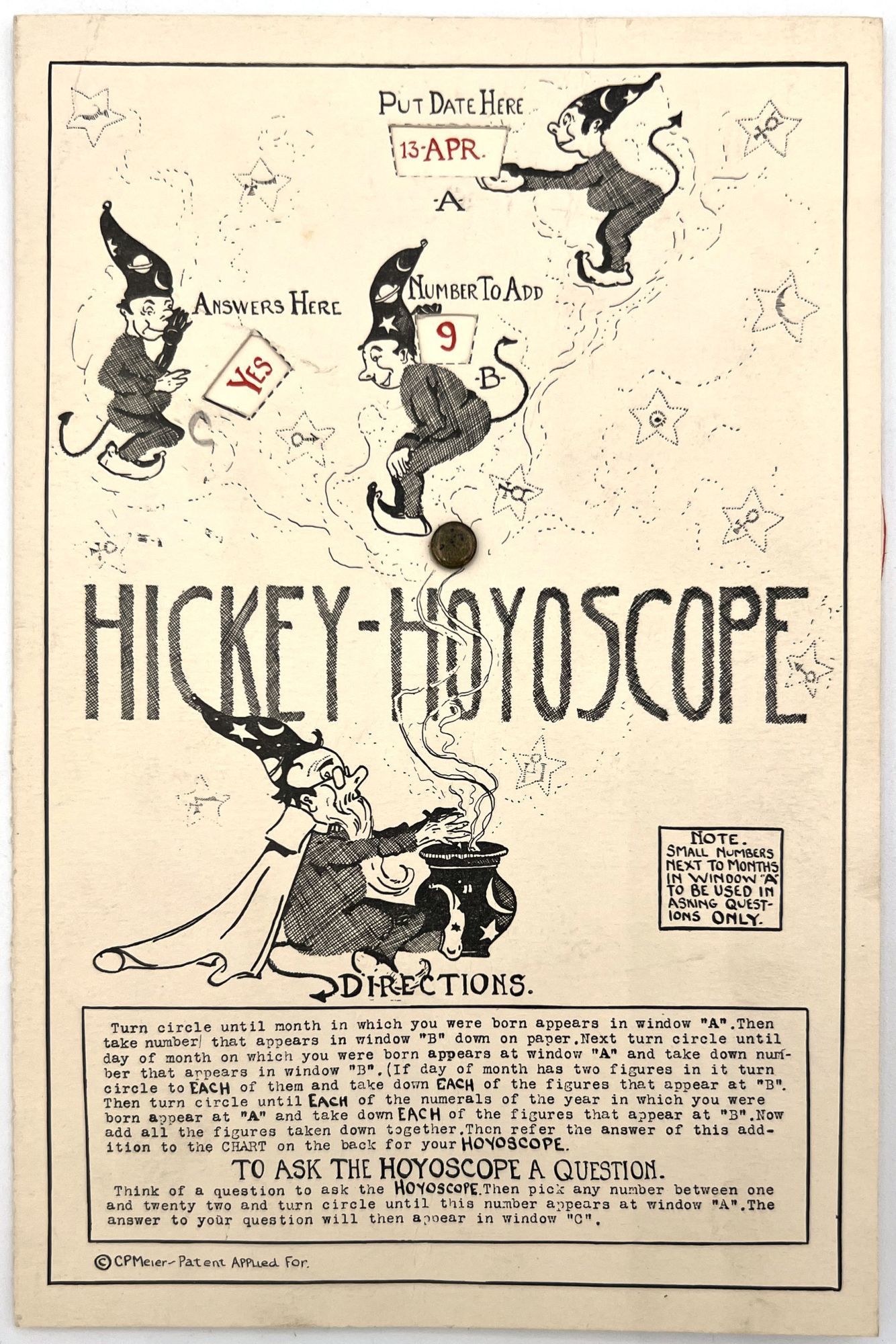 United States: C.P. Meier, 1930. Near-fine. Minor toning, vertical crease on lower leaf of card bifolium.. The "Hickey-Hoyoscope" is a whimsically illustrated volvelle fortune teller game. The directions instruct the user to turn the volvelle based on one's birthday several times, adding up the given numbers in window "B"; corresponding answer appear on the back of the card. The user can also ask a yes or no question using window "C". The fortunes on the back of the card include themes of love, happiness, and fortune in finances and business.
