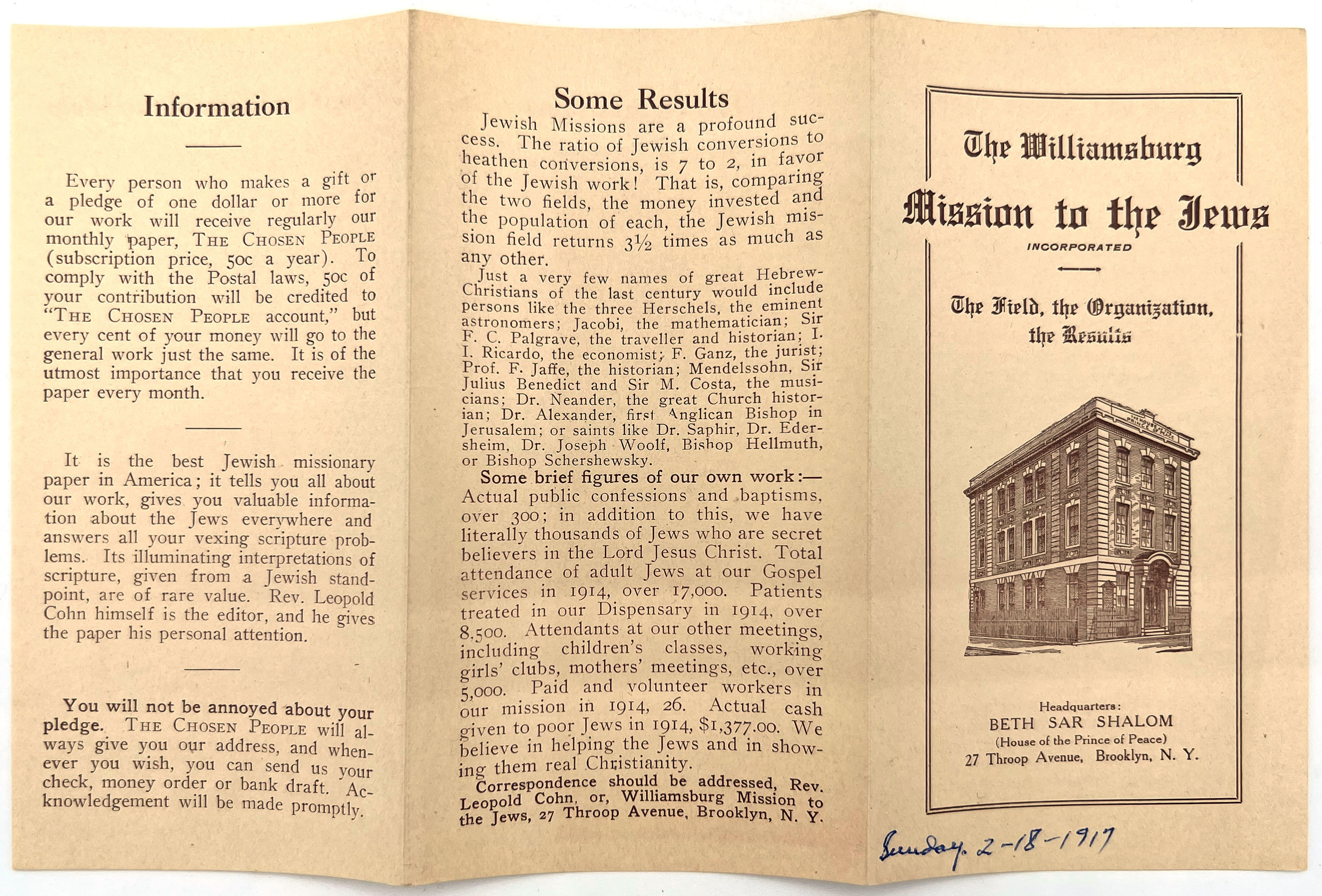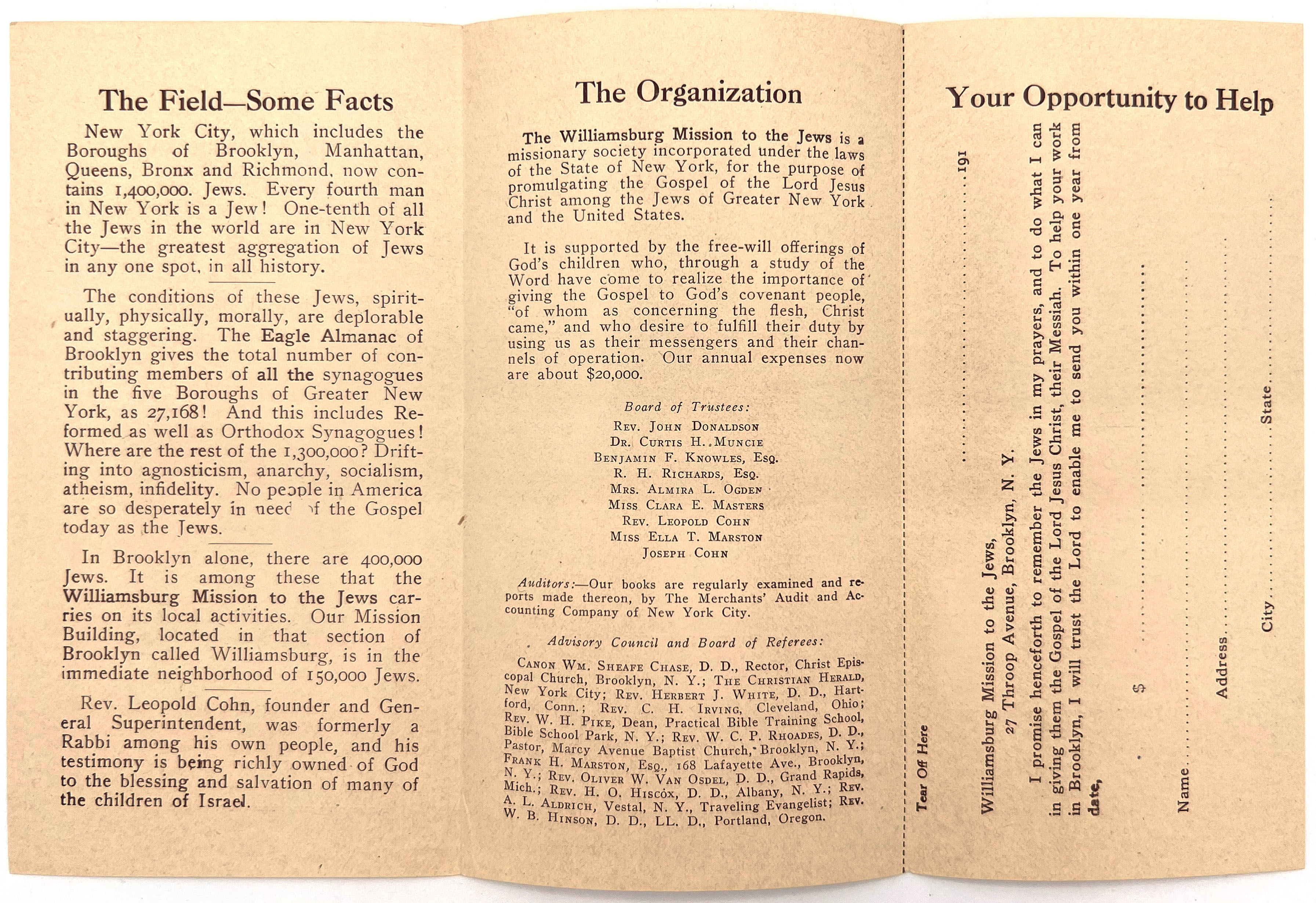 Brooklyn, New York: Williamsburg Mission to the Jews, 1917. Printed tri-fold pamphlet promoting the Williamsburg Mission to the Jews, with tear-off mail-in donation slip. The Mission's purpose was to convert New York Jews to Christianity. The pamphlet begins by asserting that "Every fourth man in New York is a Jew!" and that New York is "the greatest aggregation of Jews in any one spot, in all history". It goes on to say that "The conditions of these Jews, spiritually, physically, morally, are deplorable and staggering" and that the population is, in its words, in danger of "Drifting into agnosticism, anarchy, socialism, atheism, infidelity" and that it is in dire need of conversion to Christianity. The leader of the Mission was "formerly a Rabbi" who aims to "promulgate the Gospel of the Lord Jesus Christ among the Jews of Greater New York". Tri-fold pamphlet measuring 6.25" by 3.5" folded. Later blue ink manuscript to first leaf.