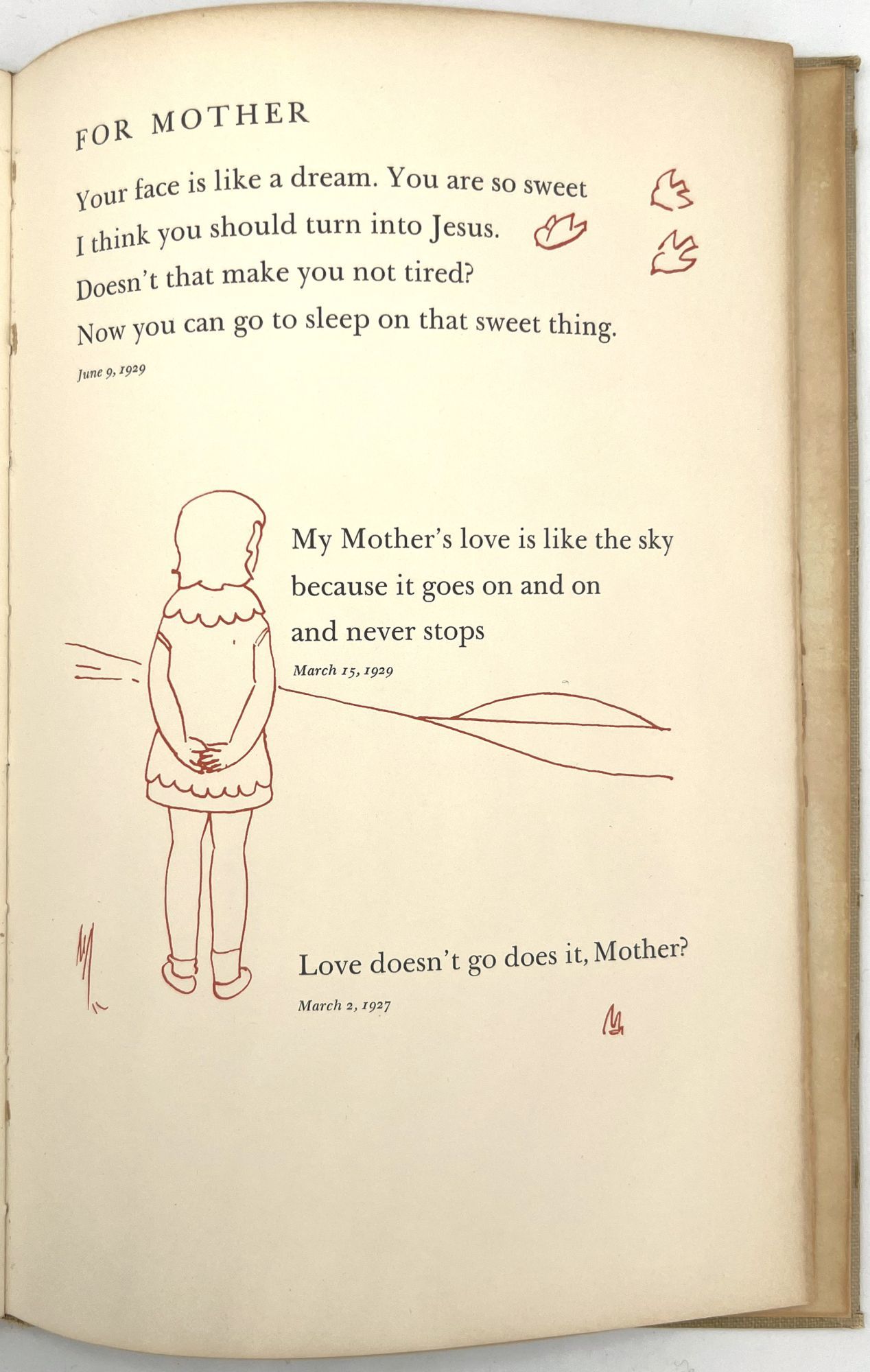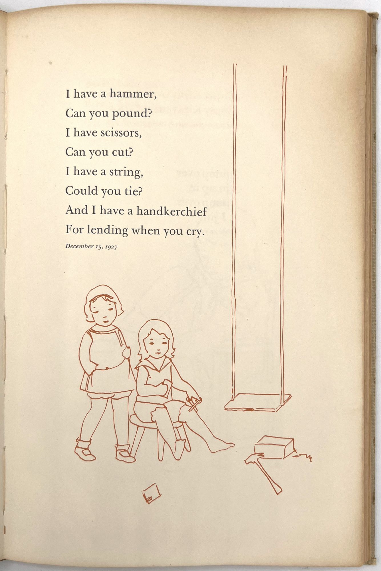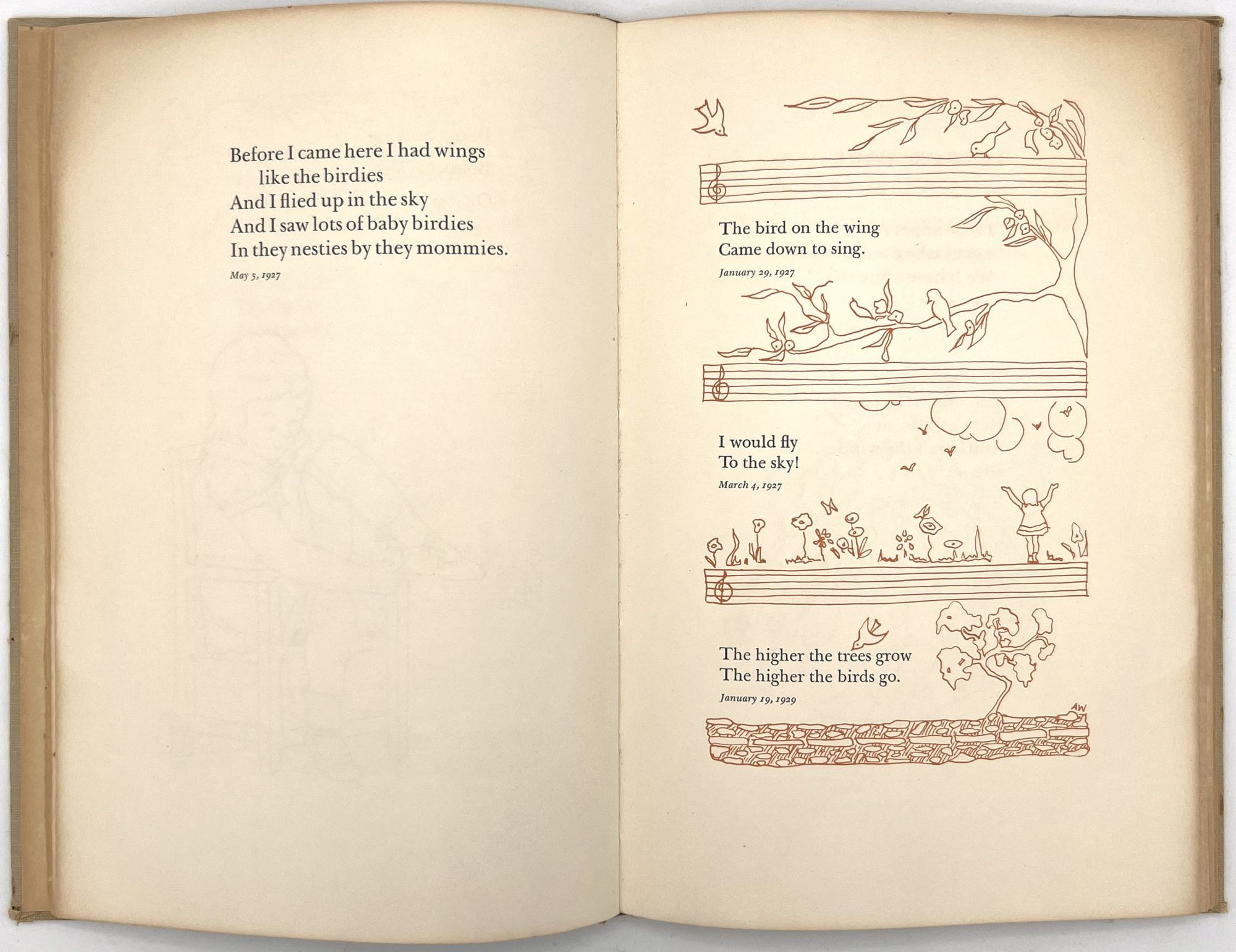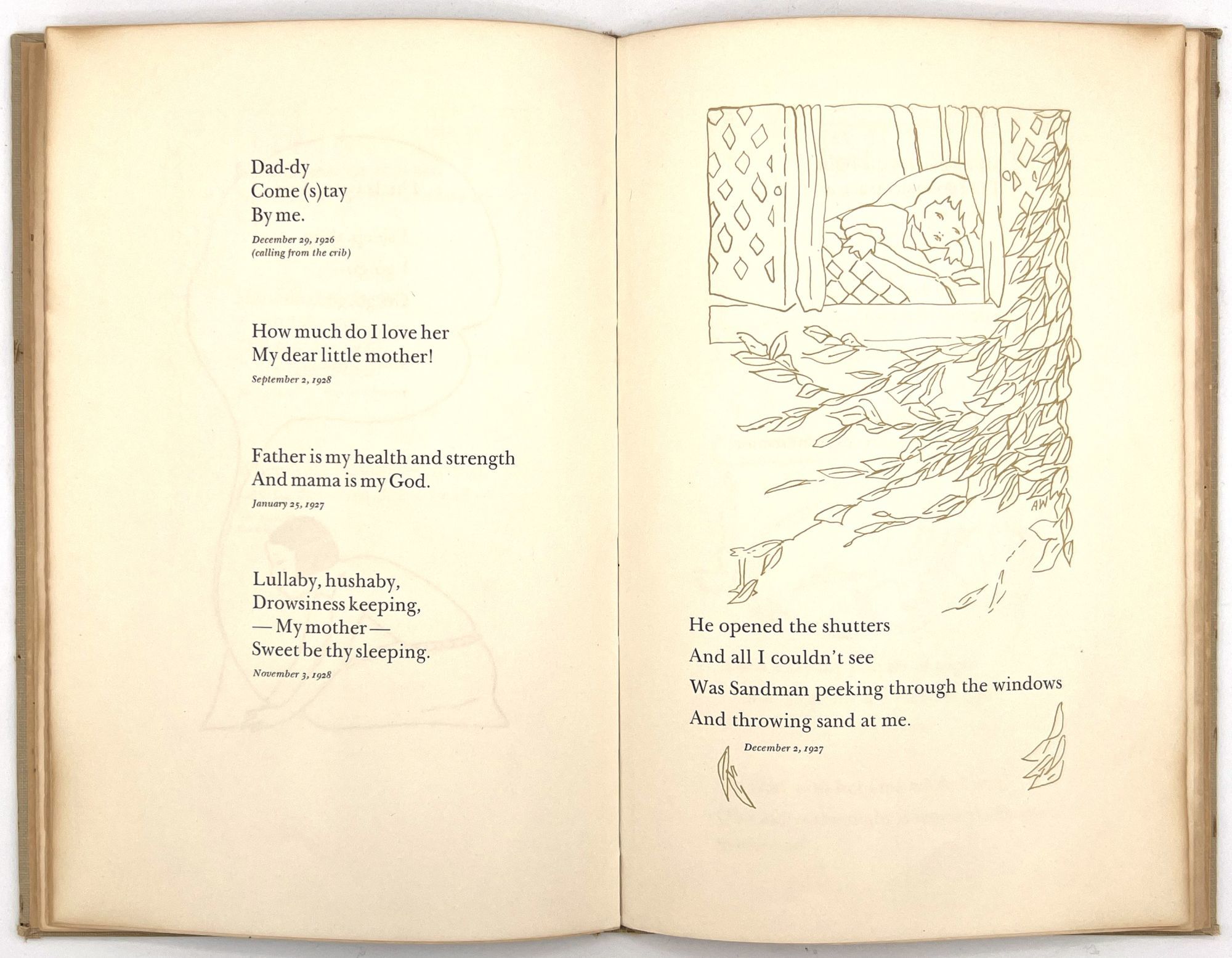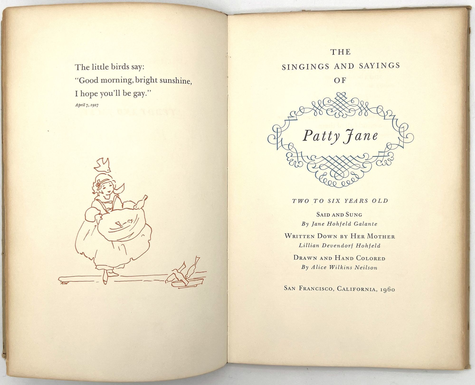 Galante, Jane Hohfeld. "The Singings and Sayings of Patty Jane Two to Six Years Old. Said and Sung by Jane Hohfeld Galante Written Down by Her Mother Lillian Devendorf Hohfeld Drawn and Hand Colored by Alice Wilkins Neilson". San Francisco: [Lawton Kennedy], 1960. 8vo (10" by 6.75"), pp. [52], illustrated, bound in original plain tan cloth. Extremities rubbed with some minor points of wear, binding sunned, minor dust soiling. Scarce institutionally, with only five (5) copies on OCLC as of April 2023, only 1 outside California (Brown). This appears to be the author's personal copy.