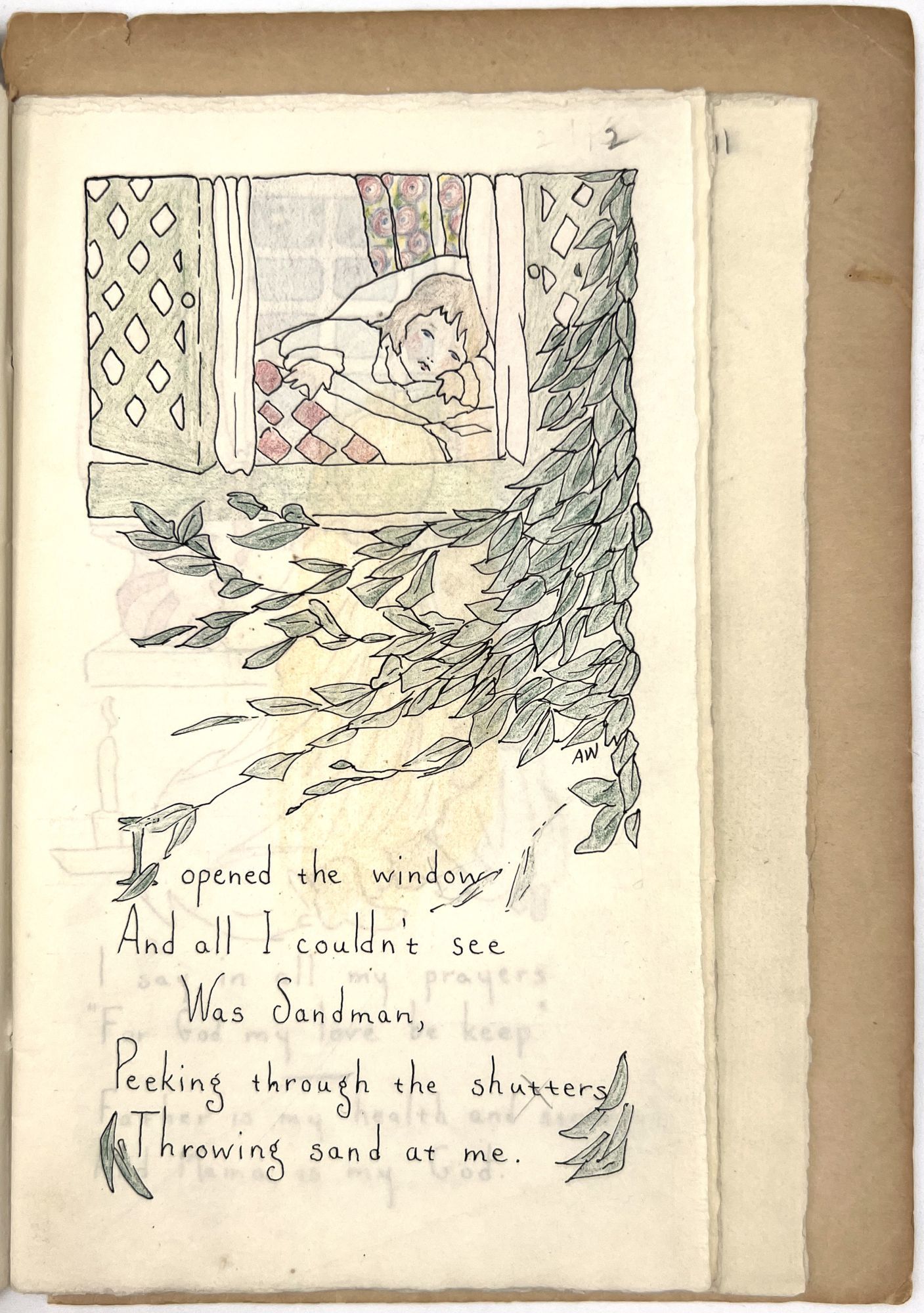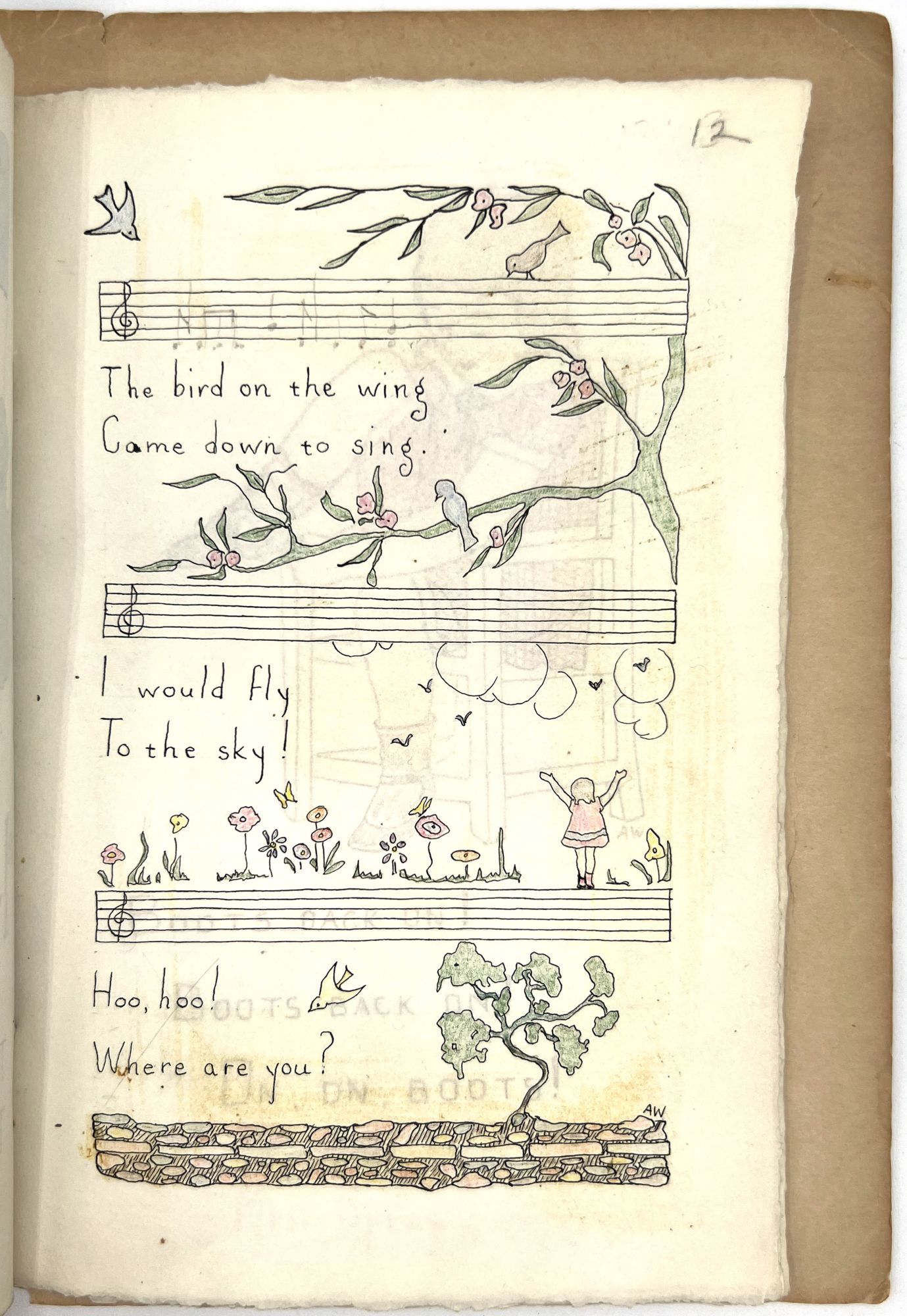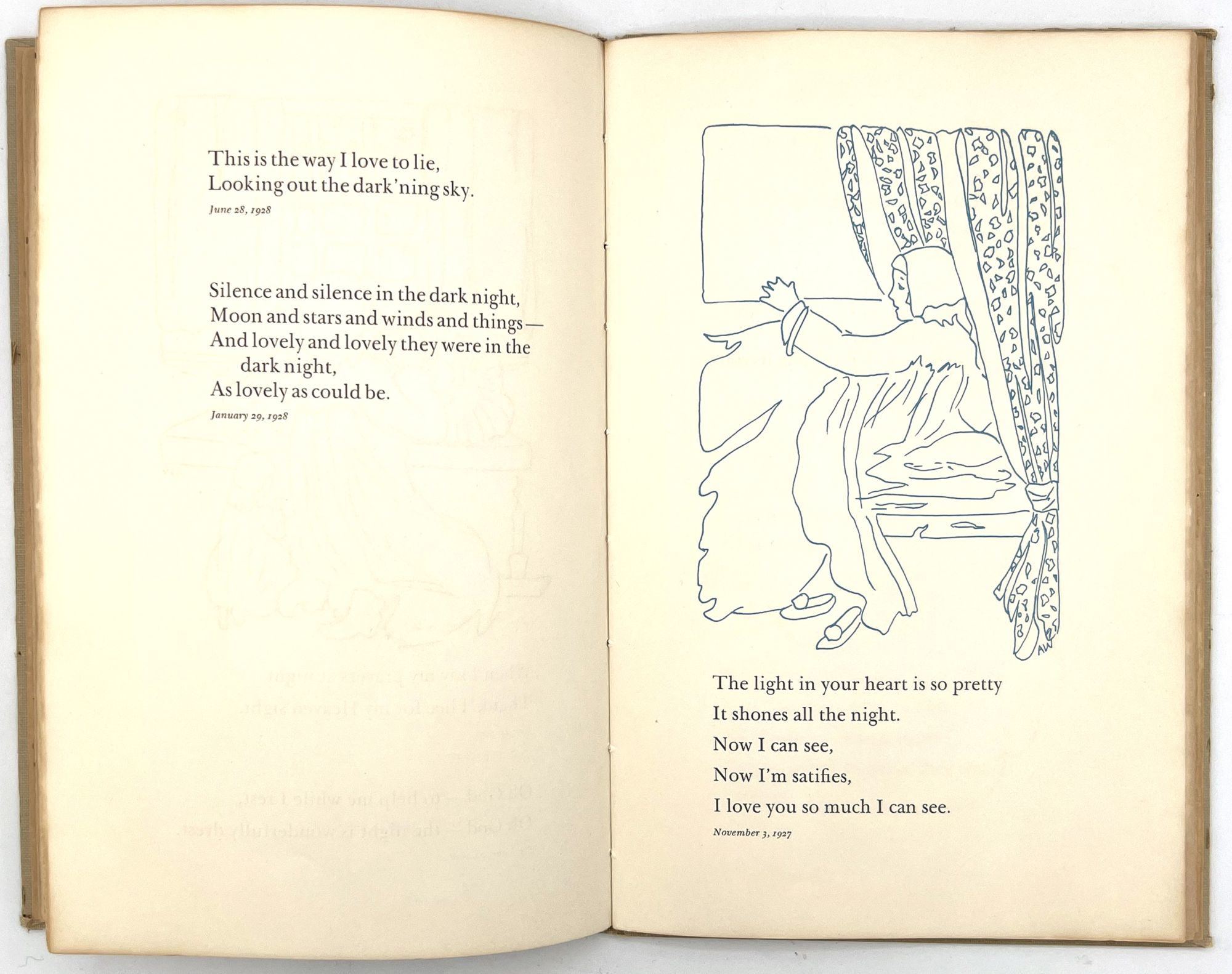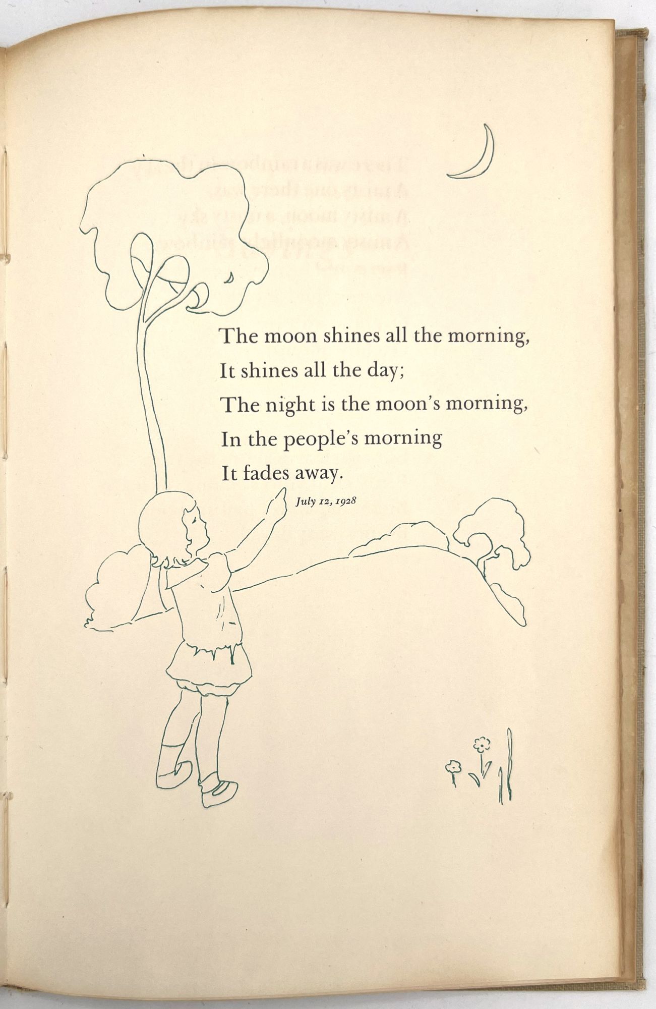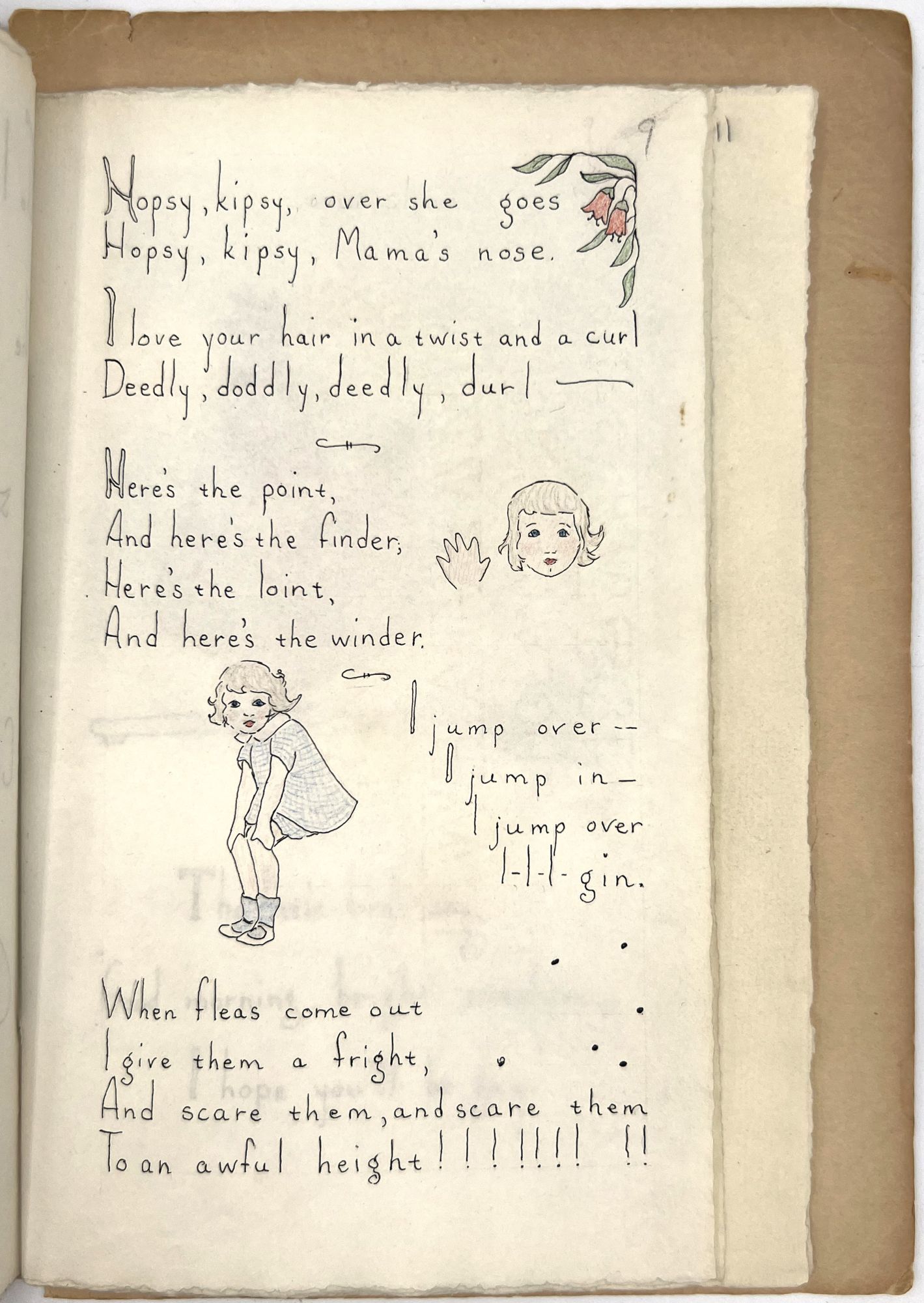 Galante, Jane Hohfeld. "The Singings and Sayings of Patty Jane Two to Six Years Old. Said and Sung by Jane Hohfeld Galante Written Down by Her Mother Lillian Devendorf Hohfeld Drawn and Hand Colored by Alice Wilkins Neilson". San Francisco: [Lawton Kennedy], 1960. 8vo (10" by 6.75"), pp. [52], illustrated, bound in original plain tan cloth. Extremities rubbed with some minor points of wear, binding sunned, minor dust soiling. Scarce institutionally, with only five (5) copies on OCLC as of April 2023, only 1 outside California (Brown). This appears to be the author's personal copy.