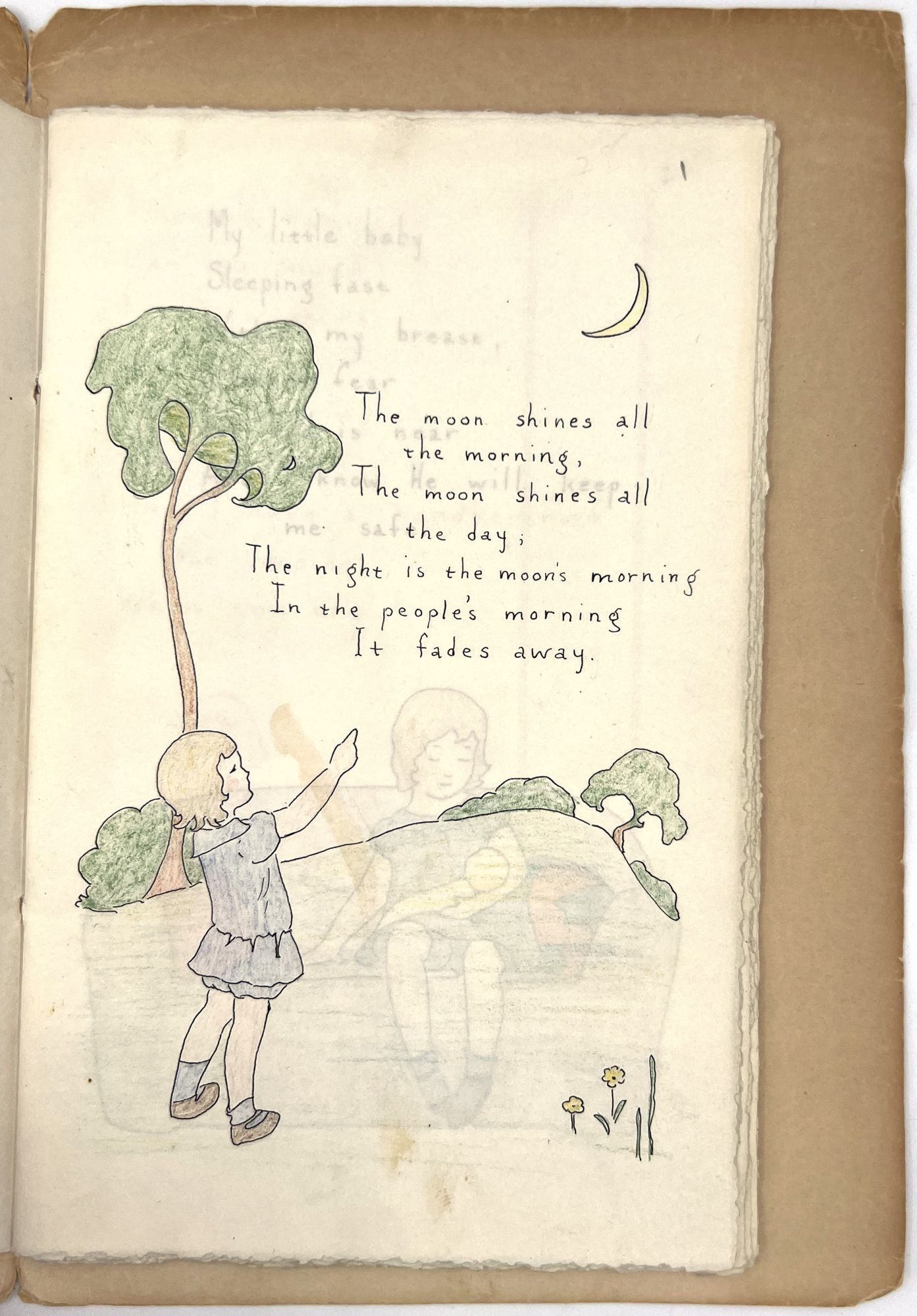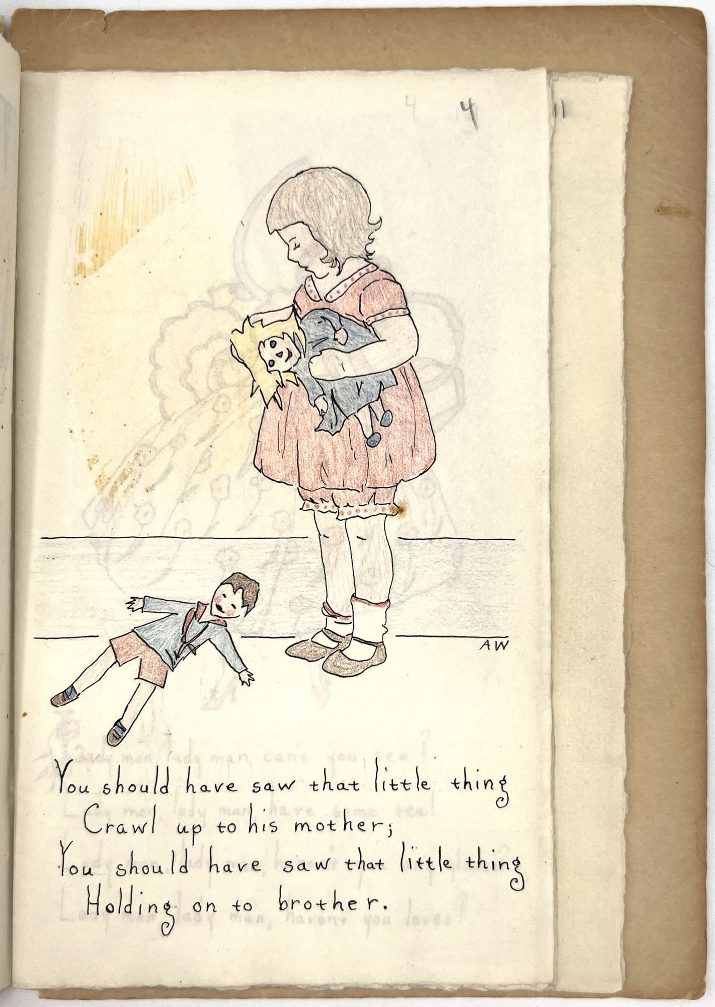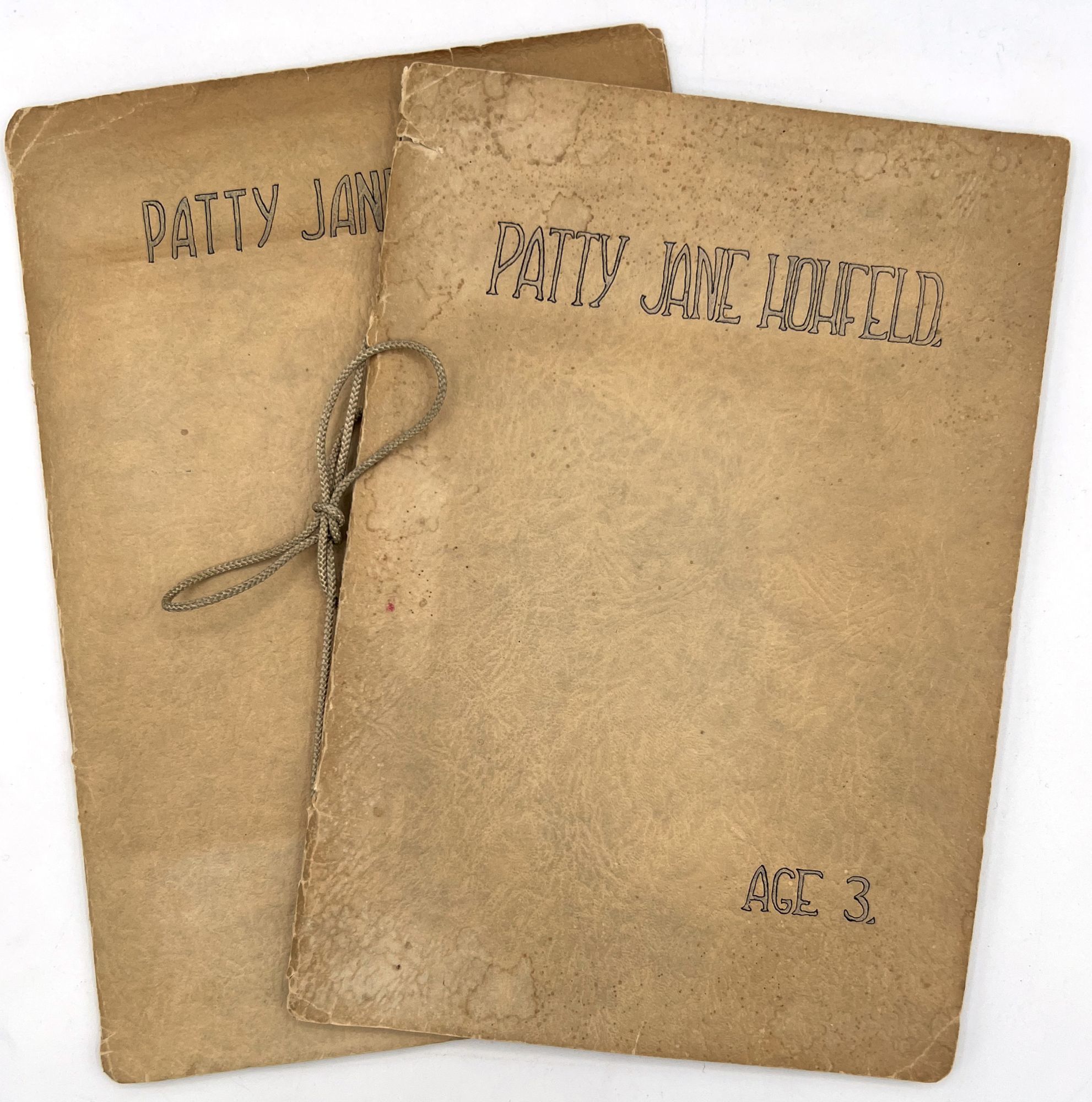 [Galante, Jane Hohfeld, and Alice Wilkins Neilson (illus.)] Patty Jane Hohfeld. Age 3 [and Age 4]. [San Francisco, c.1960]. Two vols, each 8vo (9.5" by 6.75"), ff. 20 and ff. 26, ink manuscript with original ink and colored pencil illustrations by Neilson. Both volumes bound in original textured paper wrappers bound in cord hand-lettered in ink and colored pencil on upper covers. Minor toning, dust soiling, one or two stains, sunned. One text block loose, lacking cord. Chipping, short tears to wrappers.