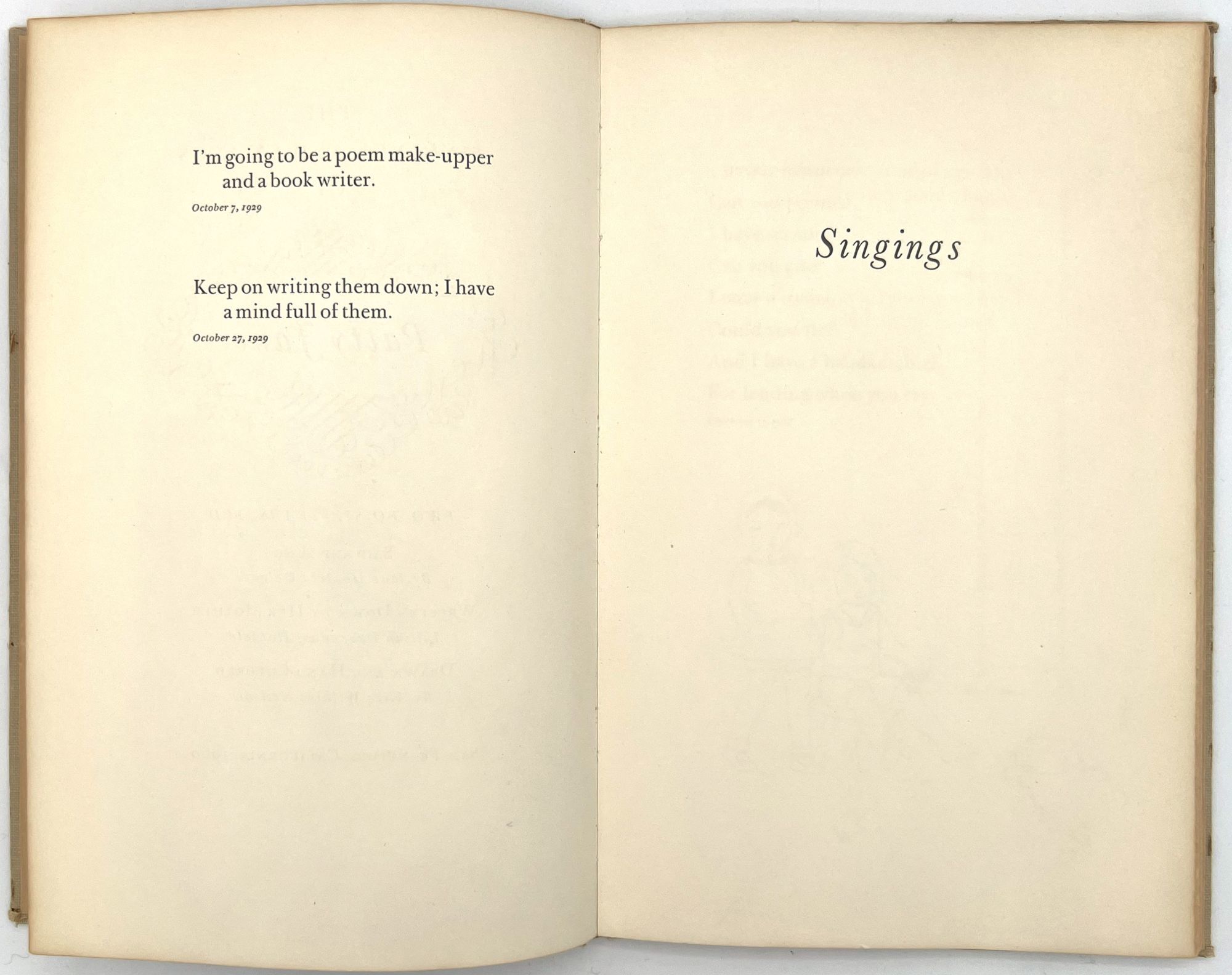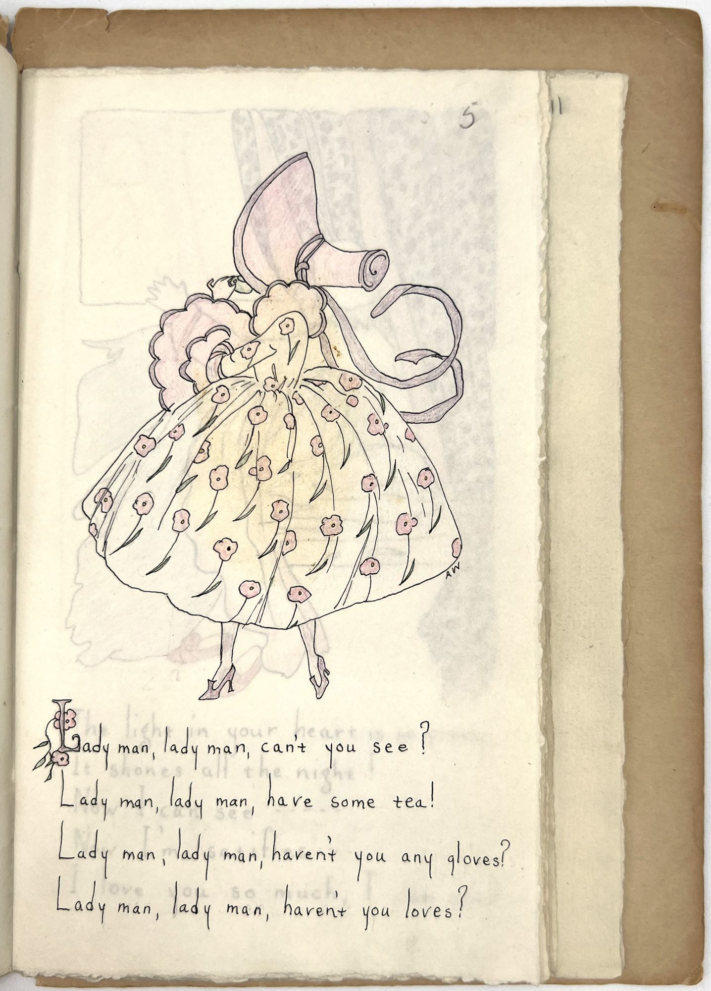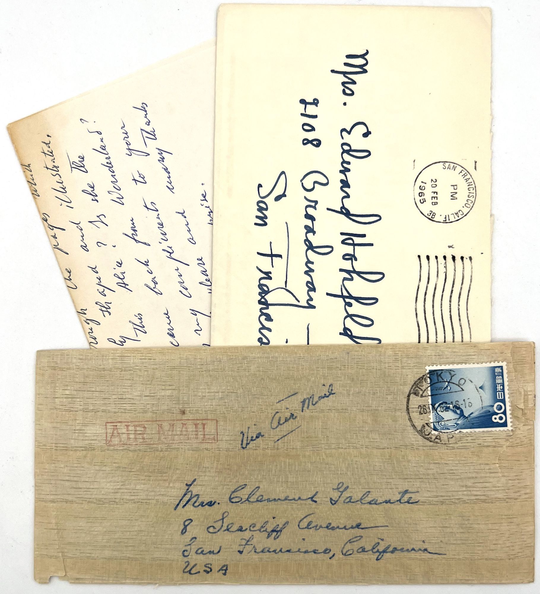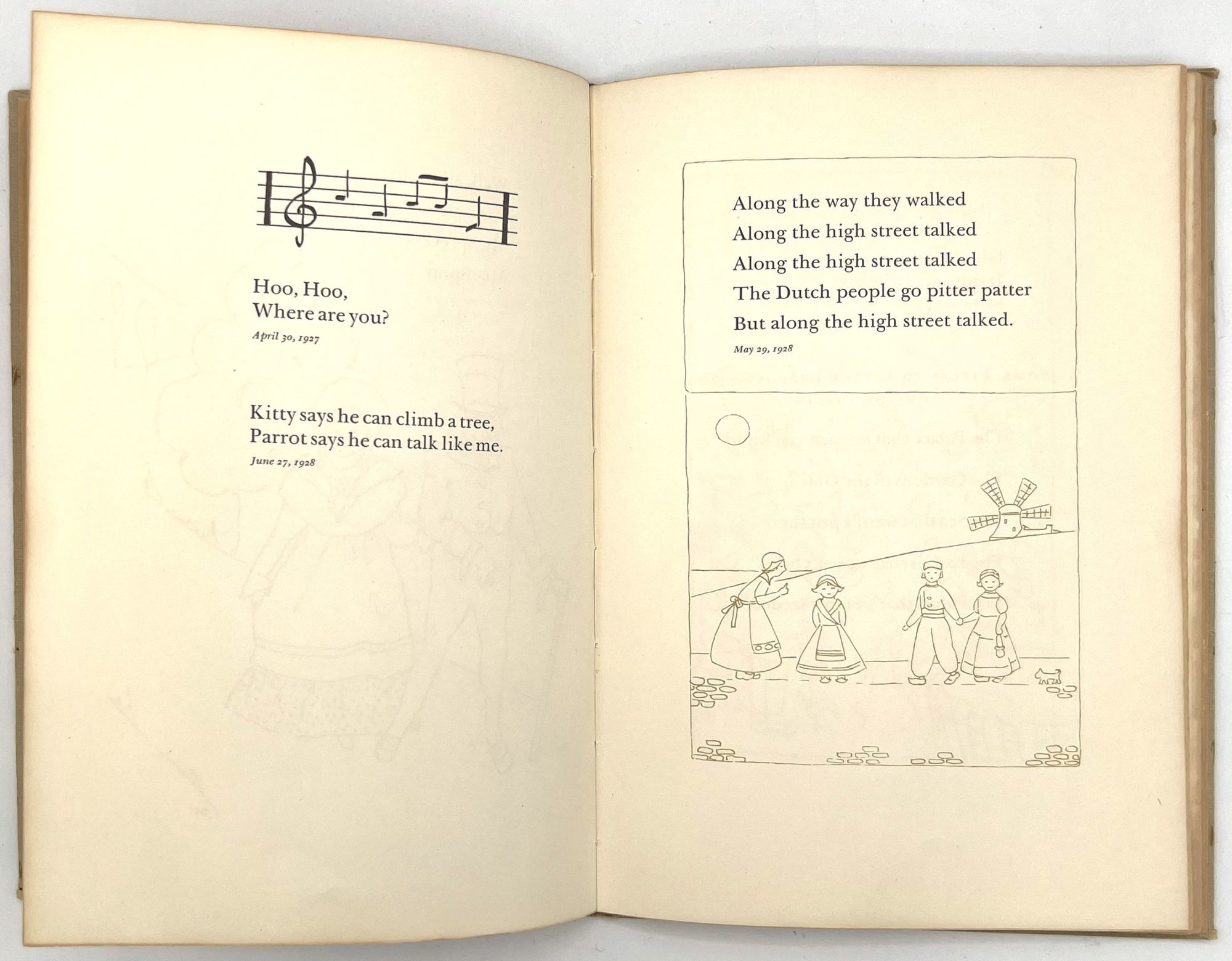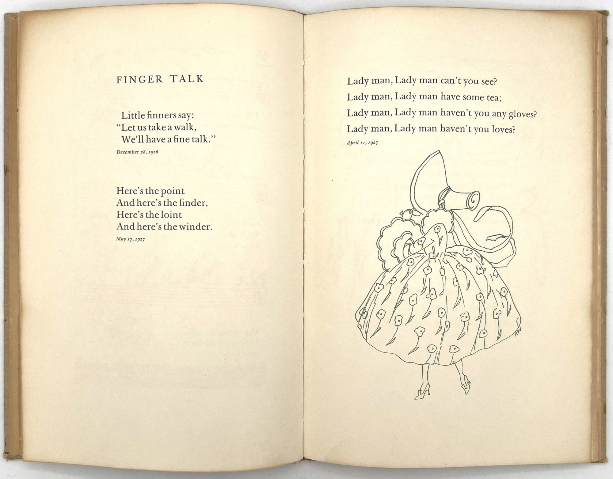 San Francisco, California: Lawton Kennedy, 1960. Very good. Minor flaws including toning, unobtrusive short tears, dust soiling, wear to extremities.. A remarkable archive of material created and collected by Jane Hohfeld Galante of the prominent San Francisco Hohfield family, including two original manuscripts and a scarce children's book privately printed for her by Lawton Kennedy. The privately printed book appears to be loosely based off of the manuscripts, illustrated by Alice Wilkins Neilson c.1960. Both the manuscripts and the book include short sayings and rhymes coined by Jane when she was young girl several decades before in the 1920s; they were previously written down by the girl's mother. There is also a small grouping of correspondence and a list tracking the dozens of presentation copies gifted from Jane to her friends from as far away as France and Japan. As a whole, the archive paints a charming picture of a young child's whimsical world view, brought forth into the world by her as an adult years later in partnership with an accomplished printer and illustrator.
