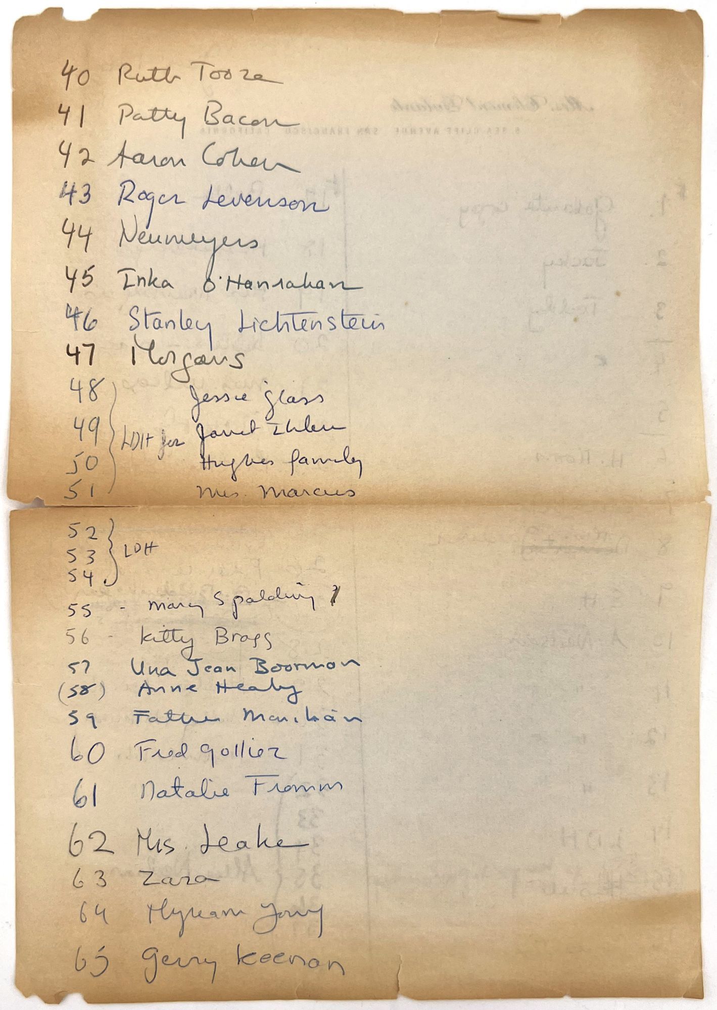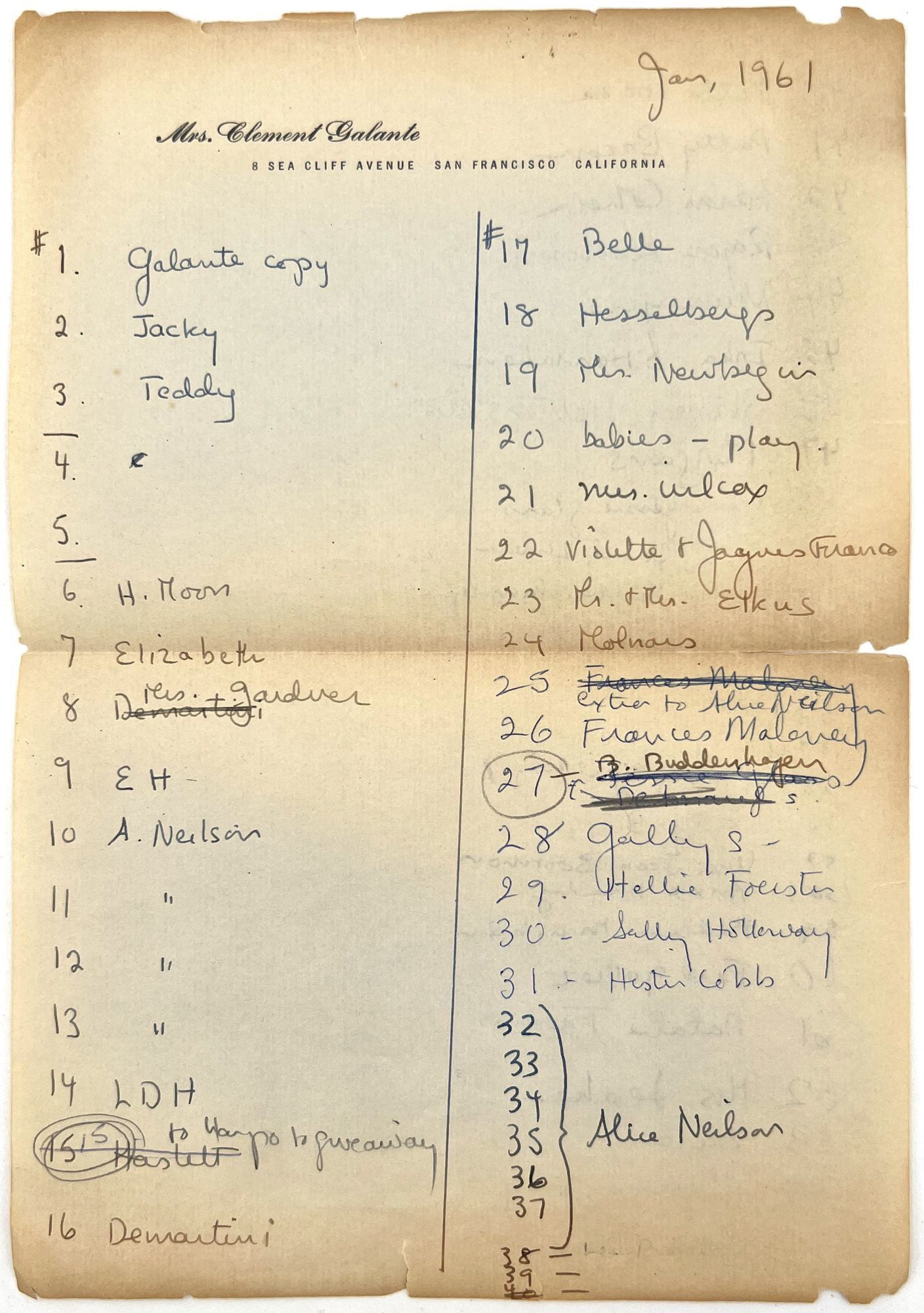 Single leaf of personal letterhead (10.5" by 7.25") with ink manuscript recording the approx. 65 presentation copies sent by Jane Hohfeld Galante to her friends and colleagues. Lists number 1 as the "Galante copy", which is presumably the copy listed above.