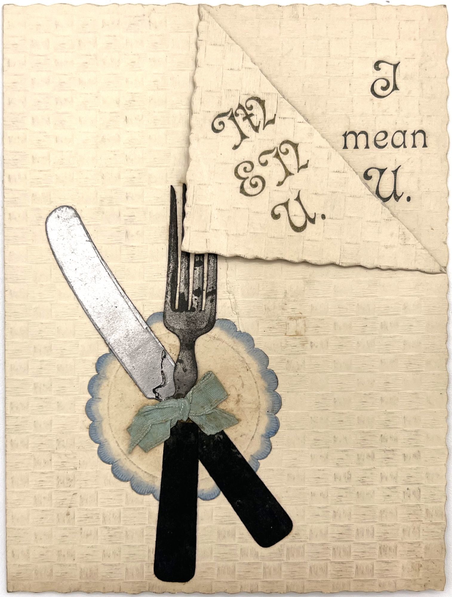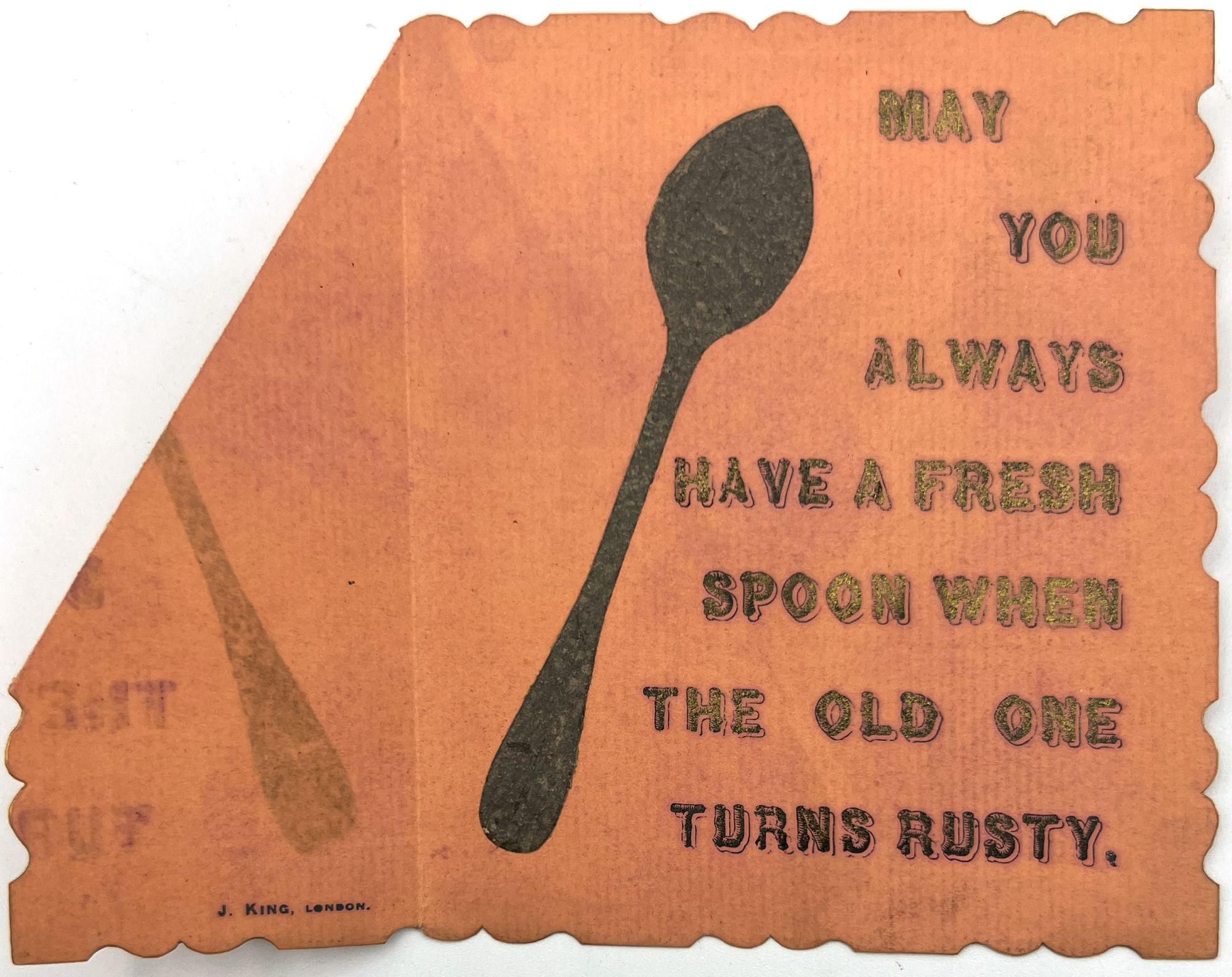 London: J. King, 1890. Very good. Minor dust soiling, spotting, offsetting. Adhesive from where previously affixed to scrapbook.. Two (2) amusing greeting cards designed with cutlery puns: "A Stirring Time to You" - may you always have a fresh spoon when the old one turns rusty..., "A FORK to show you're not fork-gotten...", and so on. Each is crafted out of embossed decorated paper and has a corner folded back, to help it resemble a napkin. Both are embossed with paper cutlery pasted on. Both measure approx. 5" by 4" A FORK to show you're not fork-otten