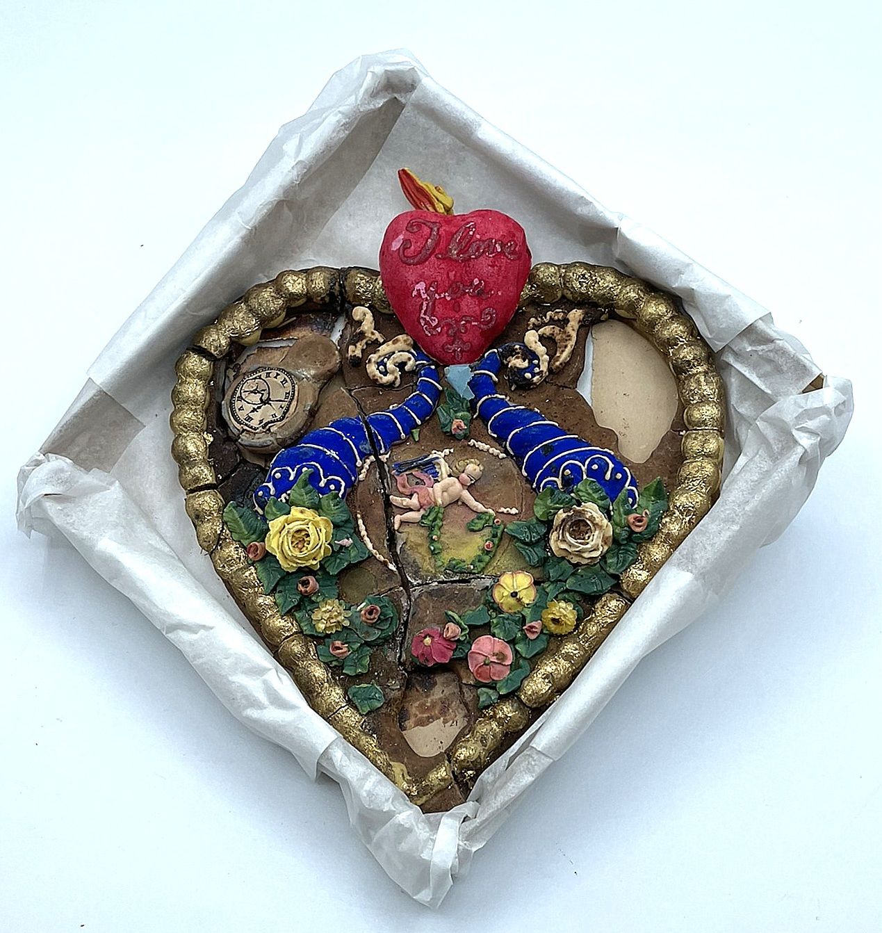 Victorian Cookie - with Cupid & Cornucopias of Flowers in a Garden Scene plus Marzipan Flaming Heart