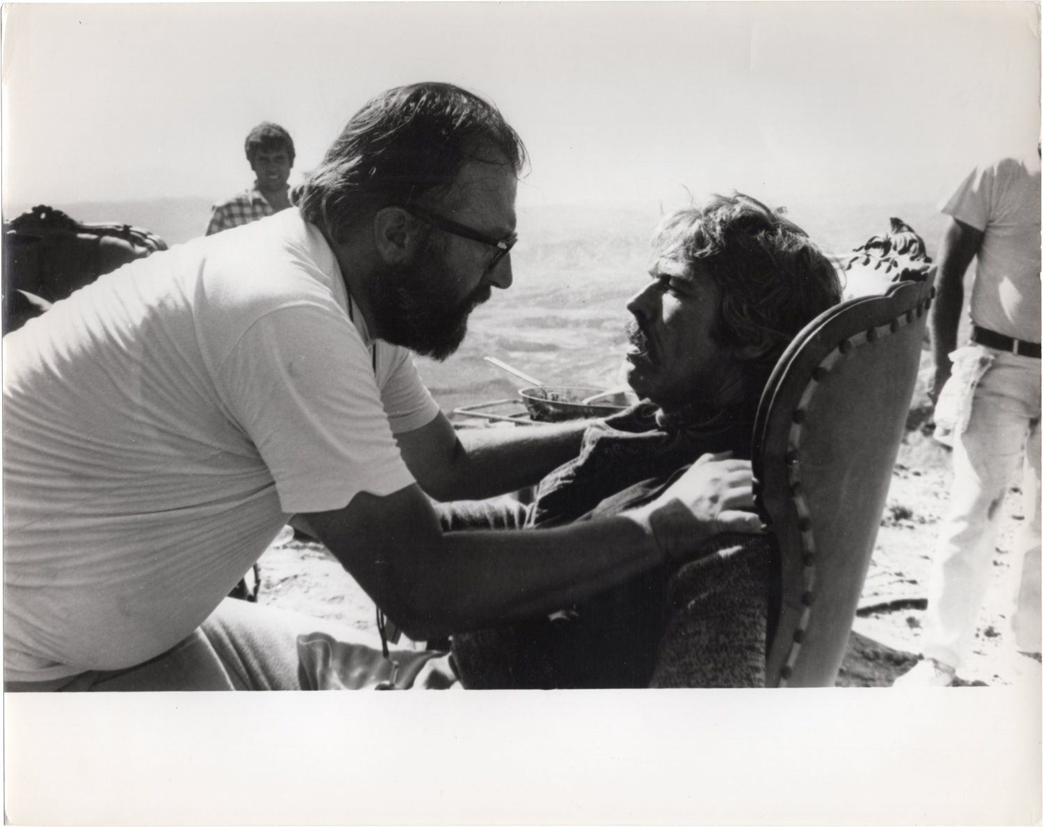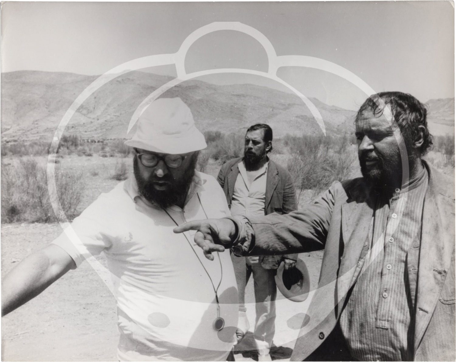 N.p.: N.p., 1971. Two vintage borderless reference photographs of director Sergio Leone on the set of the 1971 film, one showing Leone with actor James Coburn, the other showing Leone with Coburn and actor Rod Stieger. Cinemagence stamps on the versos.