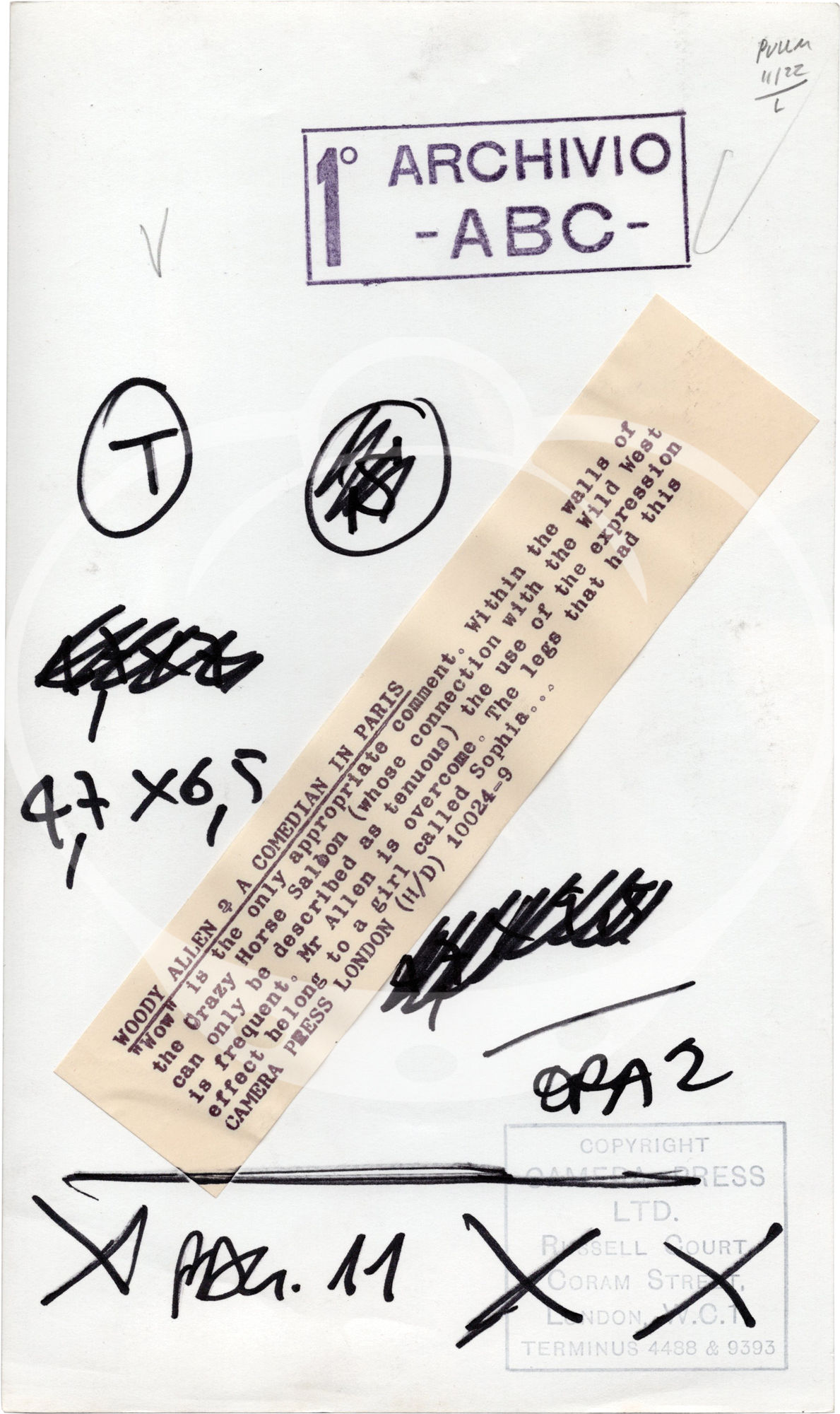 London: Camera Press, 1965. Vintage borderless photograph of Woody Allen ogling a woman's legs at the Crazy Horse Cabaret in Paris, circa 1965. Mimeo snipe and stamps of Camera Press in London on the verso, along with annotations in manuscript ink regarding cropping.
