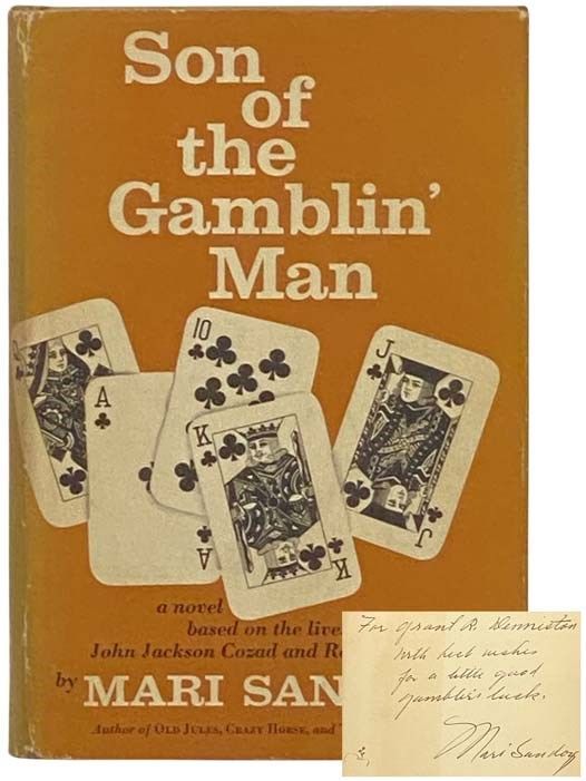 New York: Clarkson N. Potter, Inc, 1960. First Edition. Hard Cover. Very Good/Very Good. 8x5x1. Signed by author. First edition. Inscribed and signed with a small flower doodle by author on front endpaper ('For Grant R. Denniston, with best wishes for a little good gambler's luck. Mari Sandoz'). Jacket spine and edges faded, light stain on rear jacket panel along spine, ink date in different hand beneath inscription. 1960 Hard Cover. x, 333 pp. The story tells of the gambler and townsite promoter who founded Cozad, Nebraska, and of his family, particularly his younger son, [who] became a world-famous artist and teacher known as 'Robert Henri.' This tale is essentially Robert's story, the story of a sensitive talented boy growing up in the midst of frontier violence. But it is also the story of the ambitious promoter and of frontier people fighting hunger, cold, blizzards, drouths, grasshoppers, prairie fires, and ruthless cattlemen.