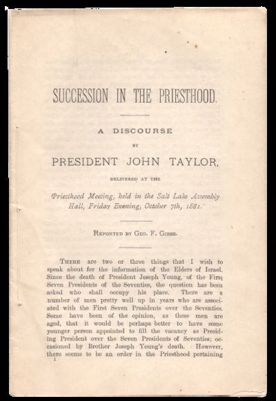 Succession in the Priesthood: A discourse by President John Taylor, delivered at the priesthood meeting, held in the Salt Lake Assembly Hall, Friday Evening, October 7th, 1881