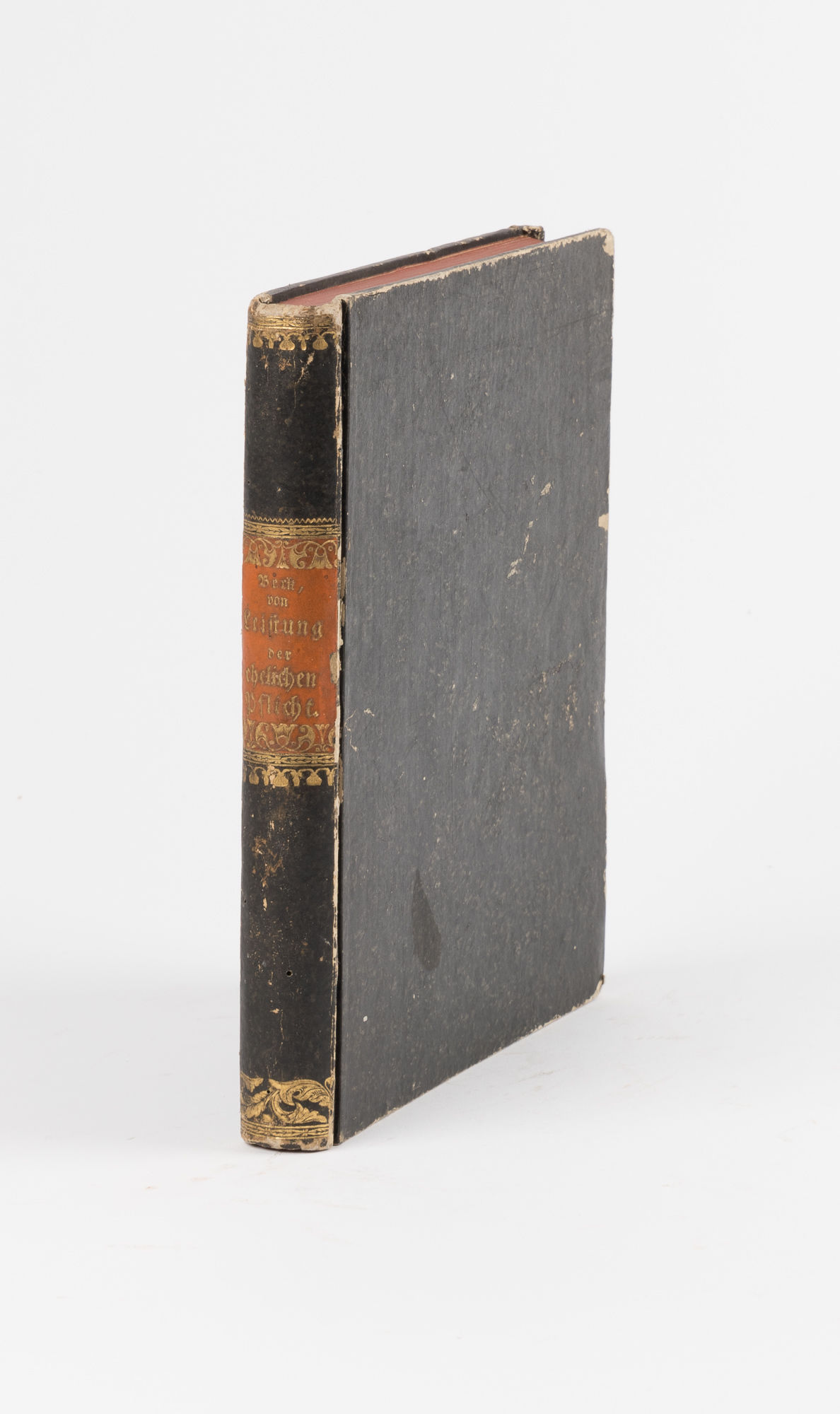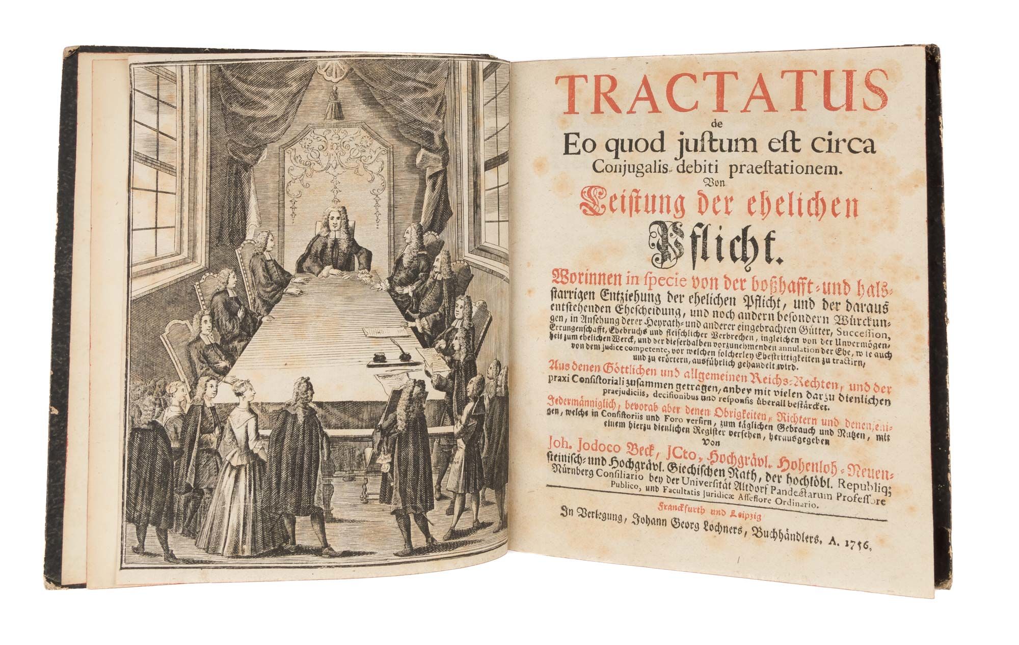 1756. Frankfurt & Leipzig, 1756. 4th & final edition. Frankfurt & Leipzig, 1756. 4th & final edition. Marriage and Divorce in the Eighteenth-Century Holy Roman Empire Beck, Johann Jodocus [1684-1744]. Tractatus de Eo Quod Justum est Circa Conjugalis Debiti Praestationem. Von Leistung der Ehelichen Pflicht. Worinnen in Specie von der Bosshafft- und Halsstarrigen Entziehung der Ehelichen Pflicht, Und der Daraus Entstehenden Ehescheidung, Und noch Andern Besondern Wurckungen, In Ansehung derer Heyrath- und Anderer Eingebrachten Gutter, Succession, Errungenschaft, Ehebruchs und Fleischlicher Verbrechen, Ingleichen von der Unvermogenheit zum Ehelichen Werck und der Dieserhalben Vorzunehmenden Annulation der Ehe, Wie auch von dem Judice Competente, Vor welchen Solcherley Ehestrittigkeiten zu Ractirn und zu Erotern, Ausfuhrlich Gehandelt Wird. Aus Denen Gottlichen und Allgemeinen Reichs-Rechten, Und der Praxi Consistoriali Zusammen Gerragen, Anbey mit Vielen darzu Dienlichen Praejudiciis, Decisionibus und Responsis Uberall Bestarcket. Jedermanniglich, Bevorab aber denben Obrigkeiten, Richtern und Denenjenigen, Welche in Consistoriis und Foro Versirn, Zum Taglich Gebrauch und Nutzen, Mit einen Hierzu Dienlichen Register Versehen. Frankfurt and Leipzig: In Verlegung, Johann Georg Lochners, Buchhandlers, 1756. [viii], 264, [20] pp. Engraved copperplate frontispiece depicting a marriage. Quarto (7-1/2" x 6-1/2"; 19.05 x 16.51 cm). Contemporary marbled boards, gilt fillets and calf lettering piece to spine. Light rubbing to boards, moderate rubbing to extremities, corners bumped and somewhat worn, edges rouged. Title page printed in red and black. Moderate toning to interior, somewhat heavier in places, light foxing to title page, later owner signature (Pannier) to front free endpaper. A handsome copy of a scarce title. $450. * Fourth and final edition. A practical treatise on the canon and Holy-Roman laws governing marriage and divorce and, to some extent, children. It devotes a good deal of attention to reasons for divorce, with an emphasis on adultery. Apparently a well-received work, it was first printed in 1733, with second and third editions in 1738 and 1741. All editions are scarce. OCLC locates 3 copies of the fourth edition in North American law libraries (Georgetown, Harvard, Yale). Das Verzeichnis Deutscher Drucke des 18. Jahrhunderts 12613037.