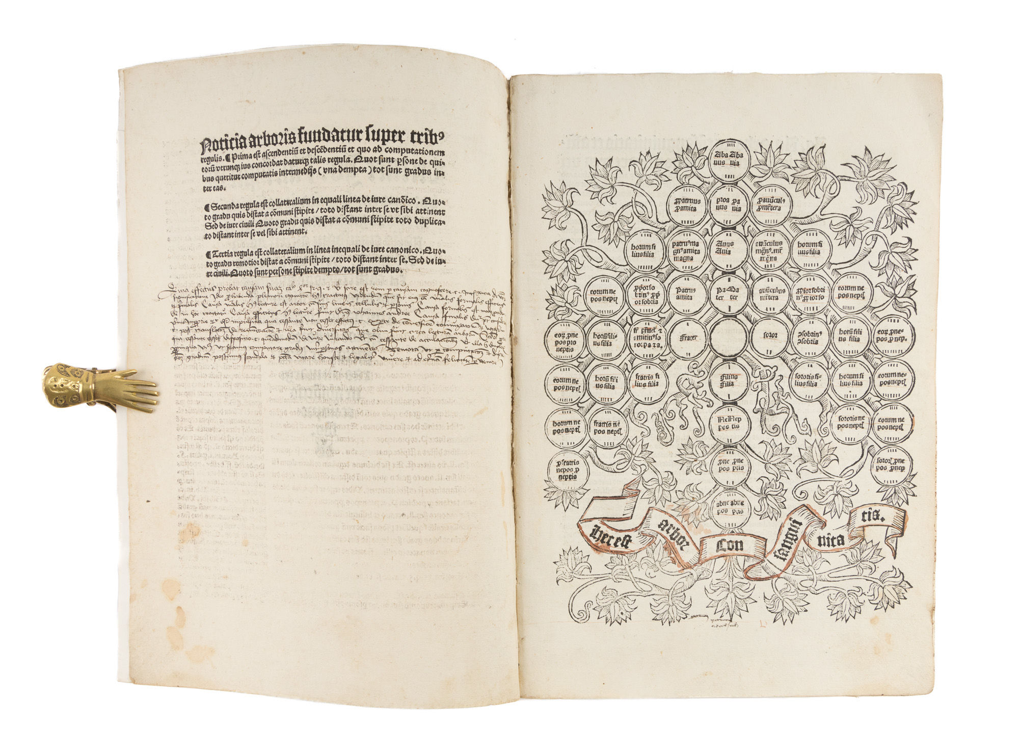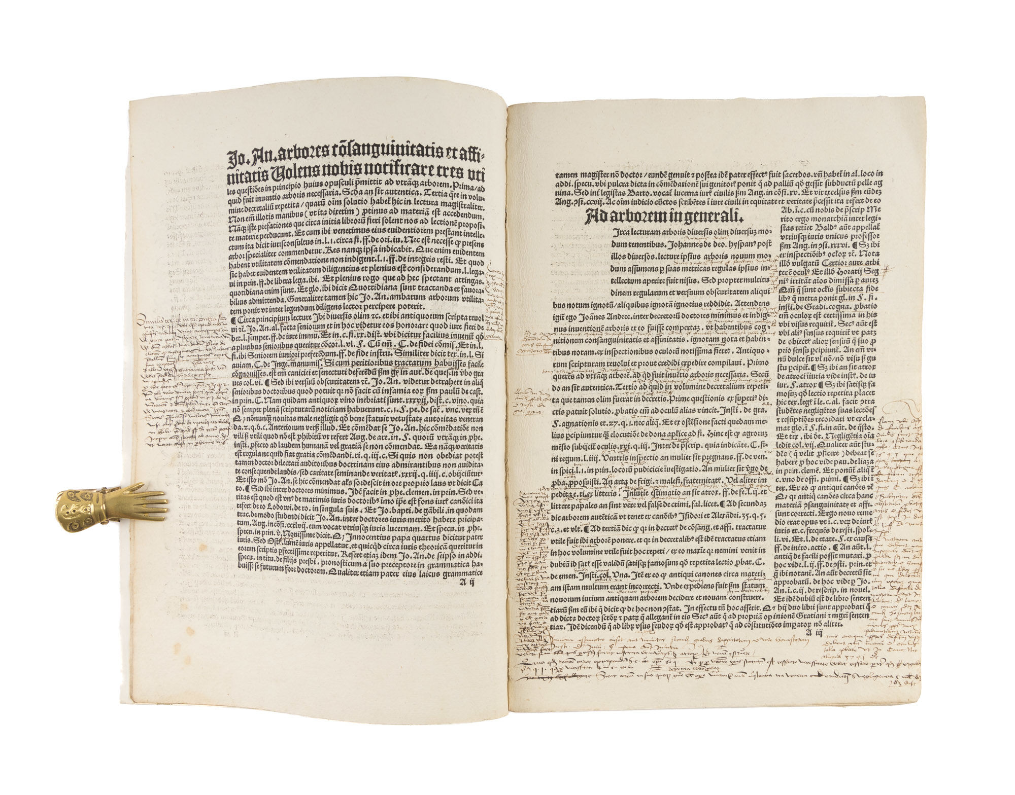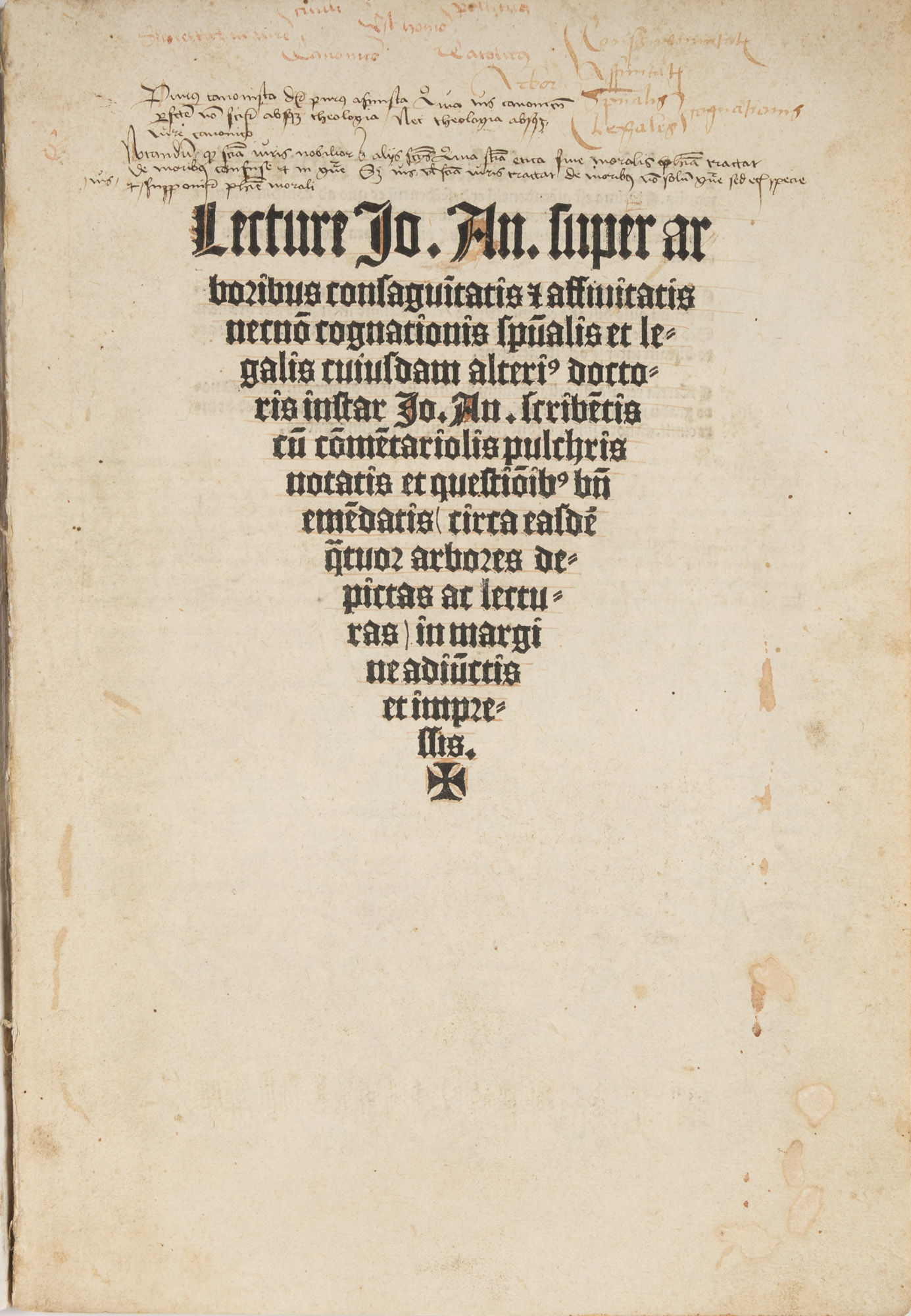 1511. [Leipzig: Impressum...per providu... 1511]. [Leipzig: Impressum...per providu... 1511]. A Fundamental Treatise on Family Relations Andrea, Giovanni d' [1275-1348]. [Greve, Henricus, Commentary]. Lecture Jo. An. Super Arboribus Consaguitatis [et] Affinitatis Necno[n] Cognationis Sp[irit]ualis et Legalis Cuiusdam Alteri[us] Doctoris Instar Jo. An. Scribe[n]tis cu[m] Co[m]me[n]tariolis Pulchris Notatis et Questio[n]ib[us] B[e]n[e] Eme[n]datis (Circa Easde[m] Q[ua]tuor Arbores Depictas ac Lecturas) In Margine Adiu[n]ctis et Impressis. [Leipzig: Impressum...per providu viru Baccalaureu Martinu Herbipolensem, 1511]. [18] ff. Five woodcut trees of consanguinity and affinity, two of which are full-page. Folio (11-3/4" x 8-1/4"). Twentieth-century patterned wrappers. Wrappers beginning to separate from text block but secure. Text in single column with linear gloss. Light toning to interior, occasional small stains and light soiling, tiny wormhole to outer margin of last ten leaves not affecting text, leaves C2-C5 (ff. [14-17]) detached, somewhat heavier toning and soiling and faint staining to final leaf, which has several mended tears with loss to text and final woodcut tree, early hand-coloring to first woodcut tree, annotations to first eight leaves in an early hand, a few affected by trimming at fore-edge. $1,950. * D'Andrea was an Italian canonist and professor of canon law at the University of Bologna. An eminent figure who received the highest tributes from Arithemius, Baldus, Forster and Bellarmin, his principal writings circulated widely in manuscript and were among the earliest printed works on canon law. The Super Arboribus is a fundamental treatise on degrees of consanguinity and affinity, also known as blood relations, and spiritual relationships created by godparents and their families. It was a work of vital importance in cases regarding estates, incest and conflicts of interest. It went through numerous manuscript and printed editions into the modern era. Our 1511 edition is the fifth of six printed by Leipzig printer Martin Landsberg [c.1455-1523] and features five attractive woodcut trees of consanguinity and affinity. The manuscript annotations appear to consist of both brief glosses and longer interpreta.