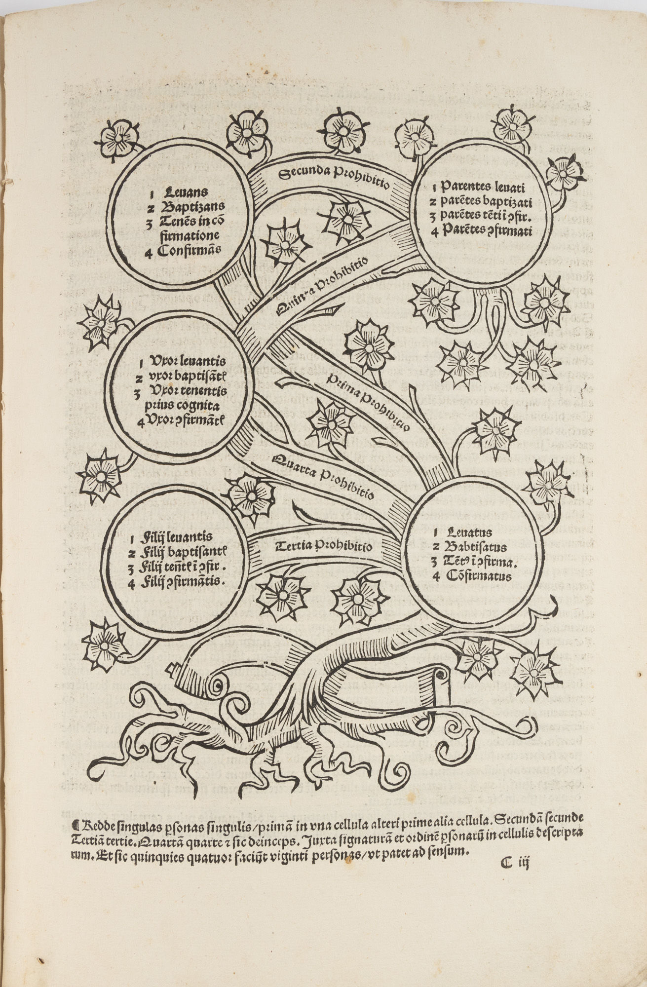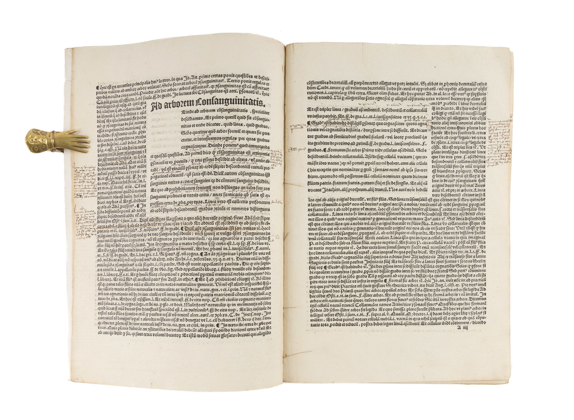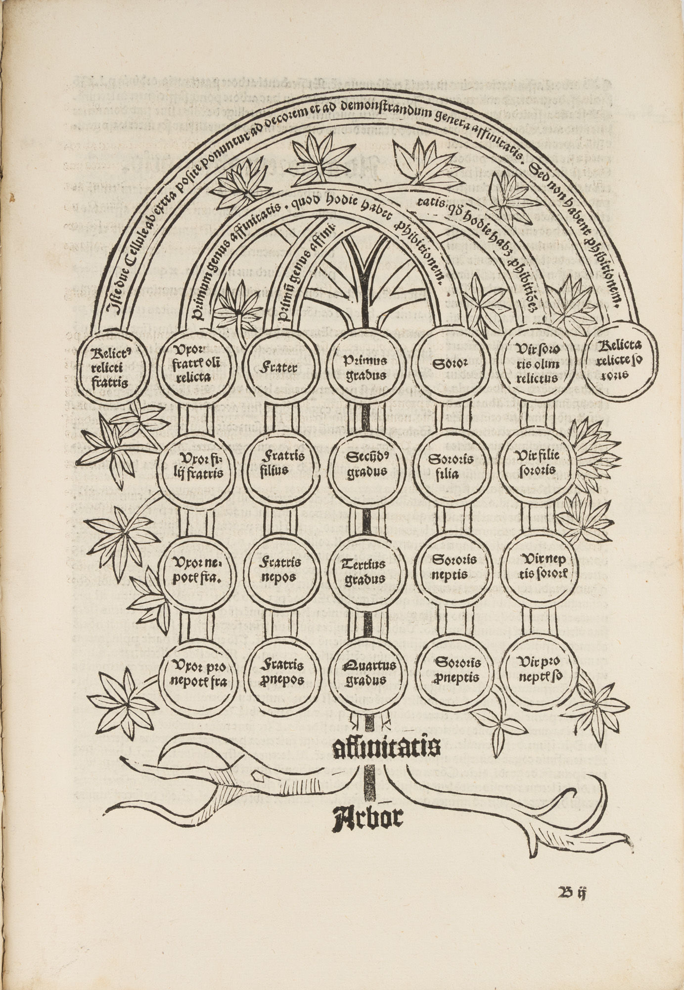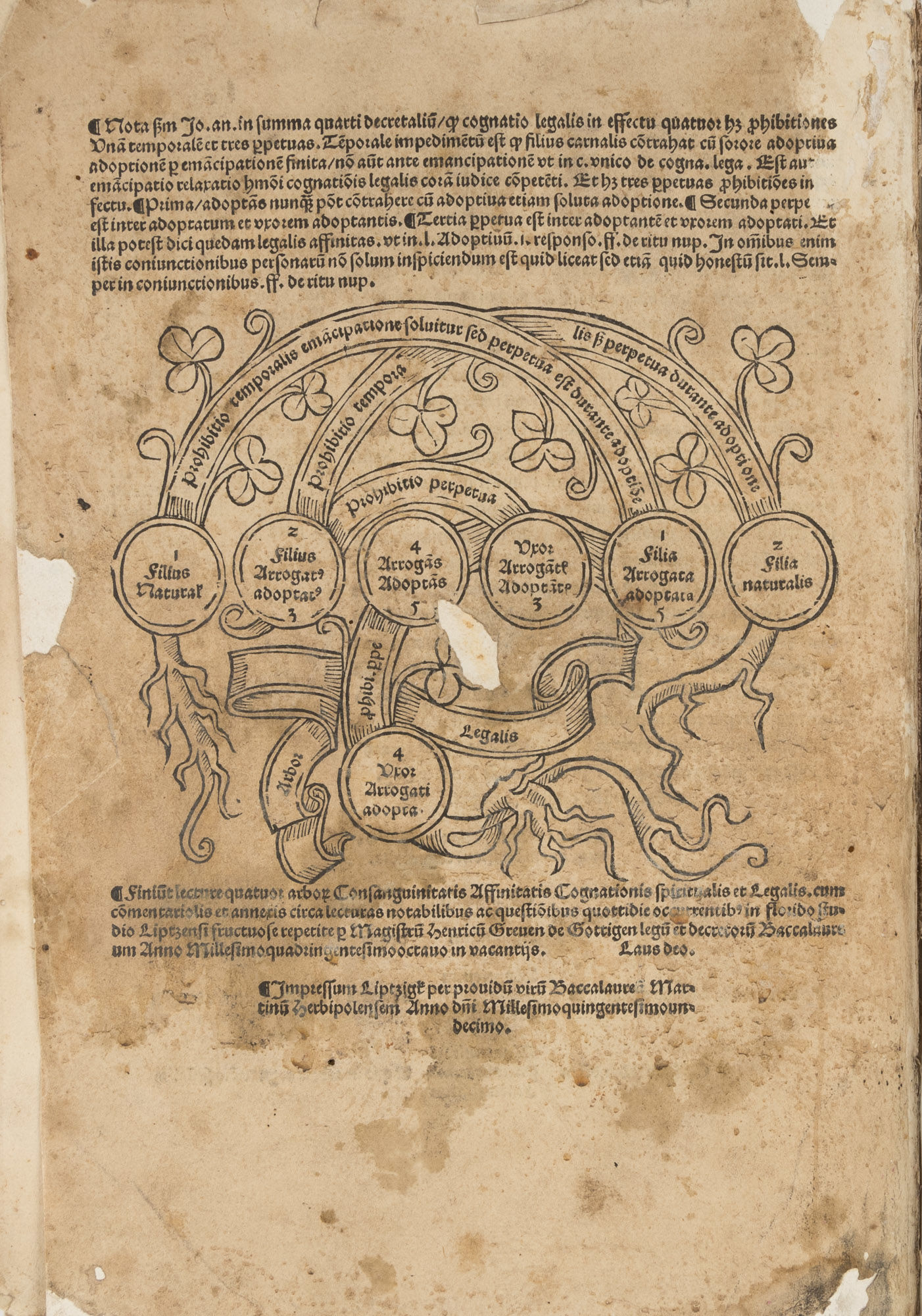 1511. [Leipzig: Impressum...per providu... 1511]. [Leipzig: Impressum...per providu... 1511]. A Fundamental Treatise on Family Relations Andrea, Giovanni d' [1275-1348]. [Greve, Henricus, Commentary]. Lecture Jo. An. Super Arboribus Consaguitatis [et] Affinitatis Necno[n] Cognationis Sp[irit]ualis et Legalis Cuiusdam Alteri[us] Doctoris Instar Jo. An. Scribe[n]tis cu[m] Co[m]me[n]tariolis Pulchris Notatis et Questio[n]ib[us] B[e]n[e] Eme[n]datis (Circa Easde[m] Q[ua]tuor Arbores Depictas ac Lecturas) In Margine Adiu[n]ctis et Impressis. [Leipzig: Impressum...per providu viru Baccalaureu Martinu Herbipolensem, 1511]. [18] ff. Five woodcut trees of consanguinity and affinity, two of which are full-page. Folio (11-3/4" x 8-1/4"). Twentieth-century patterned wrappers. Wrappers beginning to separate from text block but secure. Text in single column with linear gloss. Light toning to interior, occasional small stains and light soiling, tiny wormhole to outer margin of last ten leaves not affecting text, leaves C2-C5 (ff. [14-17]) detached, somewhat heavier toning and soiling and faint staining to final leaf, which has several mended tears with loss to text and final woodcut tree, early hand-coloring to first woodcut tree, annotations to first eight leaves in an early hand, a few affected by trimming at fore-edge. $1,950. * D'Andrea was an Italian canonist and professor of canon law at the University of Bologna. An eminent figure who received the highest tributes from Arithemius, Baldus, Forster and Bellarmin, his principal writings circulated widely in manuscript and were among the earliest printed works on canon law. The Super Arboribus is a fundamental treatise on degrees of consanguinity and affinity, also known as blood relations, and spiritual relationships created by godparents and their families. It was a work of vital importance in cases regarding estates, incest and conflicts of interest. It went through numerous manuscript and printed editions into the modern era. Our 1511 edition is the fifth of six printed by Leipzig printer Martin Landsberg [c.1455-1523] and features five attractive woodcut trees of consanguinity and affinity. The manuscript annotations appear to consist of both brief glosses and longer interpreta.