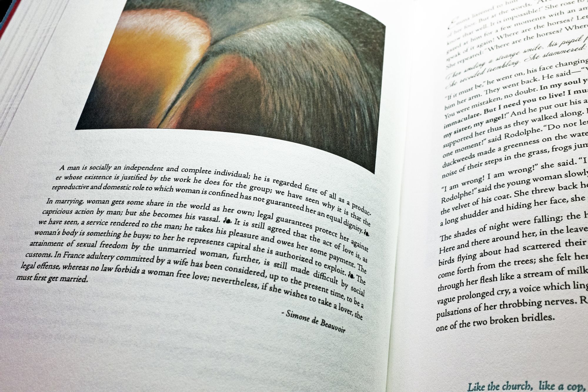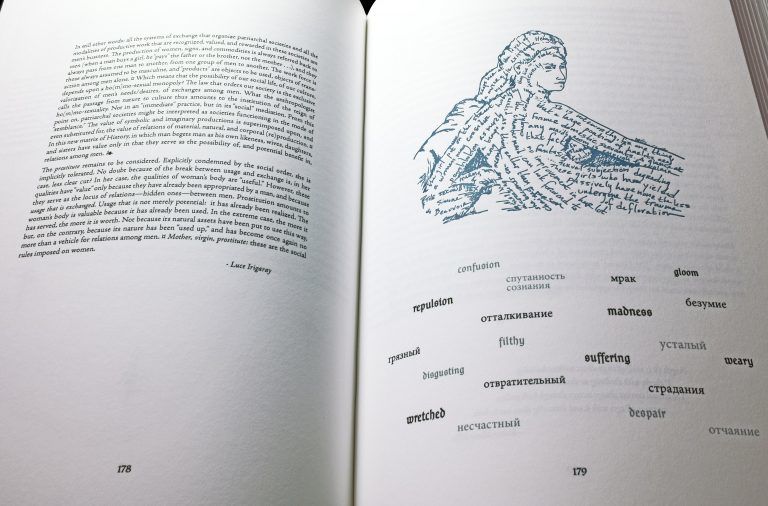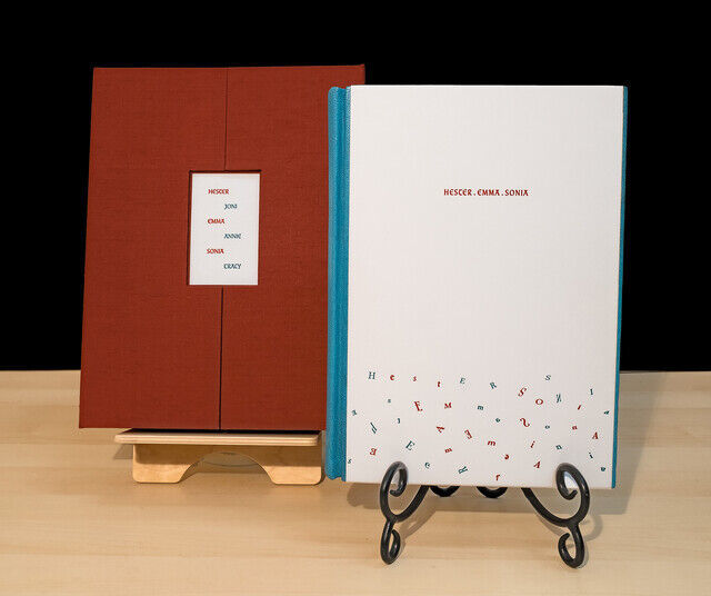 New York: Intima Press, 2021. Limited Edition. Hardcover. Fine in Fine Archival Box. Limited Edition. Hardcover. "Hester . Emma . Sonia is a feminist reading of the three literary classics. The volume gives voice to the main female characters, Hester Prynne, Emma Bovary, and Sonia Marmeladov, and presents multiple voices in dialogue. The subtitle, Joni . Annie . Tracy, highlights contemporary singer-songwriters Joni Mitchell, Annie Lennox, Tracy Chapman and other favored musical artists including Janis Joplin, Etta James, Leon Russell, Paul Simon, Mary J. Blige, Laurie Anderson, and others, whose poetic lyrics provide commentary in the margins. Text of philosophers, writers, and poets such as Simone de Beauvoir, Virginia Woolf, Karen Horney, Jean-Paul Sartre, Julia Kristeva, Rainer Maria Rilke, William Blake, and Arthur Rimbaud, are incorporated into brilliant typographical designs, deconstructing the original narratives. A selection of text is in Latin, French, and Russian. Numerous reproductions of artworks: paintings, drawings, and photographs from earlier in the Artist’s 40-year oeuvre, along with recent drawings and calligrams, adorn the pages. Additional references are made to contemporary issues including Covid-19 and Black Lives Matter protests. The three sections are abridged and combined into one volume, reframed to create a critical dialog in the 21st-century. The resulting layered narrative recontextualizes the stories, bringing additional voices to the fore." [artist statement]. Tight, bright, and unmarred. Standard edition aqua blue leather spine with letterpress printed paper cover boards, custom box in red cloth with unique center opening, printed and designed by Mindy Belloff, sewn and bound by Celine Lombardi. Small 4to. Limited edition of 32 (26 Standard; 6 Deluxe), signed by the artist.