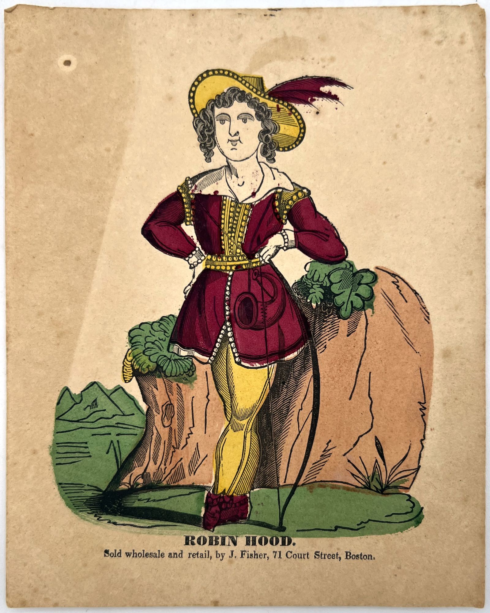 Boston, Massachusetts: J. Fisher, 1850. Good. Toned, spotting, sunning. Later signature of Rachel A. Snyder to verso.. A charming piece of hand-colored job printing for children by the Boston printer James Fisher. Depicts Robin Hood in a dashing red jacket and hat against a rural background. James Fisher was an early American children's publisher who operated out of 71 Court Street between 1838 and 1860. Children's publishing did not become a fully fledged field in the industry until the latter half of the 19th century. Measures approx. 6.25" by 5.25". Hand colored.