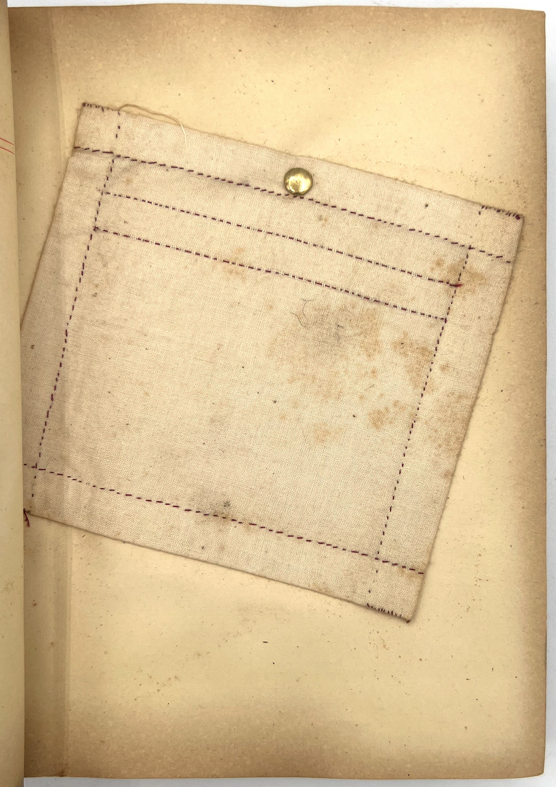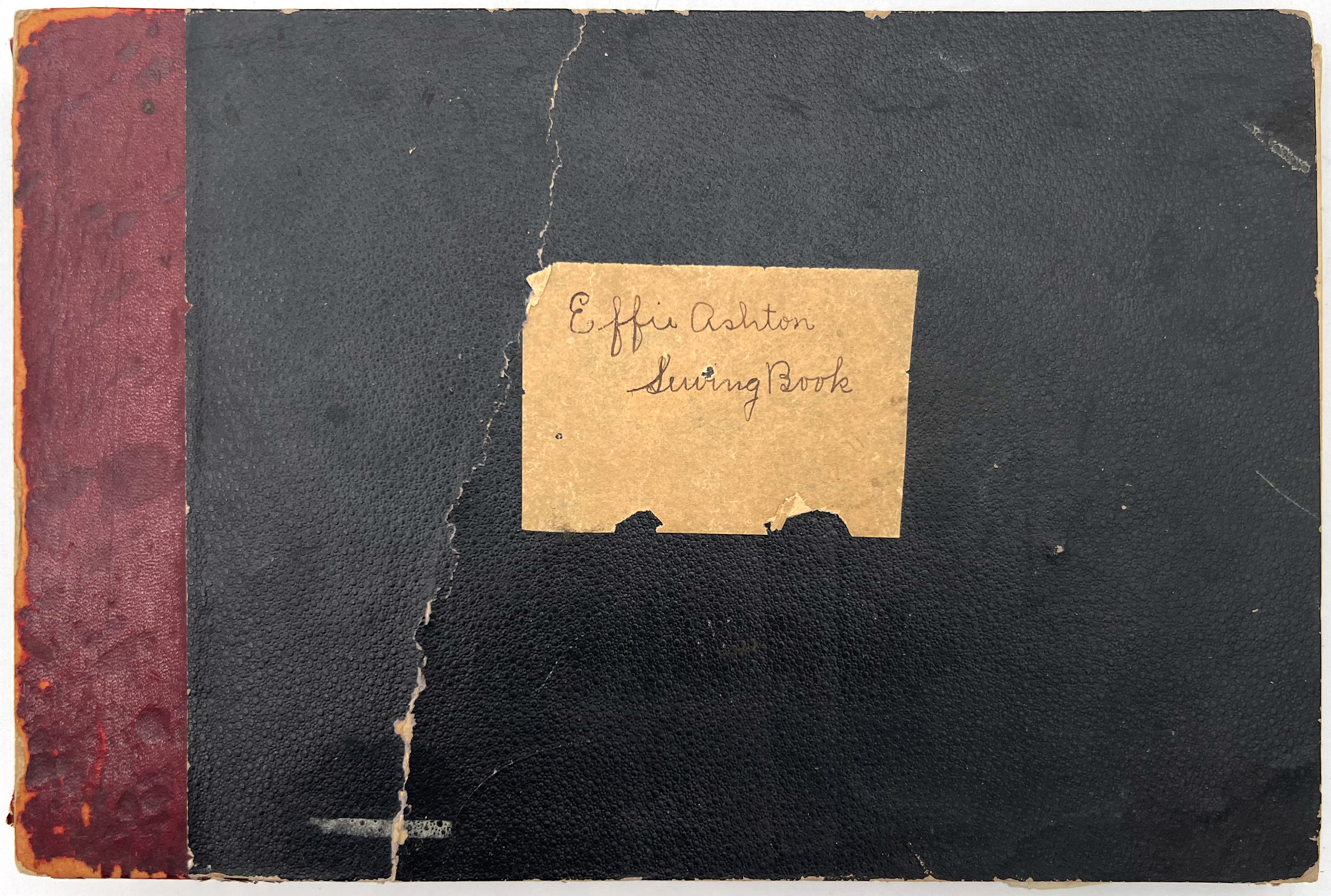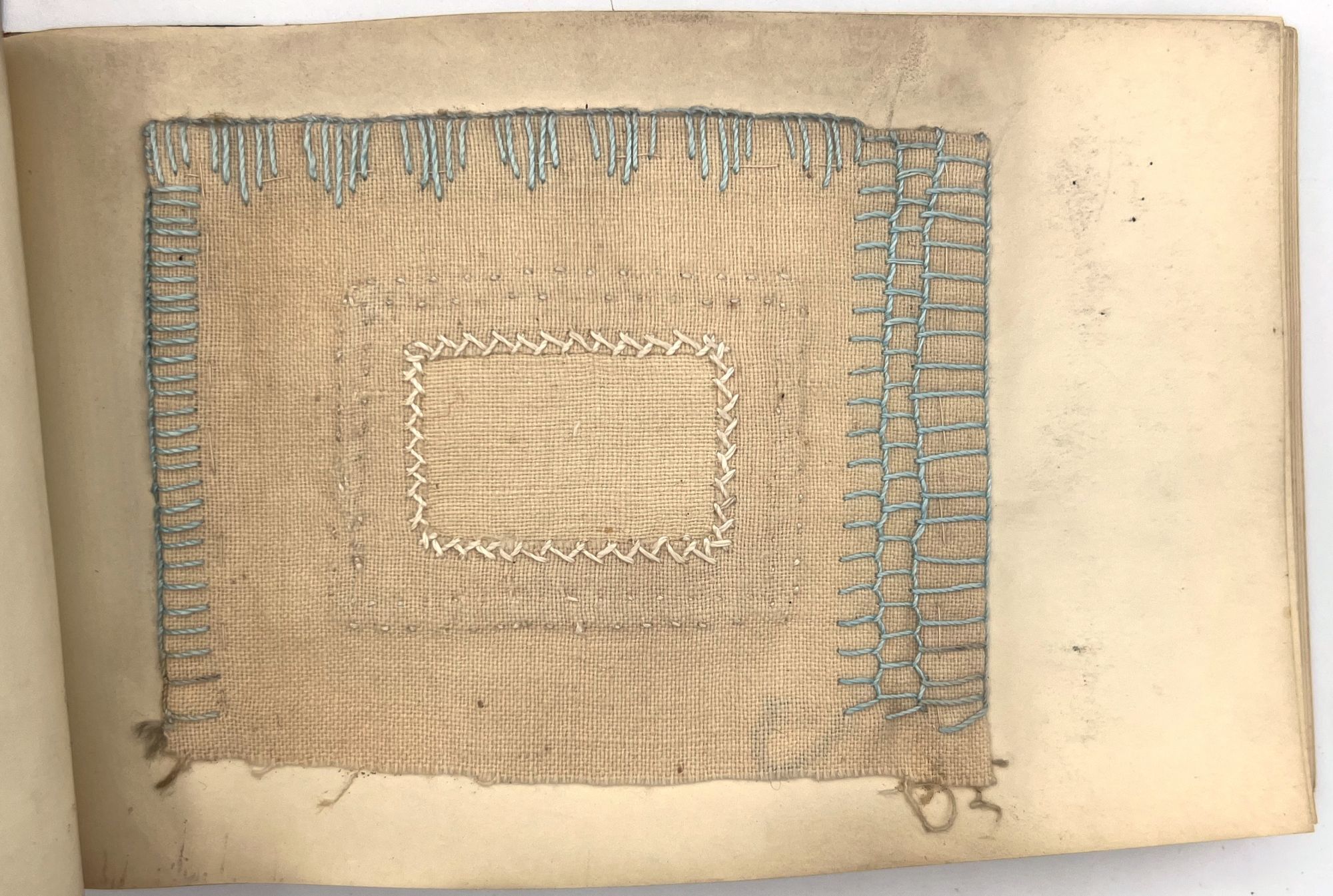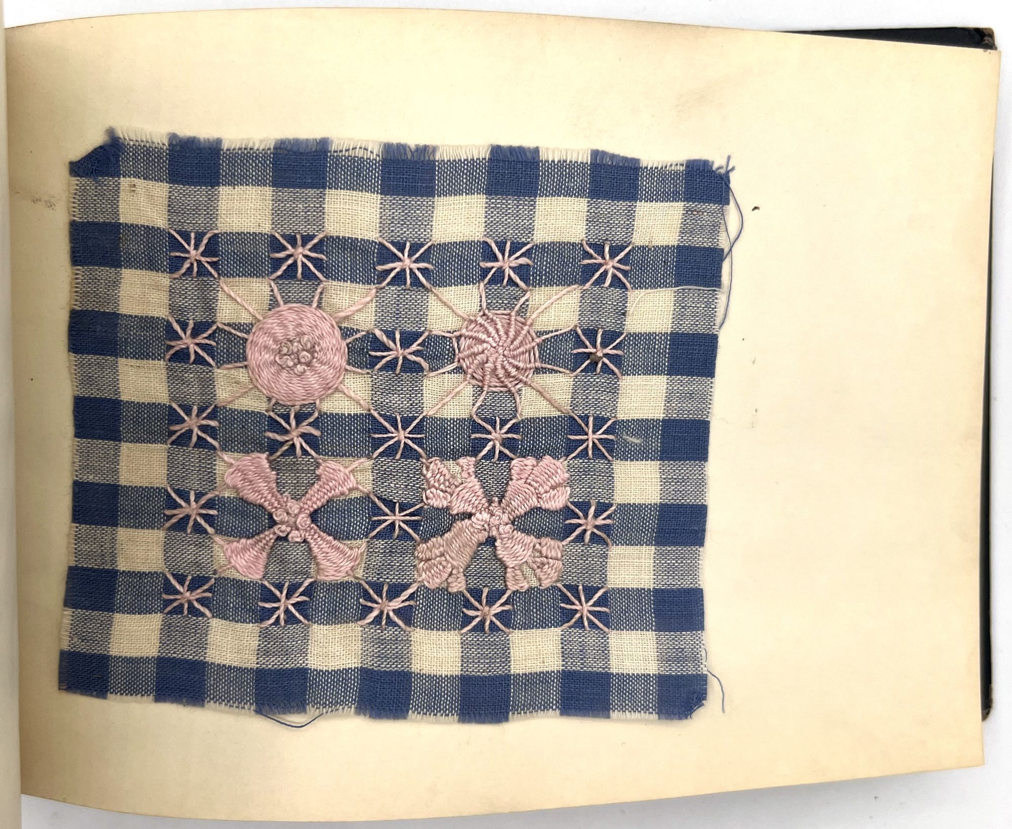 United States, 1900. Good. Bindings worn, upper board of one book detached with damage, spine missing on other. Toning, dust soiling.. Album of sewing samples by Effie Ashton. United States, c.1900. Oblong 8vo (5.75" by 9.25"), approx. 50 blank leaves sewn in original decorated paper covered boards backed in red sheep, manuscript paper label to upper board. Contains 2 pp. of manuscript class notes, and approx. 25 samples of sewing and embroidery. The notes a narrative eon cloth and its uses and Selvedge and Bias and their significant and information on warp and woof. Techniques/features include: basic running stitch/back stitch; hemming and tucks; basting and overhanding; gathering; gussets; buttons; patching; herringbone stitch; stocking darning; machine running stitch; seaming; quilting; "fancy work" (i.e. embroidery); drawn work. Each example is numbered 1 - 25 with a brief narrative verso. Fine workmanship. The student was awarded an "A" for the collection.