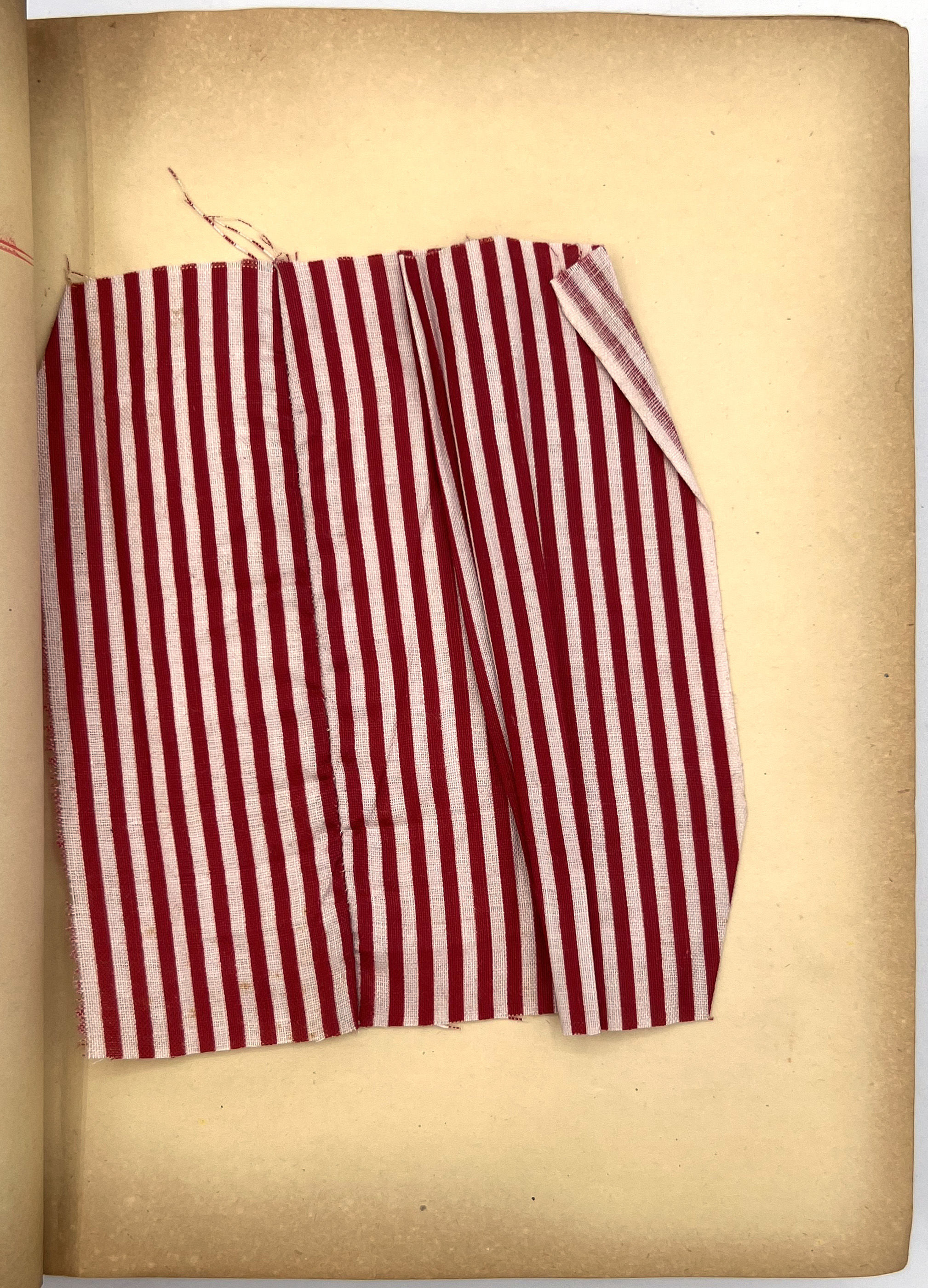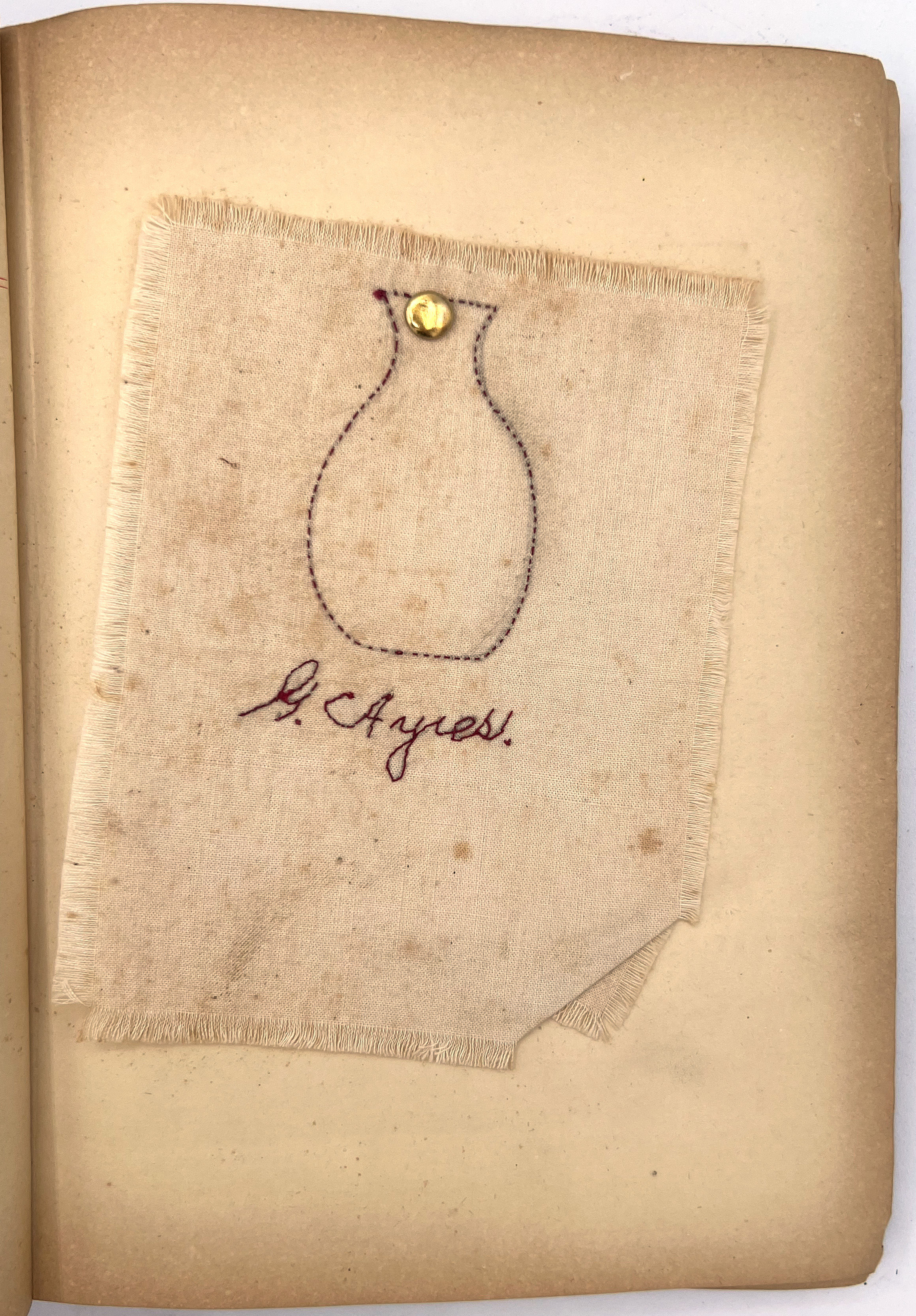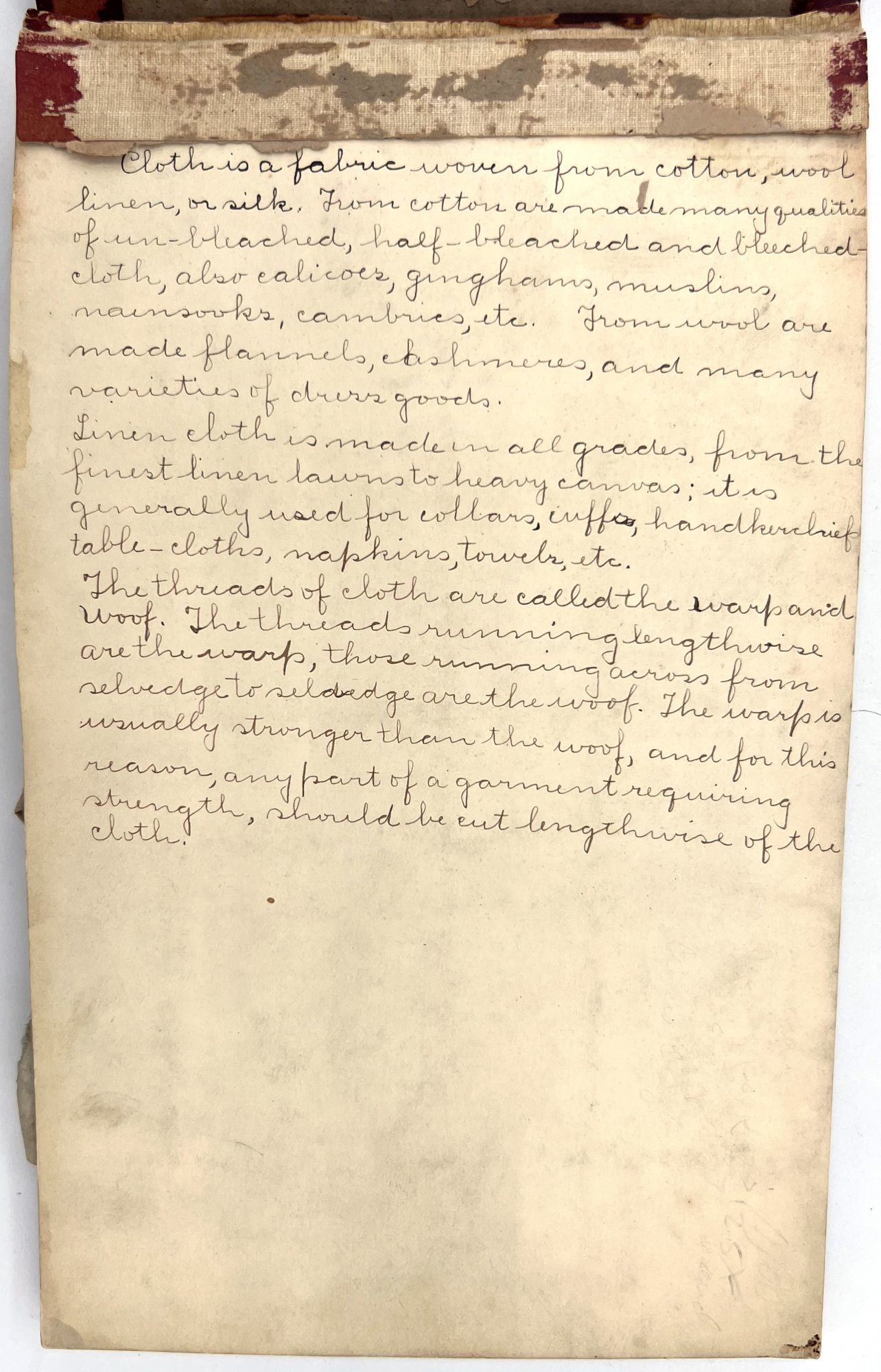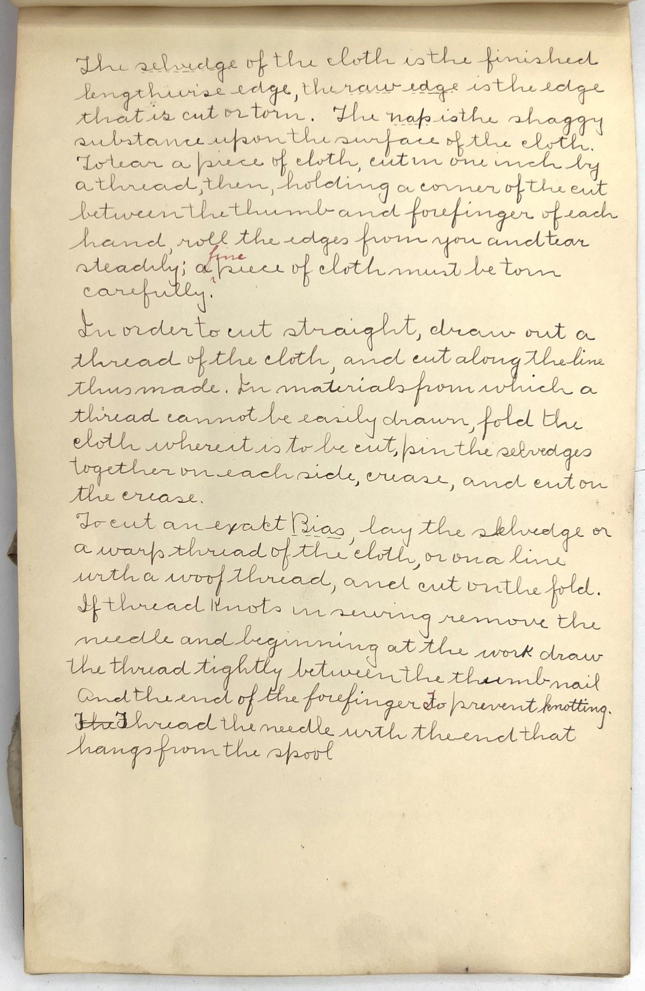 United States, 1900. Good. Bindings worn, upper board of one book detached with damage, spine missing on other. Toning, dust soiling.. Album of sewing samples by Effie Ashton. United States, c.1900. Oblong 8vo (5.75" by 9.25"), approx. 50 blank leaves sewn in original decorated paper covered boards backed in red sheep, manuscript paper label to upper board. Contains 2 pp. of manuscript class notes, and approx. 25 samples of sewing and embroidery. The notes a narrative eon cloth and its uses and Selvedge and Bias and their significant and information on warp and woof. Techniques/features include: basic running stitch/back stitch; hemming and tucks; basting and overhanding; gathering; gussets; buttons; patching; herringbone stitch; stocking darning; machine running stitch; seaming; quilting; "fancy work" (i.e. embroidery); drawn work. Each example is numbered 1 - 25 with a brief narrative verso. Fine workmanship. The student was awarded an "A" for the collection.