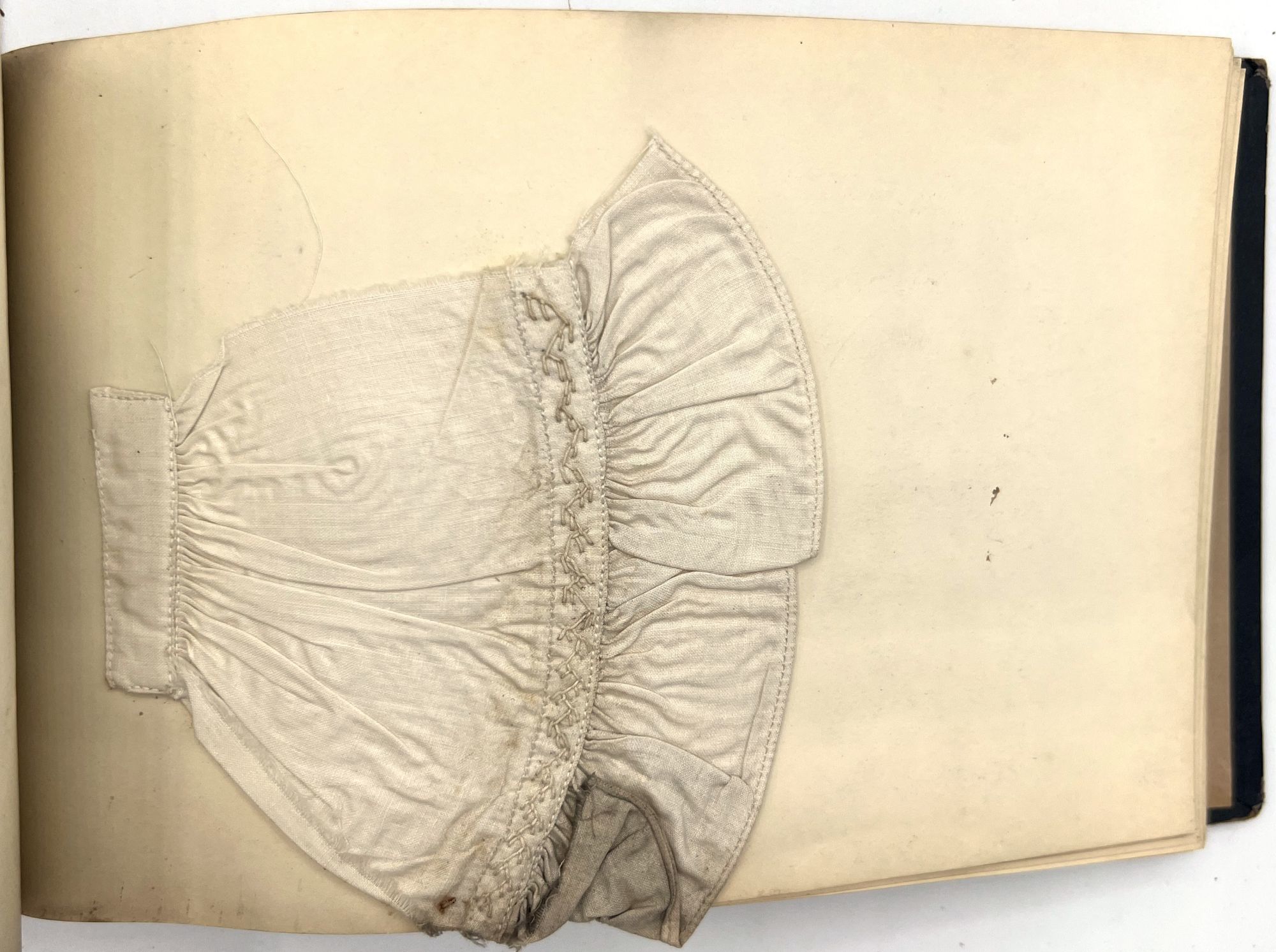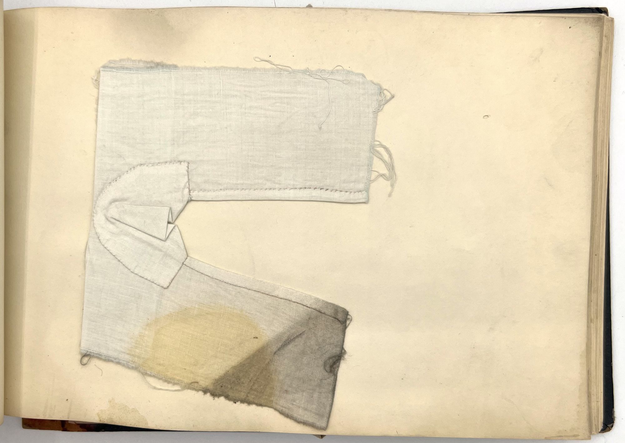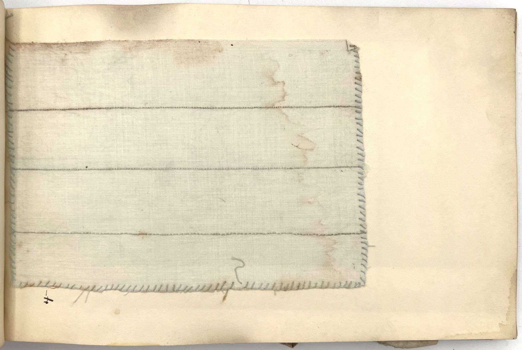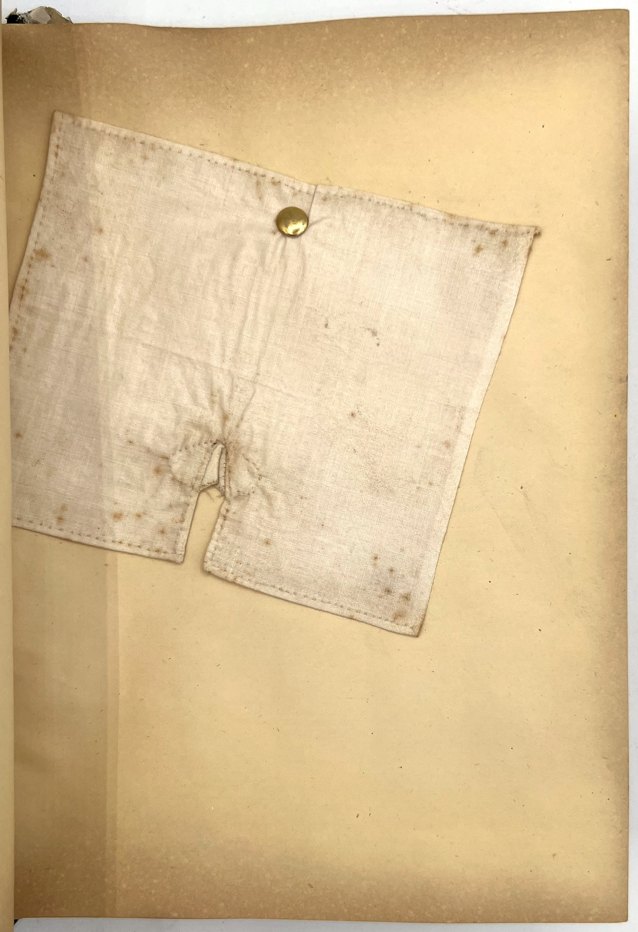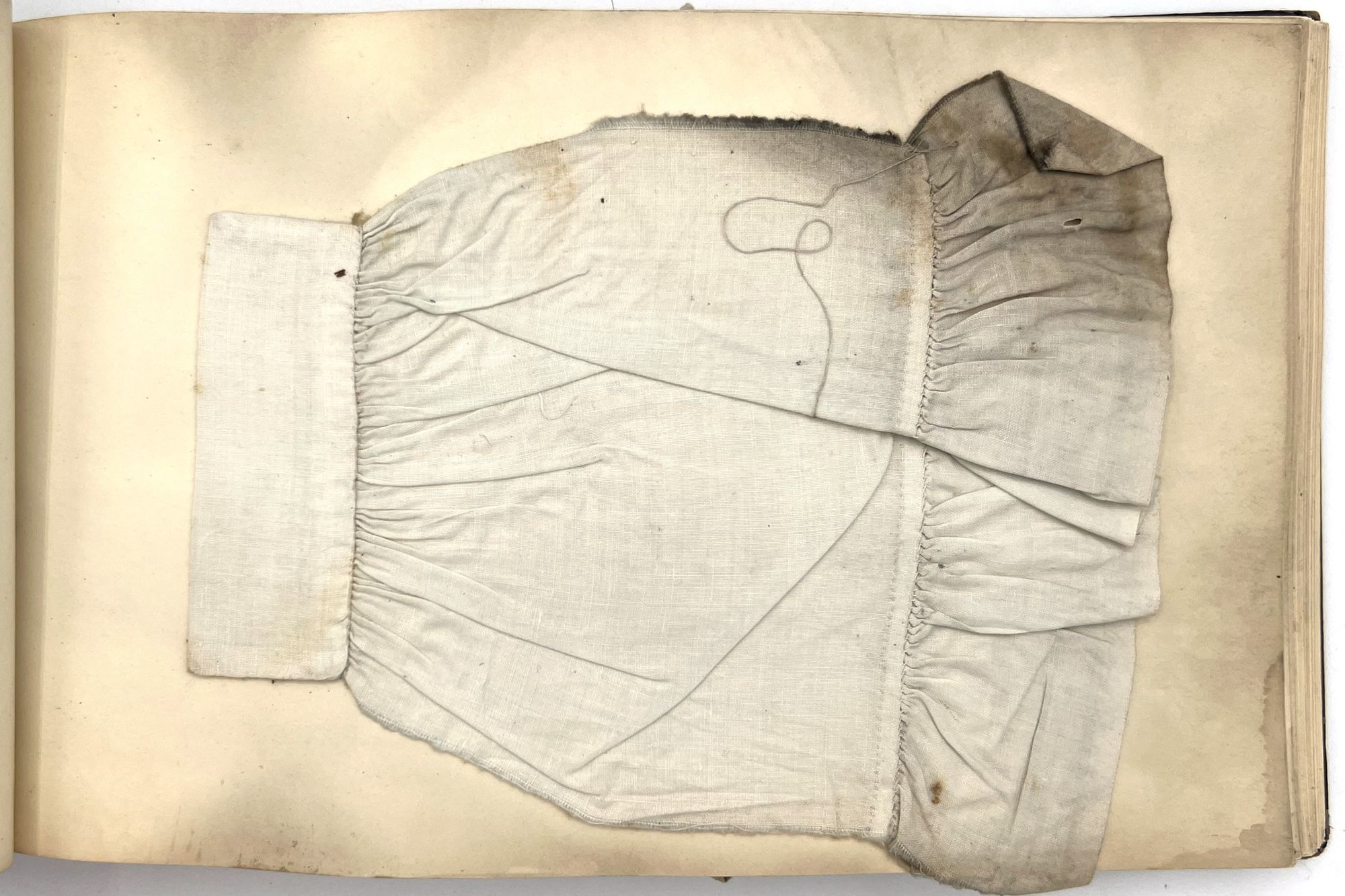 United States, 1900. Good. Bindings worn, upper board of one book detached with damage, spine missing on other. Toning, dust soiling.. Album of sewing samples by Effie Ashton. United States, c.1900. Oblong 8vo (5.75" by 9.25"), approx. 50 blank leaves sewn in original decorated paper covered boards backed in red sheep, manuscript paper label to upper board. Contains 2 pp. of manuscript class notes, and approx. 25 samples of sewing and embroidery. The notes a narrative eon cloth and its uses and Selvedge and Bias and their significant and information on warp and woof. Techniques/features include: basic running stitch/back stitch; hemming and tucks; basting and overhanding; gathering; gussets; buttons; patching; herringbone stitch; stocking darning; machine running stitch; seaming; quilting; "fancy work" (i.e. embroidery); drawn work. Each example is numbered 1 - 25 with a brief narrative verso. Fine workmanship. The student was awarded an "A" for the collection.