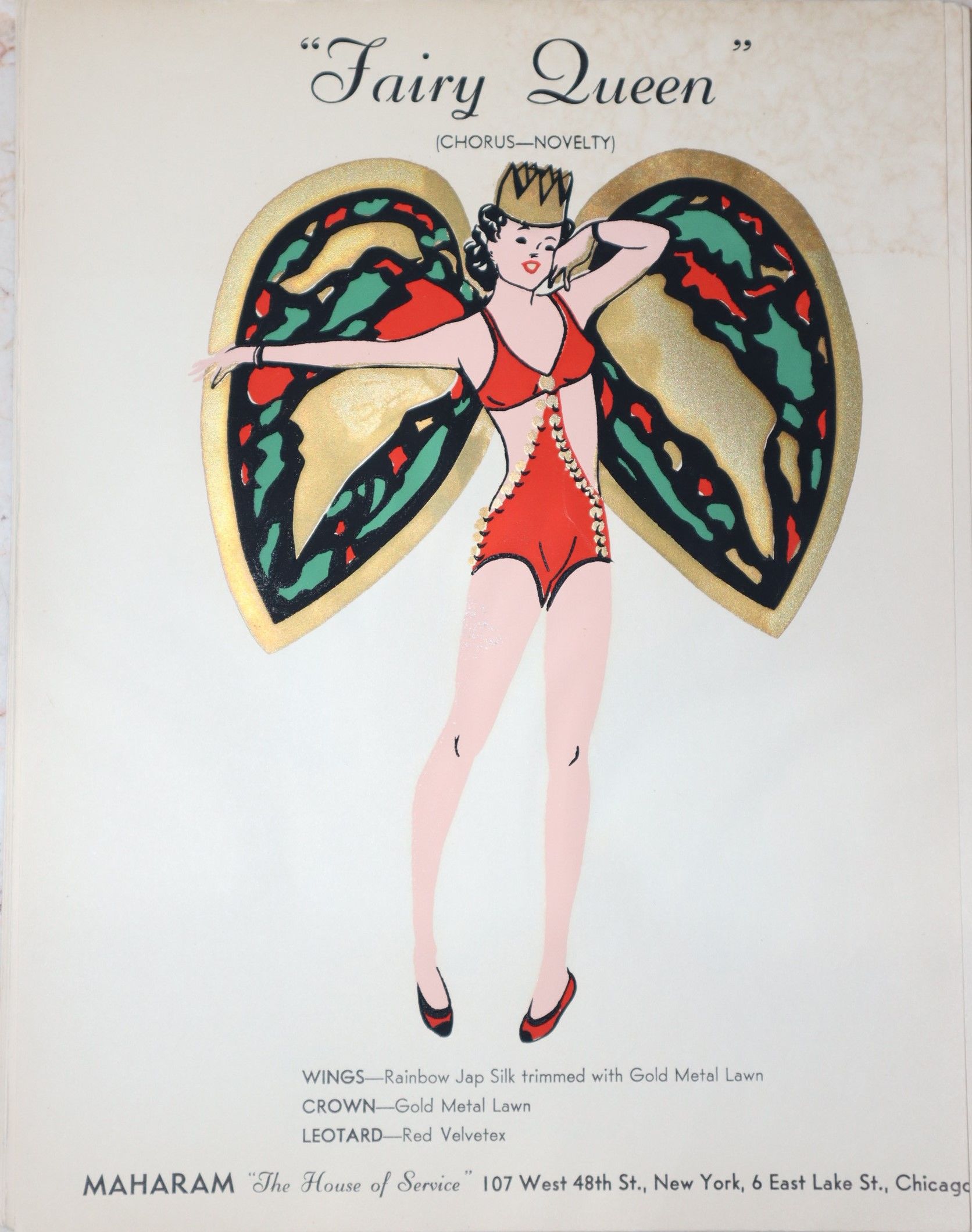 New York, 1940. Envelope. Very Good. N.d., circa 1940s. 40 color plates, unbound, as issued, promoting the company's line of costumes for chorus girls. Costumes are full of whimsy, and of course, suggestiveness, to complement the fetching figures of chorines, and as befitting chorus line-ups of the day. Costumes are given evocative, and sometimes provocative names, and ones which might not pass muster with more modern notions of correctness: "Hot Stuff", "Musical Comedy", "Aloha", "Miss America", "Coolie", "Oriental", "Little Hollander", etc. etc. One costume is named "Novelty Costume", of all things, as if that term didn't apply to the vast majority of other designs equally. Presumed complete. Leaves, 28 by 21 cm, with envelope slightly larger. No numbering to the plates or leaves. Coloring process is stencil or pochoir. The colors actually are slightly raised off the page, which would suggest color printing was not employed. Captioning lists the garments being modeled and imparts a few words describing of what they are made. Also, under the costume titles are parentheticals in which a type of dance or dancing is suggested as befitting the costume and the imaginary model. The designs speak to forms of entertainment, vaudeville, burlesque, variety, musical cabaret, etc., once ubiquitous and mainstream, now far scarcer, other than in Las Vegas perhaps, and to a species of entertainer, the "showgirl", no longer encountered. The elaborate costumes speak to the importance of fantasy and escape to the chorines' acts. It wasn't just about shapely young women who could shimmy and high kick. The series is scarce -- no institutional holdings of this folio found on OCLC First Search, and two holdings of the company's 1939 catalogue issued in conjunction with the 1939 New York World's Fair, but this earlier publication was both not identical and also a bit smaller, with 36 plates -- this earlier issue held by Penn State and U. of Montreal. Condition: the outer portfolio is in fragile, delicate condition, with chipping and loss by the vertical folds and some unattractive repairs using scotch tape in these areas. The portfolio has additional closed tearing, etc. However, its visual content -- the black and gold collaging of choriines in a wide selection of costumes -- has survived uncompromised.