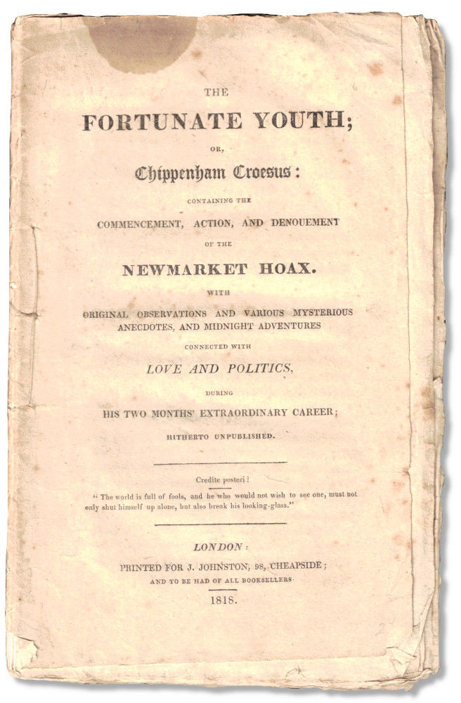 The Fortunate Youth; or, Chippenham Croesus: Containing the Commencement, Action, and Denouncement of the Newmarket Hoax. With Original Observations and Various Mysterious Anecdotes, and Midnight Adventures Connected With Love and Politics, During His Two Months' Extraordinary Career, Hitherto Unpublished