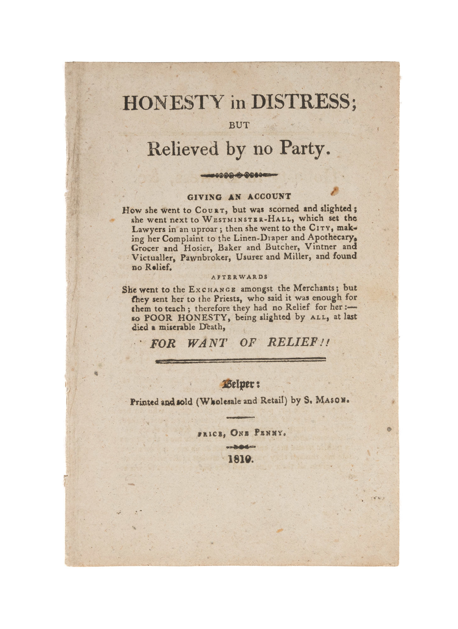 1810. Unrecorded.. Unrecorded. Honesty Scorned by Lawyers: An Unrecorded Provincial Imprint [Ward, Edward (1667-1731)]. Honesty in Distress; But Relieved by No Party. Giving an Account How She Went to Court, But was Scorned and Slighted; She Went Next to Westminster-Hall, Which Set the Lawyers in an Uproar; Then She Went to the City, Making Her Complaint to the Linen-Draper and Apothecary, Grocer and Hosier, Baker and Butcher, Vintner and Victualler, Pawnbroker, Usurer and Miller, And Found No Relief. Afterwards She Went to the Exchange Amongst the Merchants; But They Sent Her to the Priests, Who Said it was Enough for Them to Teach; Therefore They had No Relief for Her:- So Poor Honesty, Being Slighted by All, At Last Died a Miserable Death, For Want of Relief!! Belper: Printed and sold (Wholesale and Retail) by S. Mason, 1810. 8 pp. Octavo (7" x 4-1/2"). Disbound stab-stitched pamphlet. Moderate toning, occasional light soiling and very small stains. Rare. $450. * Later edition. Edward (Ned) Ward was a prolific satirist. "Though vulgar and often grossly coarse, his writings throw considerable light on the social life of the time of Queen Anne," particularly the slang and vernacular of the time (DNB). Honesty in Distress, a dramatic work first published in 1705, portrays Honesty as a young woman seeking relief but spurned by all parties as a "mumping, ragged, idle Varlet" (among other epithets). Even by the eminent lawyers of Westminster Hall, she is dismissed as a "saucy slut" with "no business here." Our 1810 edition from a Derbyshire press is unrecorded. No copies located on OCLC or Library Hub. Dictionary of National Biography 59:312.