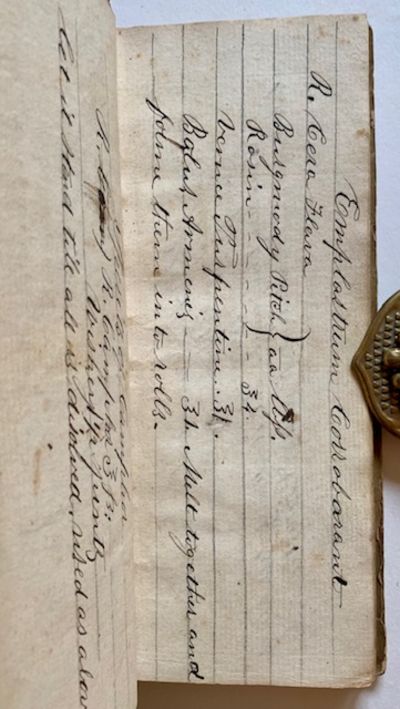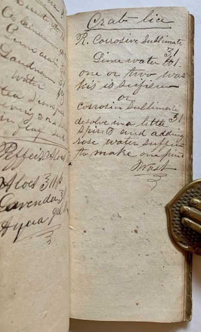 York, PA, 1849. 1/4 leather. Very Good -. The handwritten medical notebook of Dr. Francis Abram Kiesland Koch of York. PA, dated January 29, 1849. A graduate of Maryland University, Dr. Koch created this one-of-a-kind book offering a variety of medicines and homeopathic solutions to treat tooth pain, diarrhoera, hair loss, gout, and sexually transmitted diseases such as gonorrhea, crab-lice, and the clap. The occasional horse care and food recipe is also included. Eminently legible in the Doctor's elegant script. 12mo, bound in its original 1/4 calf over light-brown boards, which show forgiveable spotting and wear. The binding, while delicate (given its age), is still solid and firm. 12mo, just shy of 50 pgs. A nice piece of Americana and an impressive example of a 19th century collection of medical cures and treatments.