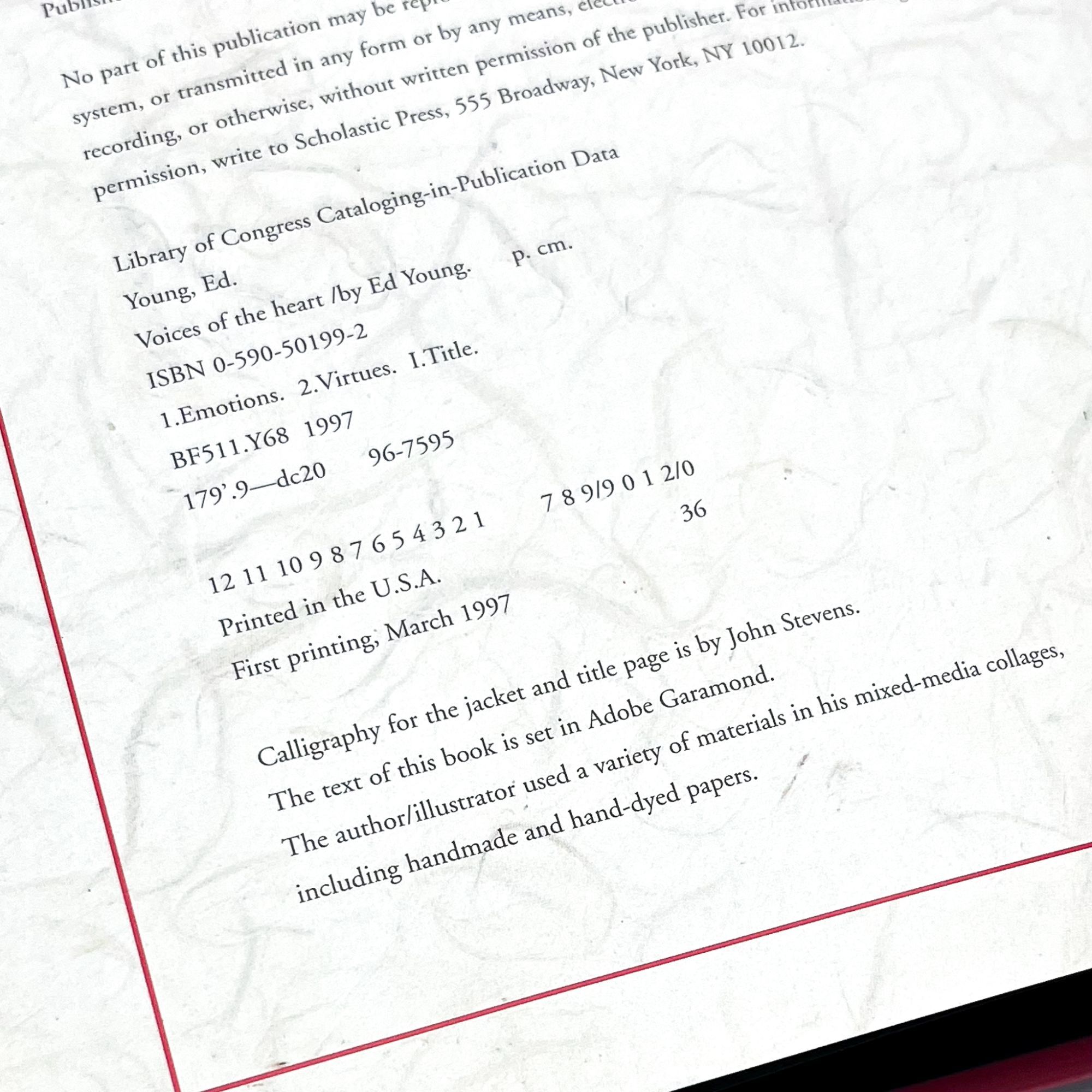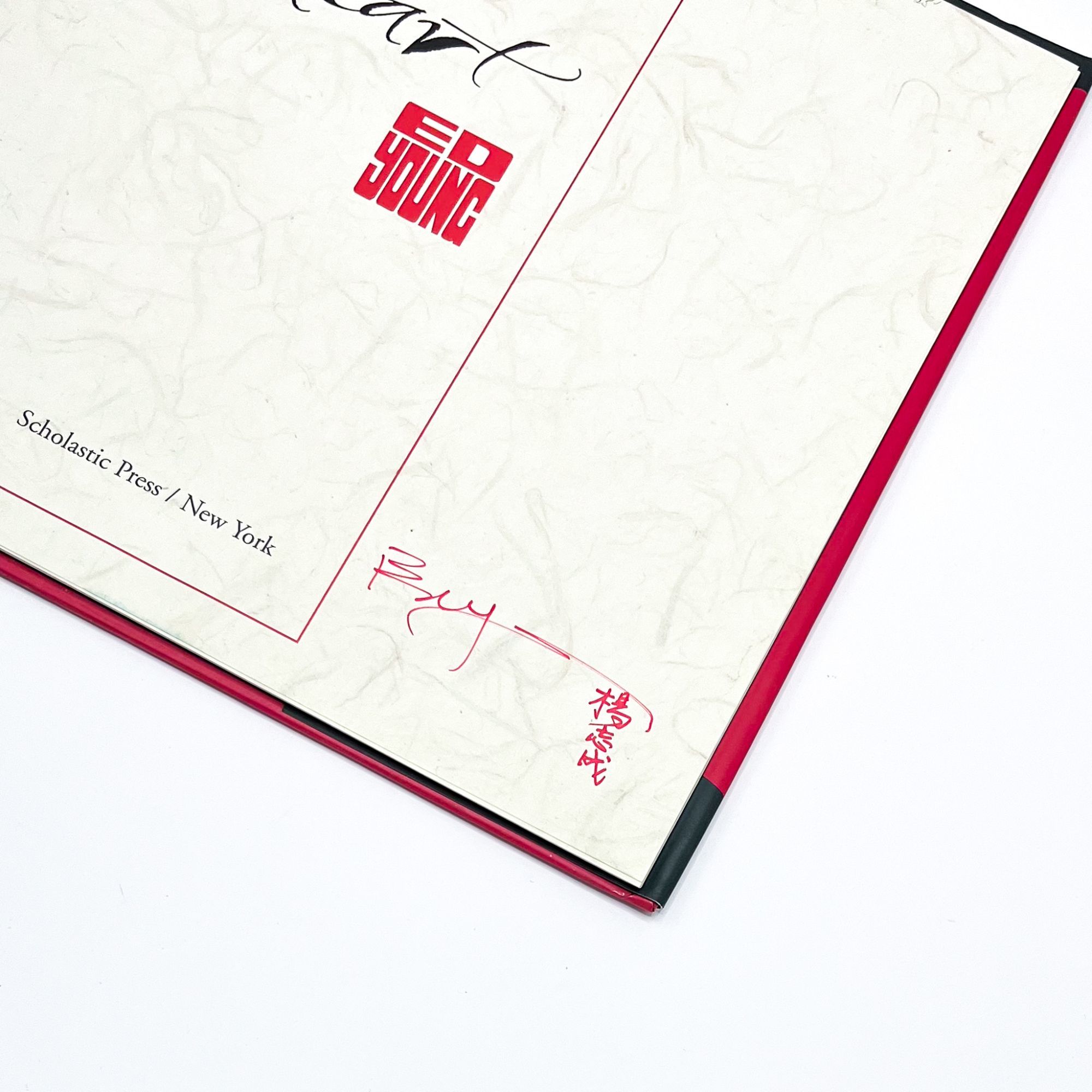 New York: Scholastic Press, 1997. First edition. Fine in near fine dust jacket.. Signed first printing of this beautiful exploration of the forms of 26 Chinese characters for feelings and emotions. Ed Young entered the world of illustration as a commercial artist, and this background in compelling visual storytelling is evident in all his books. Over his long career, he has earned two Caldecott Honors and two nominations for the prestigious Hans Christian Andersen Award. 10'' x 12''. Original red boards. Original unclipped ($17.95) color pictorial dust jacket. Illustrated in color. [32] pages. Signed by Young to title page in Chinese and Latin characters. Jacket with mild wear, a bit of sunning to spine. Binding with a hint of edgewear. Bright.